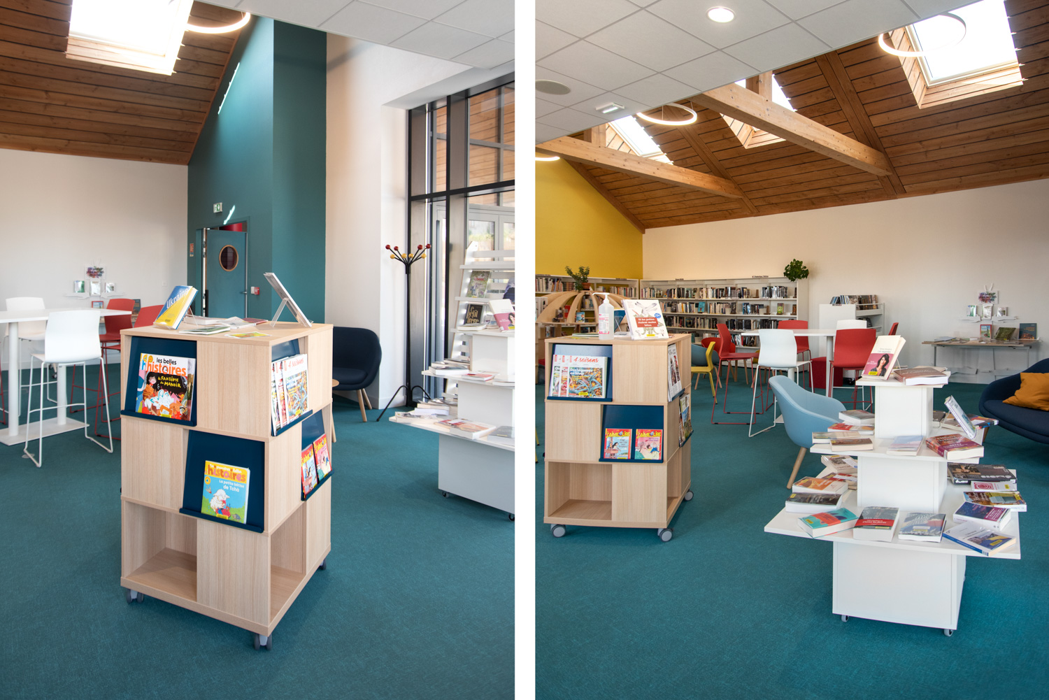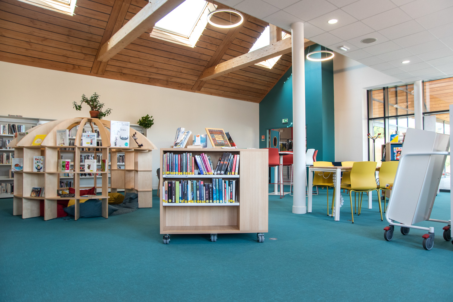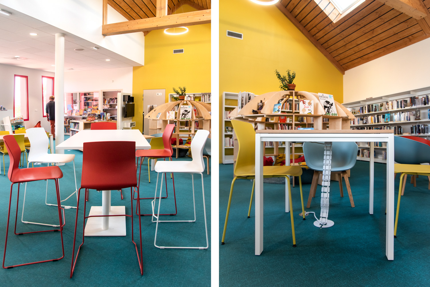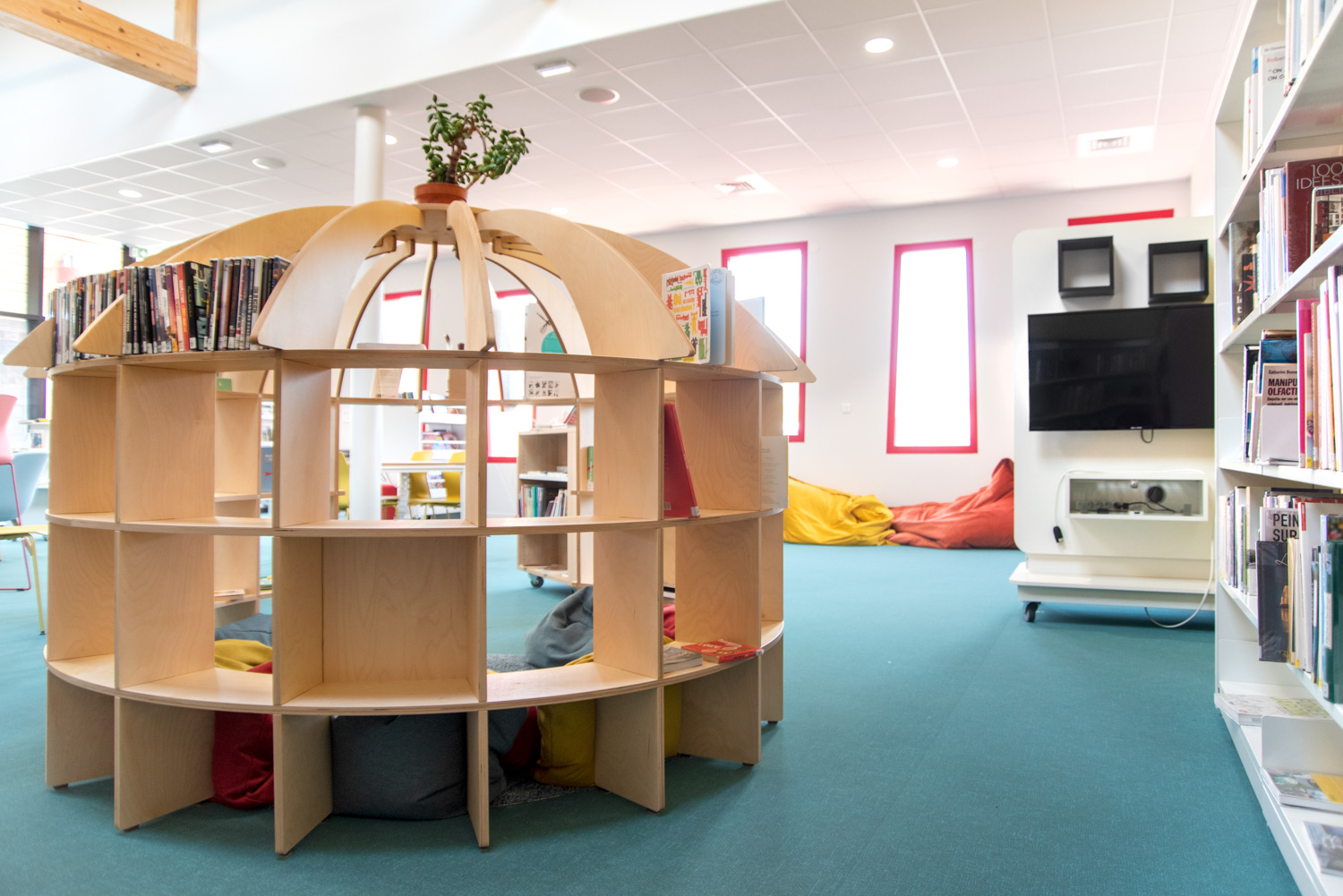 Indretningen er et smukt resultat baseret på et godt samarbejde mellem arkitekten, kommunen, biblioteket og teamet fra BC Intérieur, som sammen er blevet enige om valg af møbler, farver og materialer. På et relativt lille areal (100 m²) er det lykkedes at lave et sted, som omfavner alle; Træhytten er tilflugtssted for de små, sofaen indbyder til højtlæsning fra forældre til børn, den høje bar er det ideelle mødested til samtaler og arbejde, hvor det samtidig er muligt at begrave sig dybt i en behagelig sækkestol, drikke kaffe og læse en bog i bløde lænestole... Et behageligt sted for alle.
