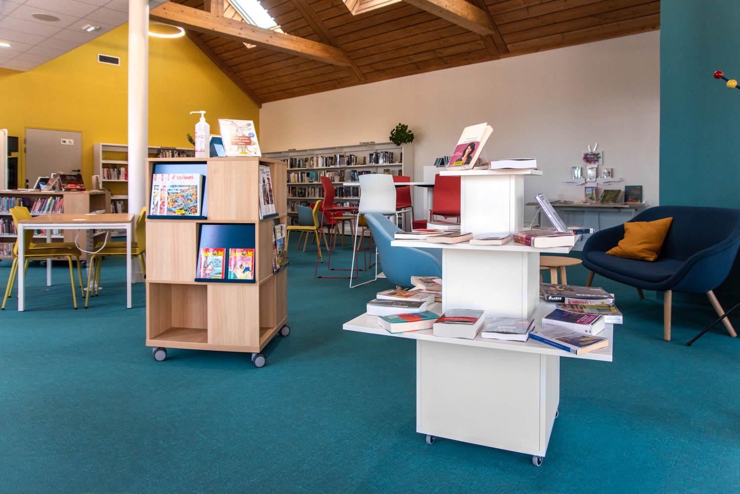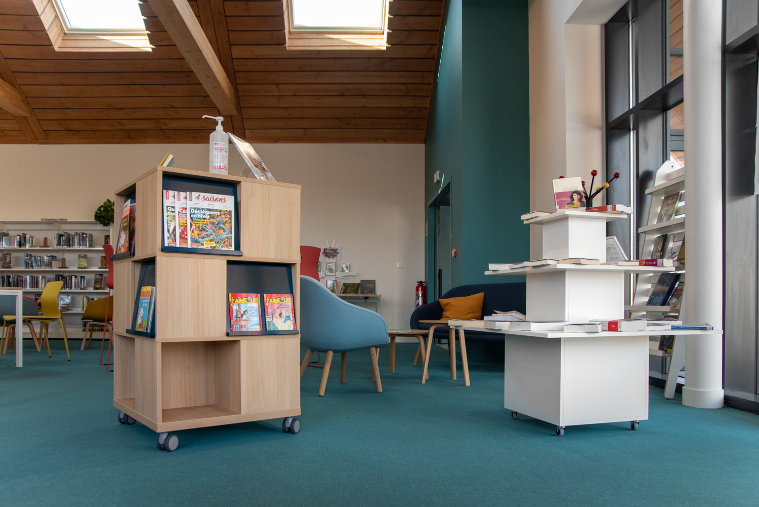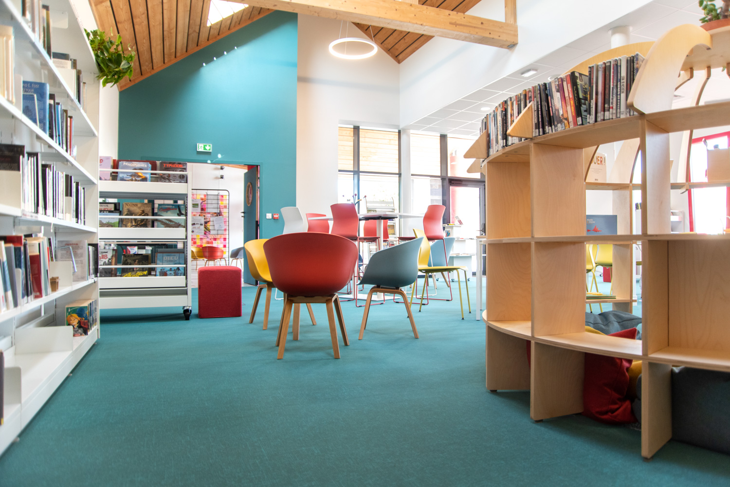 Indretningen er et smukt resultat baseret på et godt samarbejde mellem arkitekten, kommunen, biblioteket og teamet fra BC Intérieur, som sammen er blevet enige om valg af møbler, farver og materialer. På et relativt lille areal (100 m²) er det lykkedes at lave et sted, som omfavner alle; Træhytten er tilflugtssted for de små, sofaen indbyder til højtlæsning fra forældre til børn, den høje bar er det ideelle mødested til samtaler og arbejde, hvor det samtidig er muligt at begrave sig dybt i en behagelig sækkestol, drikke kaffe og læse en bog i bløde lænestole... Et behageligt sted for alle.