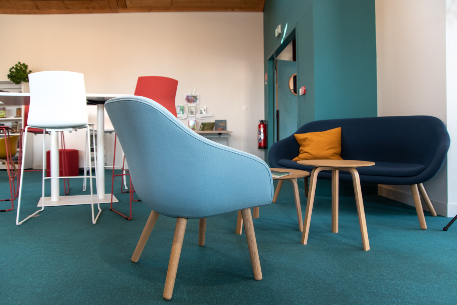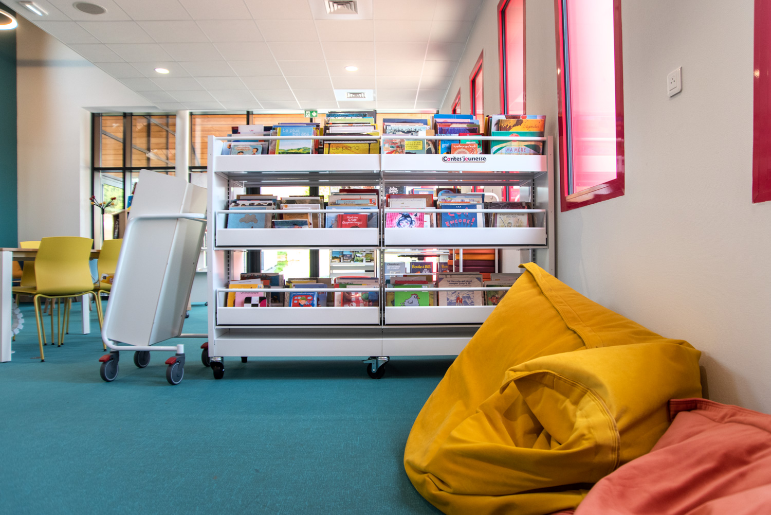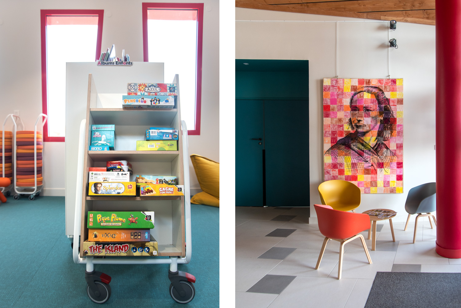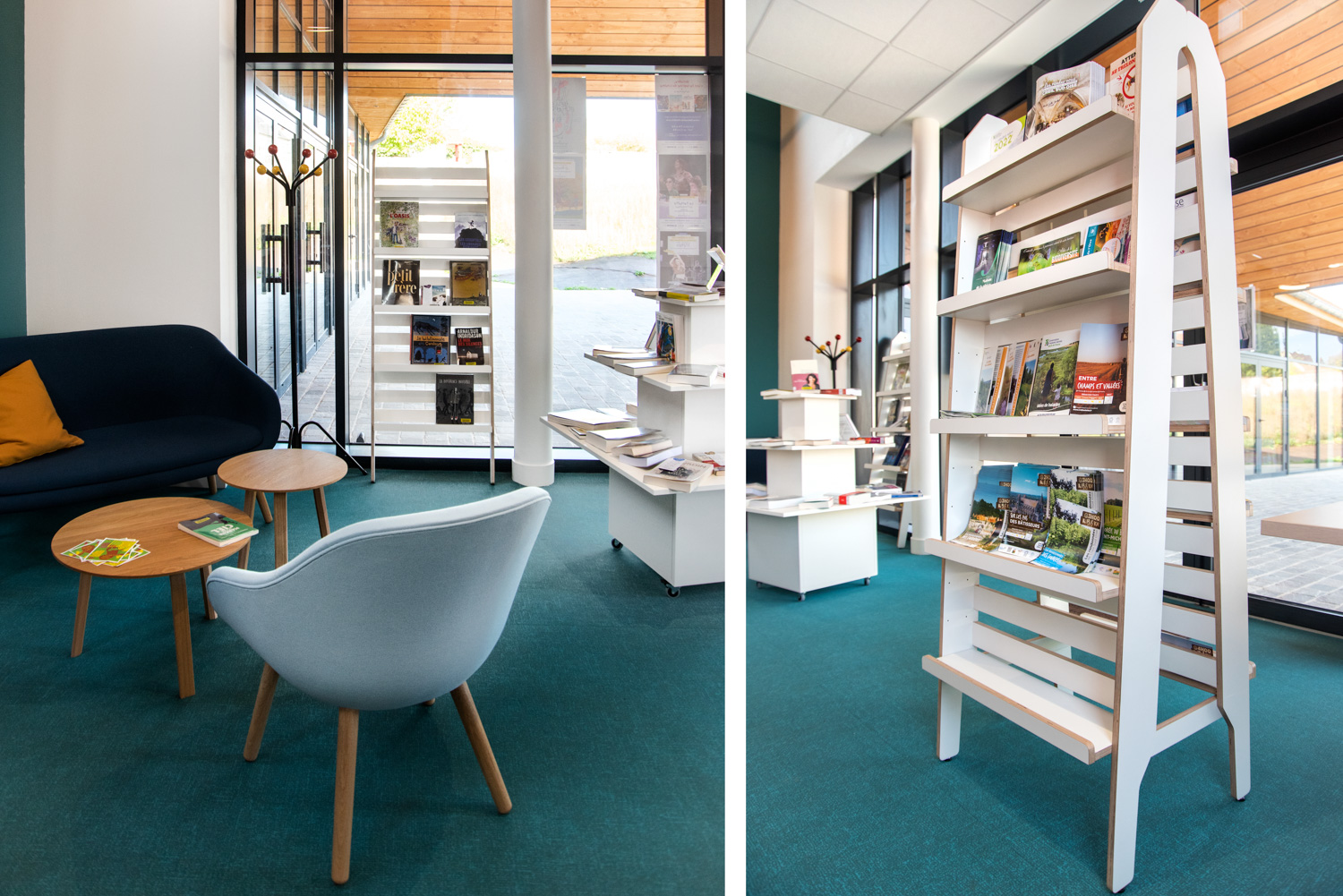 Indretningen er et smukt resultat baseret på et godt samarbejde mellem arkitekten, kommunen, biblioteket og teamet fra BC Intérieur, som sammen er blevet enige om valg af møbler, farver og materialer. På et relativt lille areal (100 m²) er det lykkedes at lave et sted, som omfavner alle; Træhytten er tilflugtssted for de små, sofaen indbyder til højtlæsning fra forældre til børn, den høje bar er det ideelle mødested til samtaler og arbejde, hvor det samtidig er muligt at begrave sig dybt i en behagelig sækkestol, drikke kaffe og læse en bog i bløde lænestole... Et behageligt sted for alle.