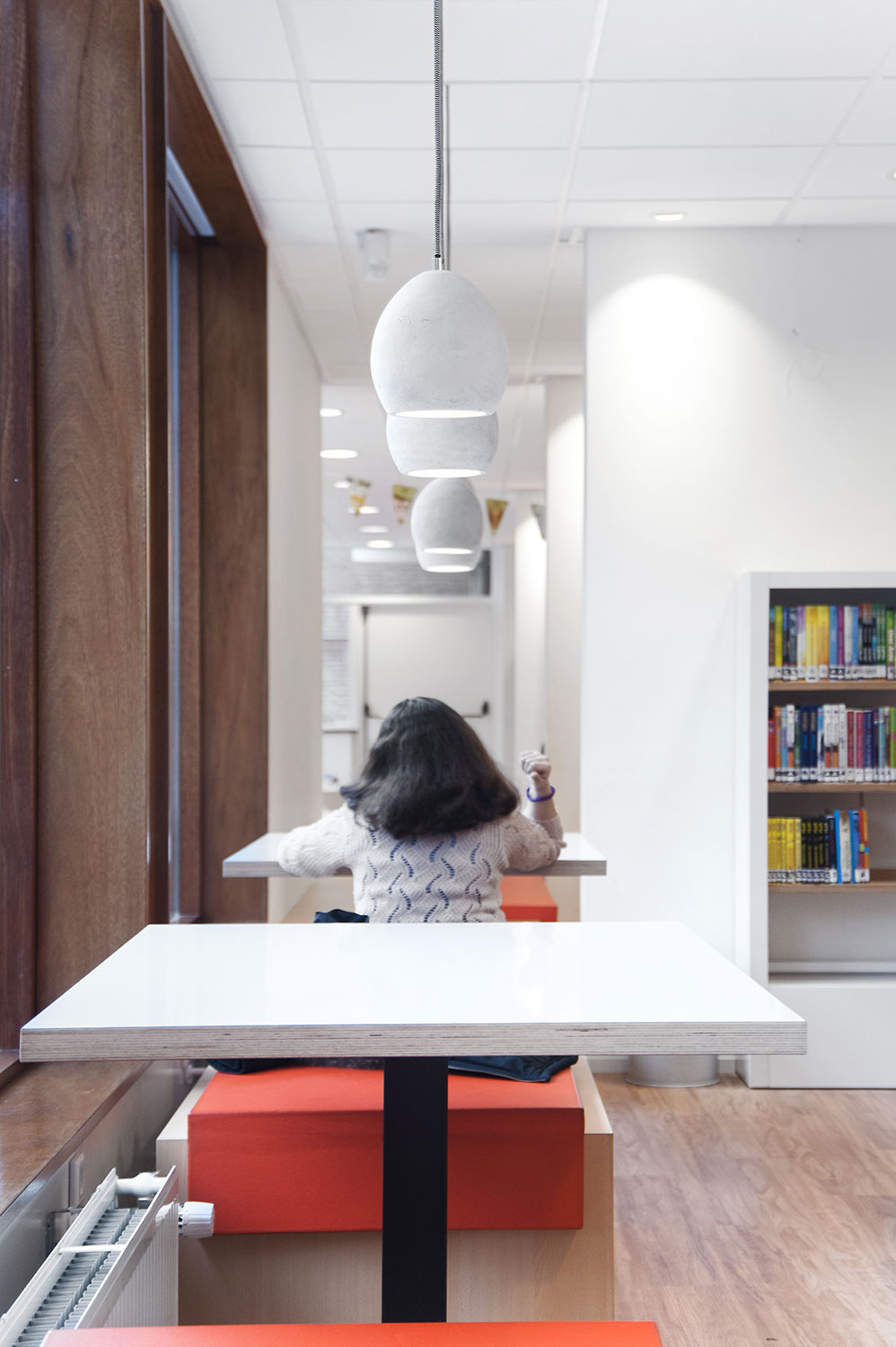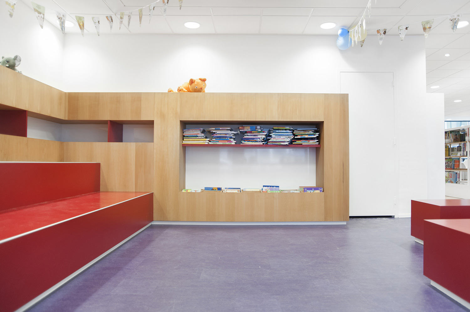 Indretningen af biblioteket er lavet af arkitekterne +31ARCHITECTS og Millie’s. Indretningen er rummelig og lys. Det er en kombination af specialmøbler og standard Uniflex reolsystem. Men selv biblioteksreolerne er anvendt på en sådan måde at det næsten ser ud som specialinventar.