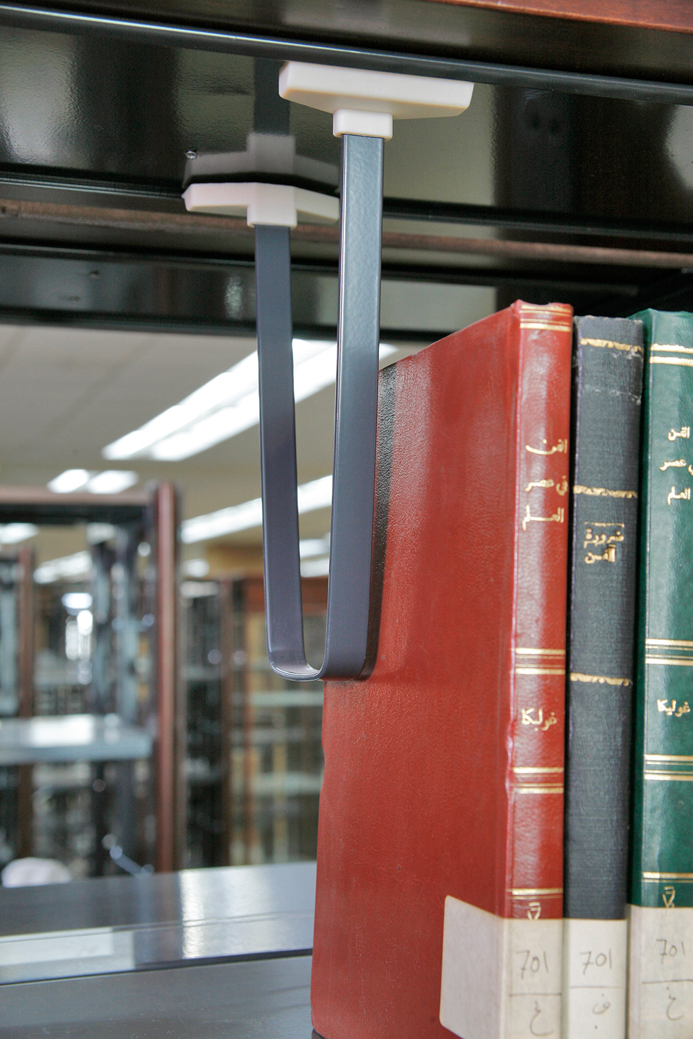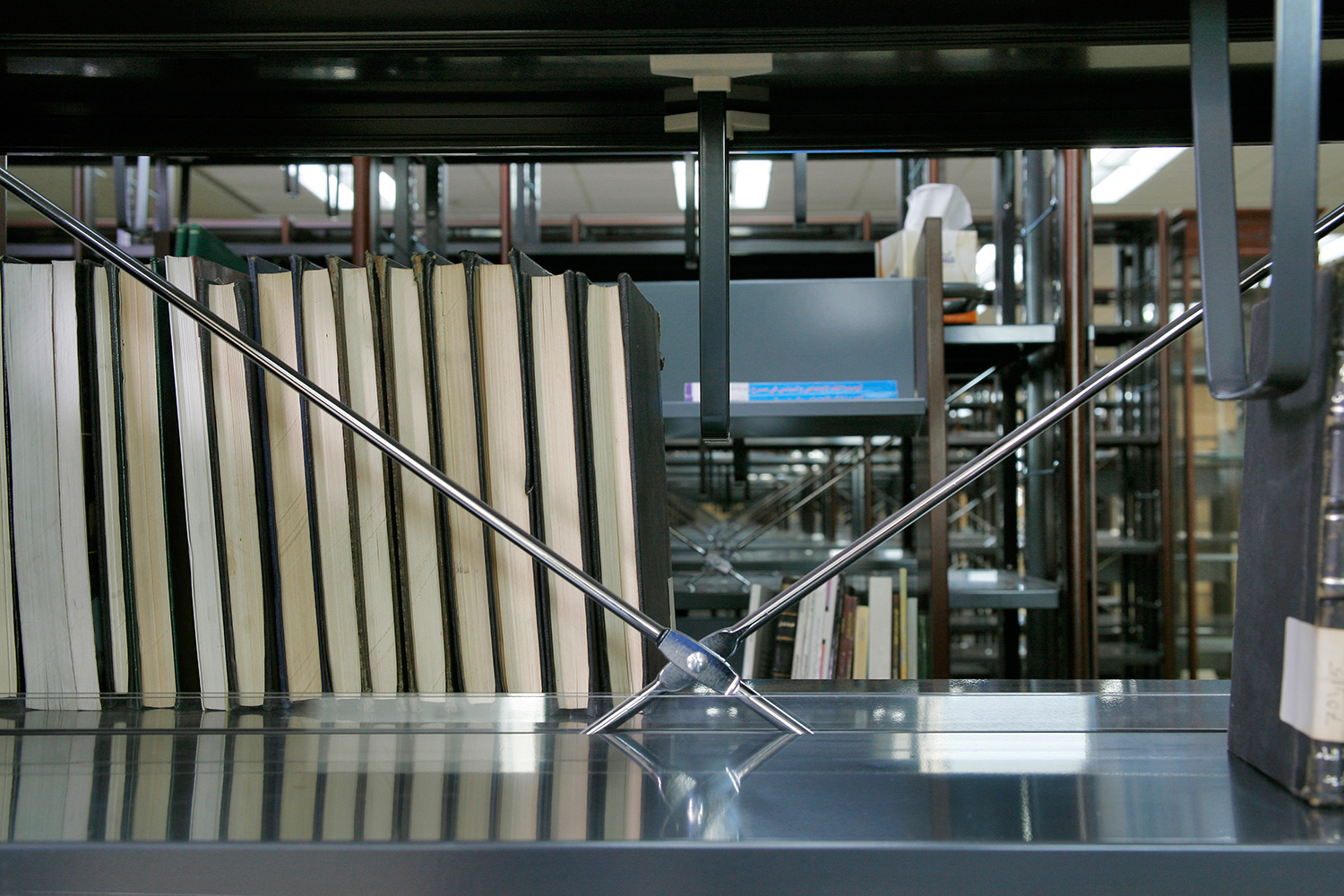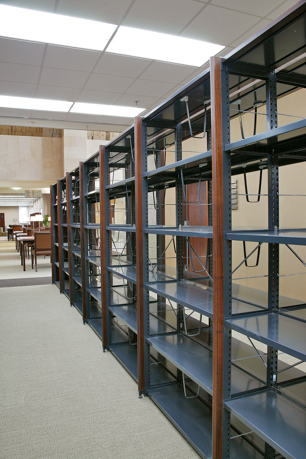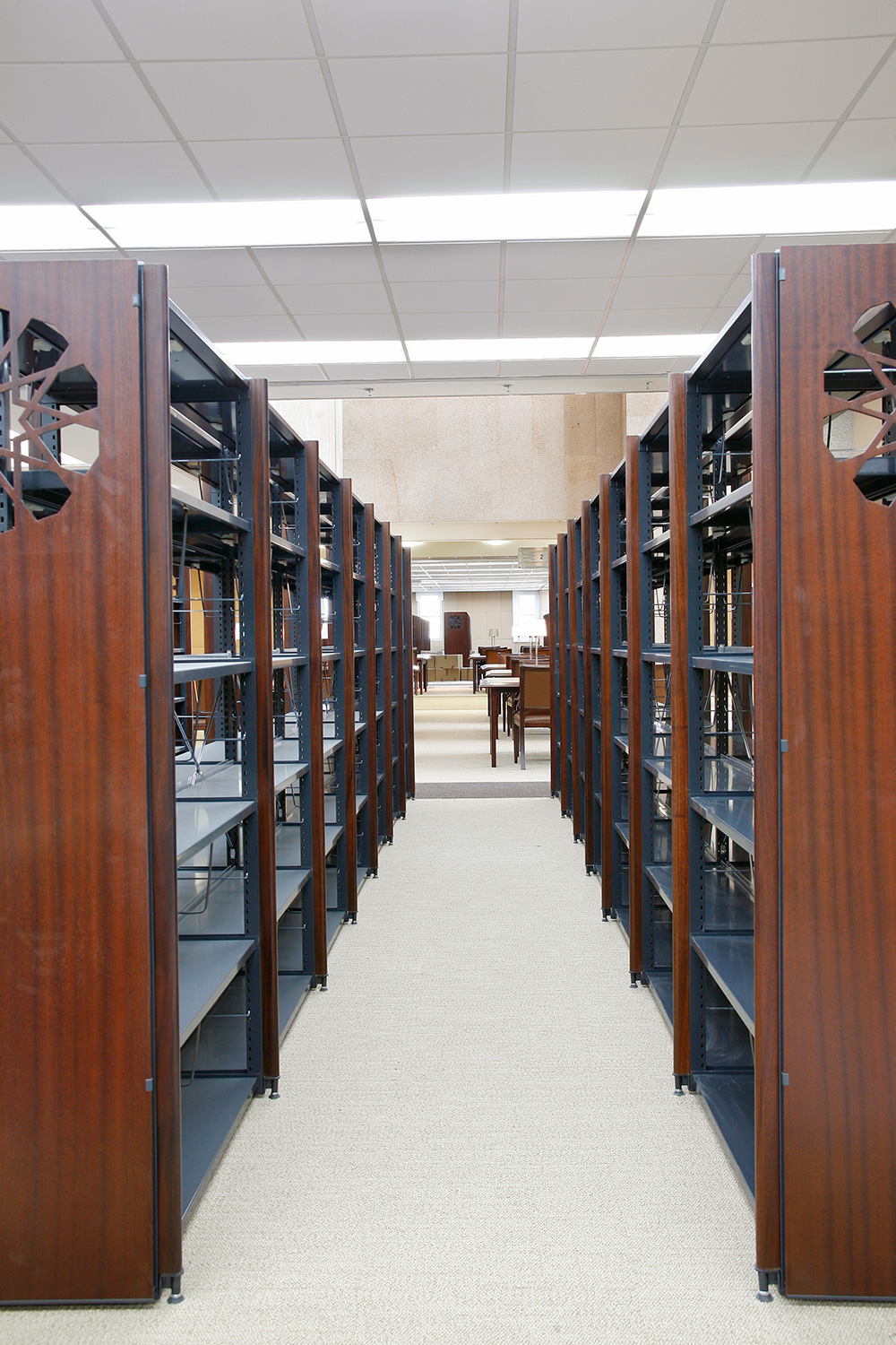 Bibliotekets samlinger er arrangeret i Gothia stål reoler med skjoldet træfronter og gavle.