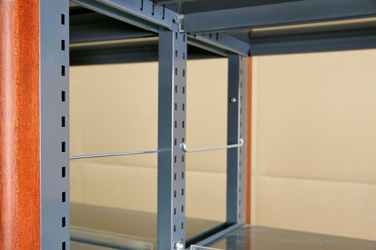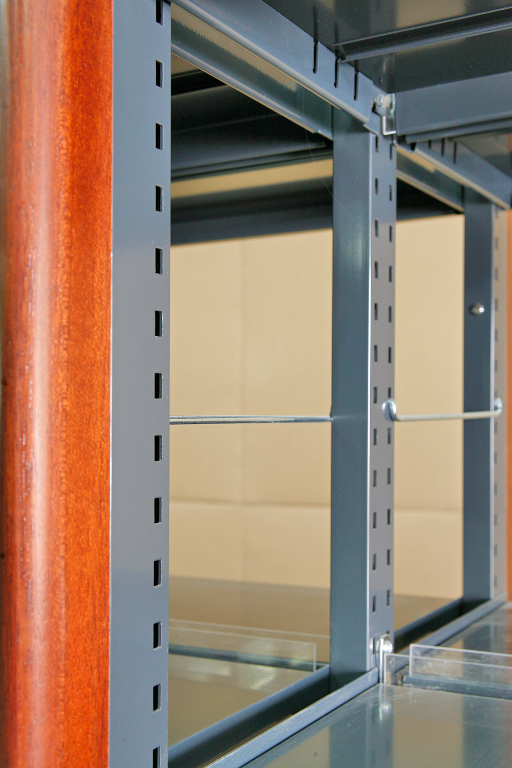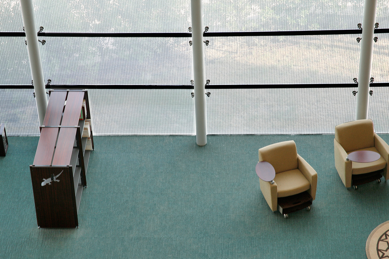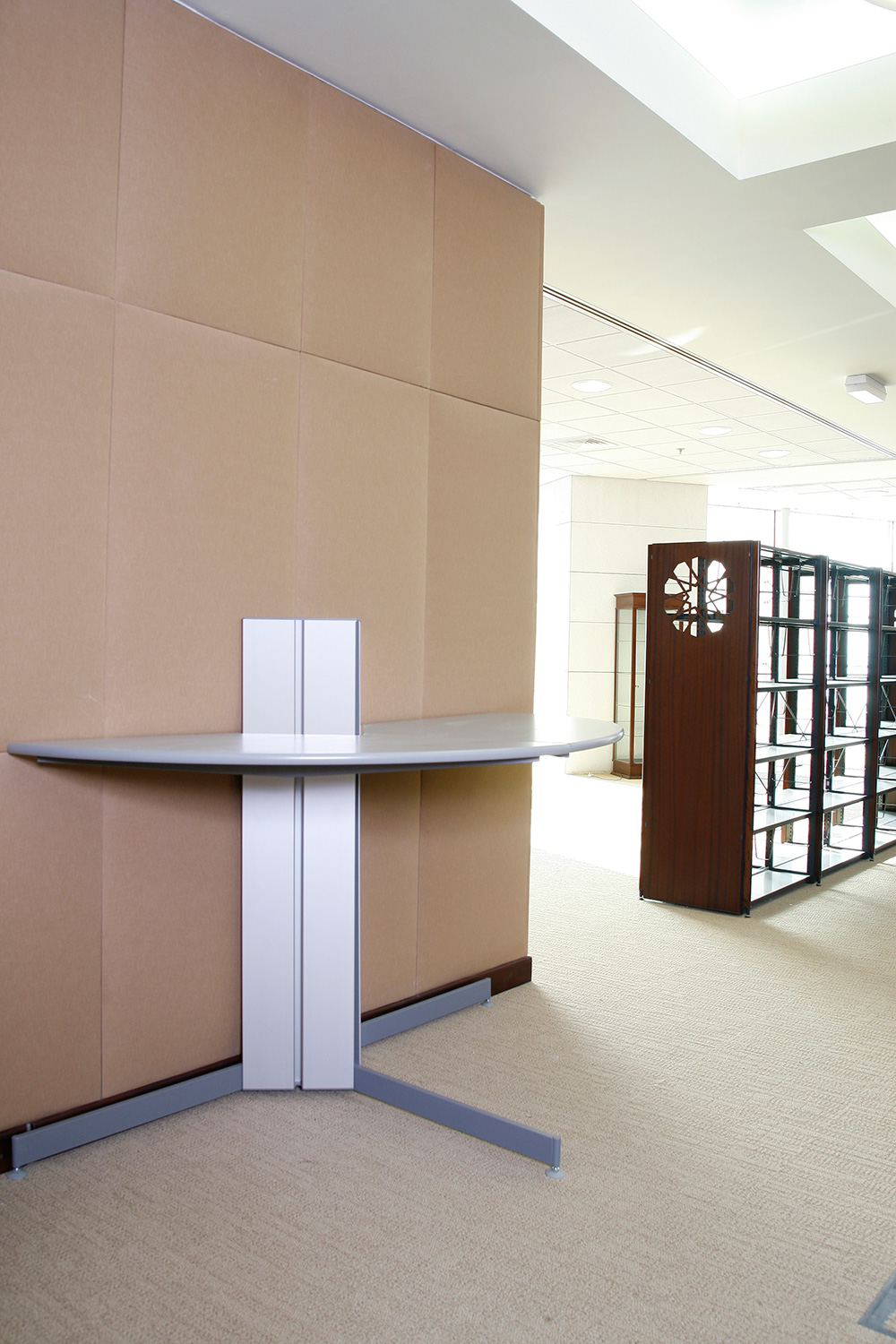 Bibliotekets samlinger er arrangeret i Gothia stål reoler med skjoldet træfronter og gavle.