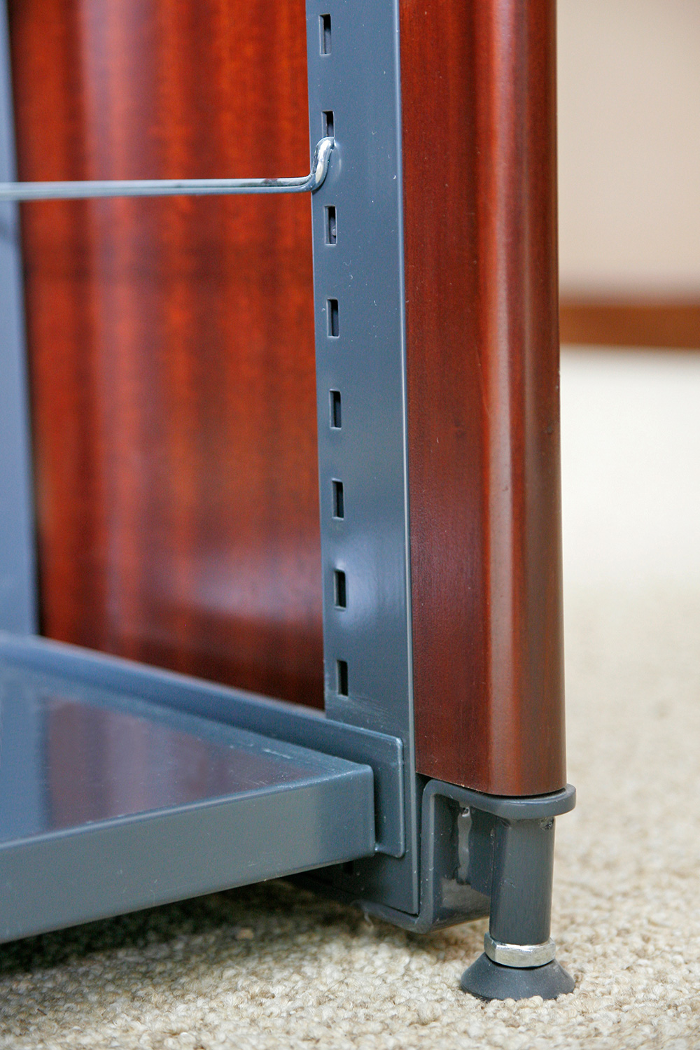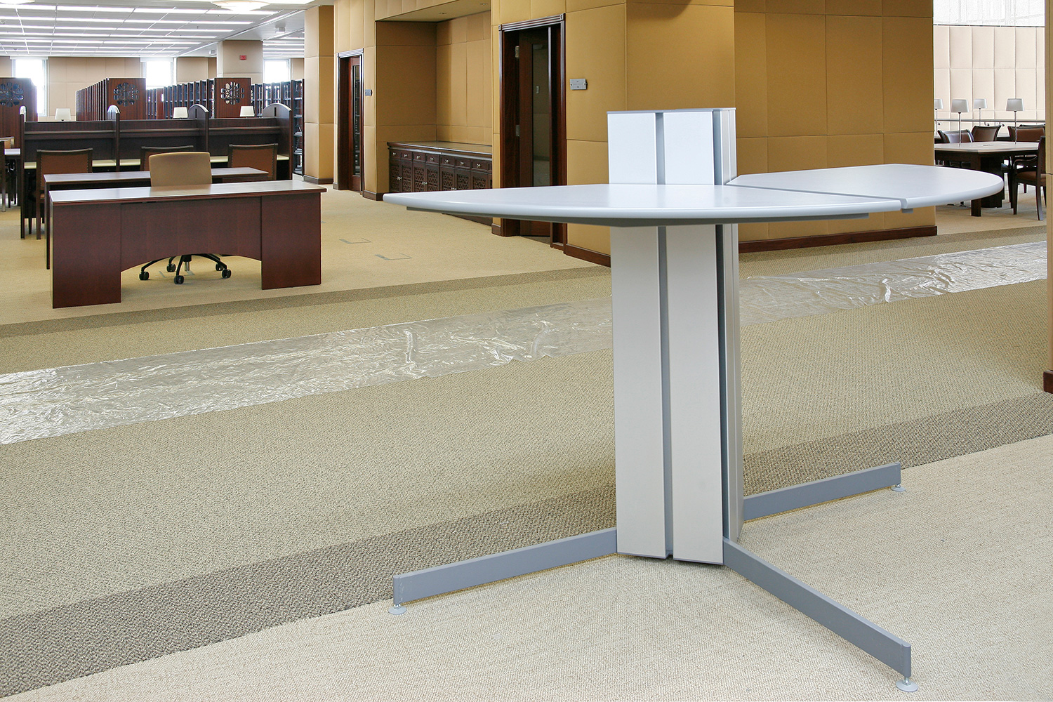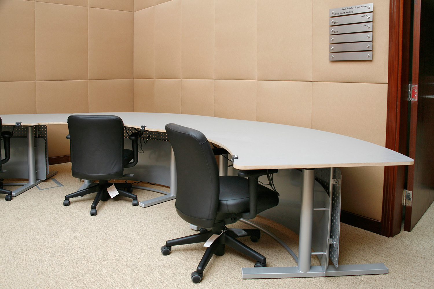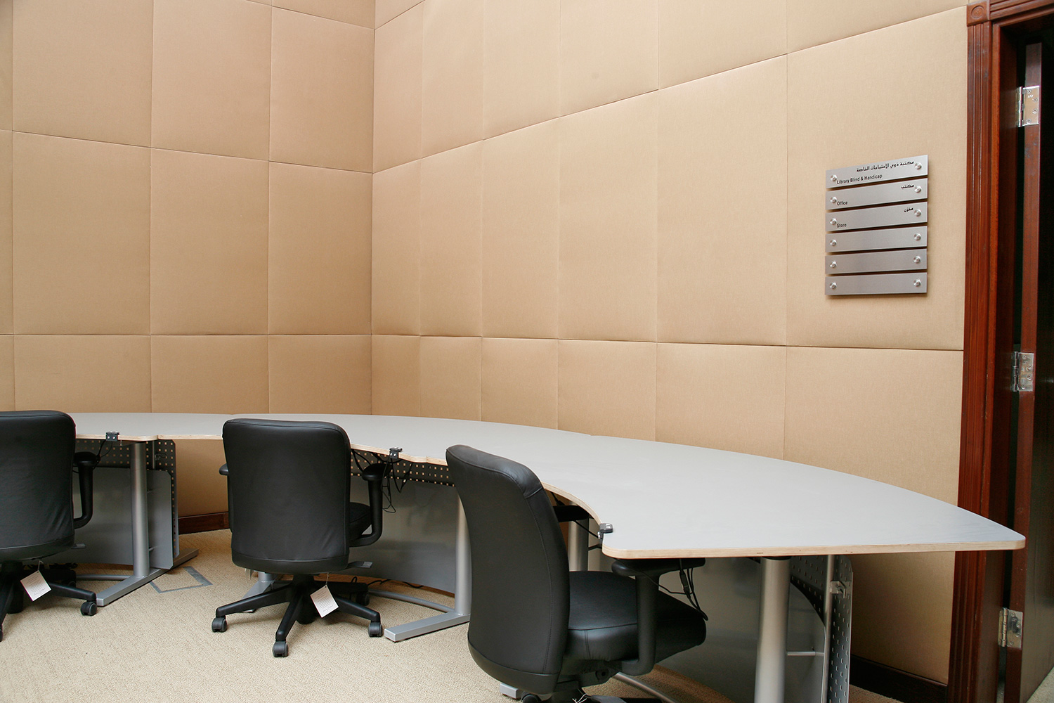 Bibliotekets samlinger er arrangeret i Gothia stål reoler med skjoldet træfronter og gavle.