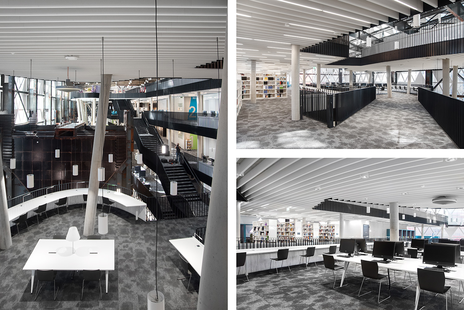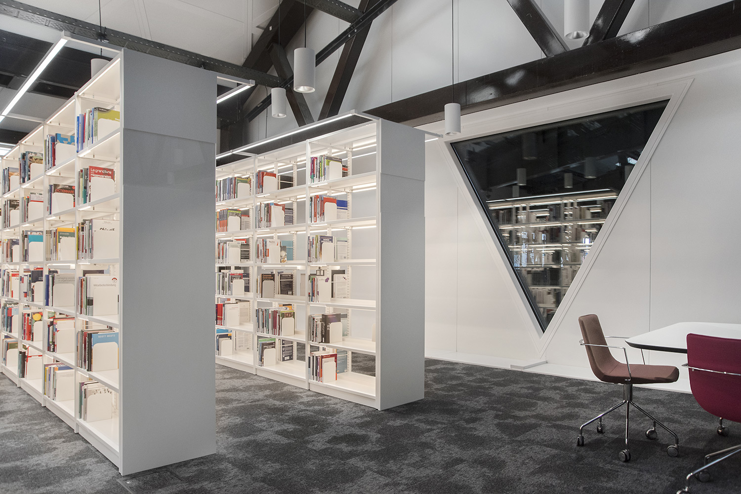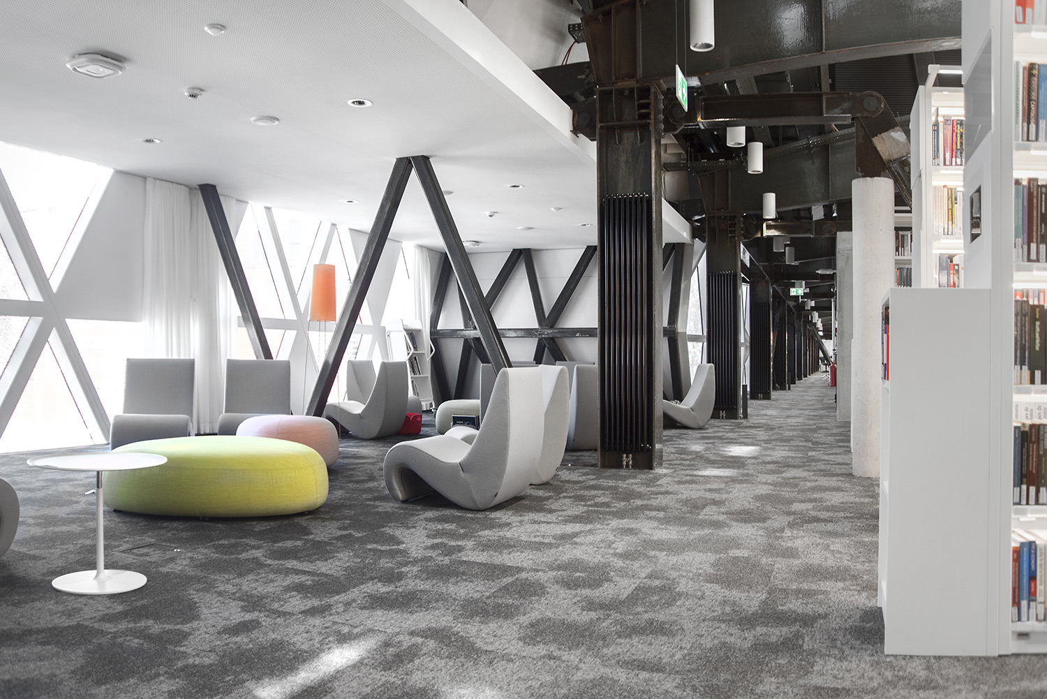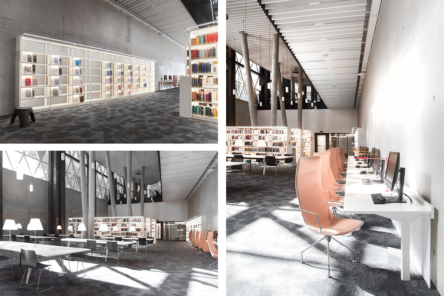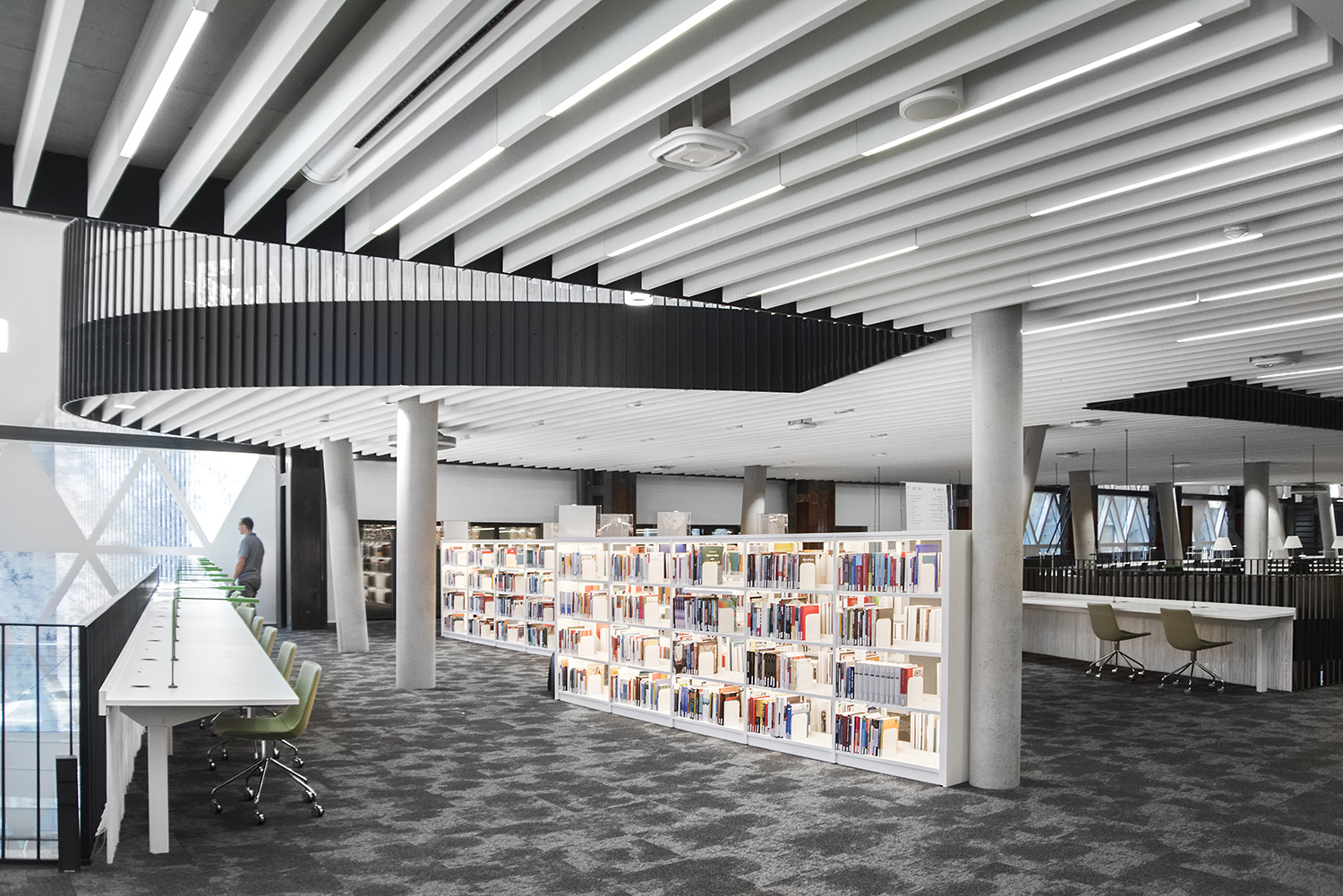 Den enestående arkitektur sammen med møbler af høj kvalitet skaber en attraktiv og fleksible ramme, der gør det videnskabelige bibliotek til et fornøjeligt sted at mødes, arbejde og dele viden.