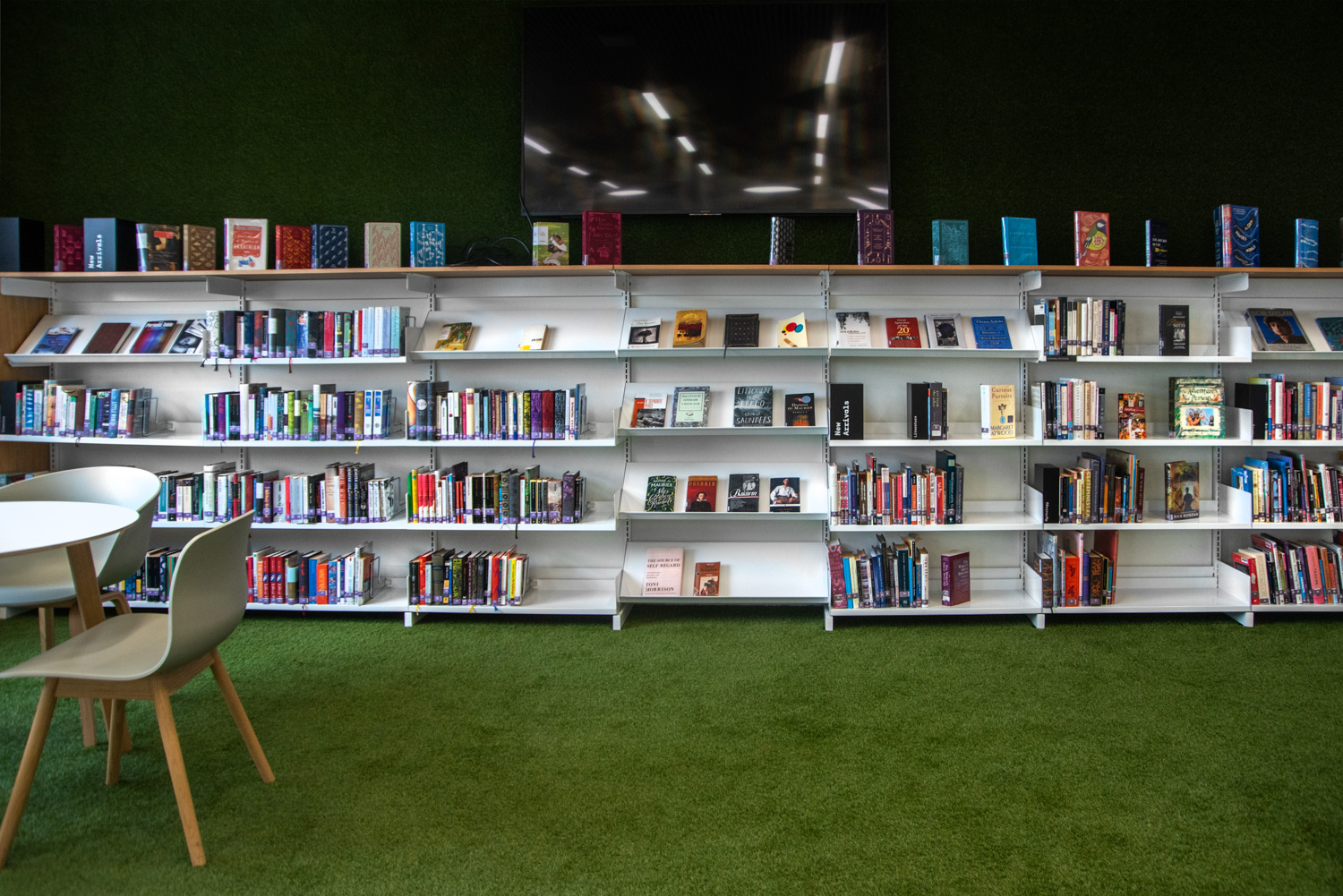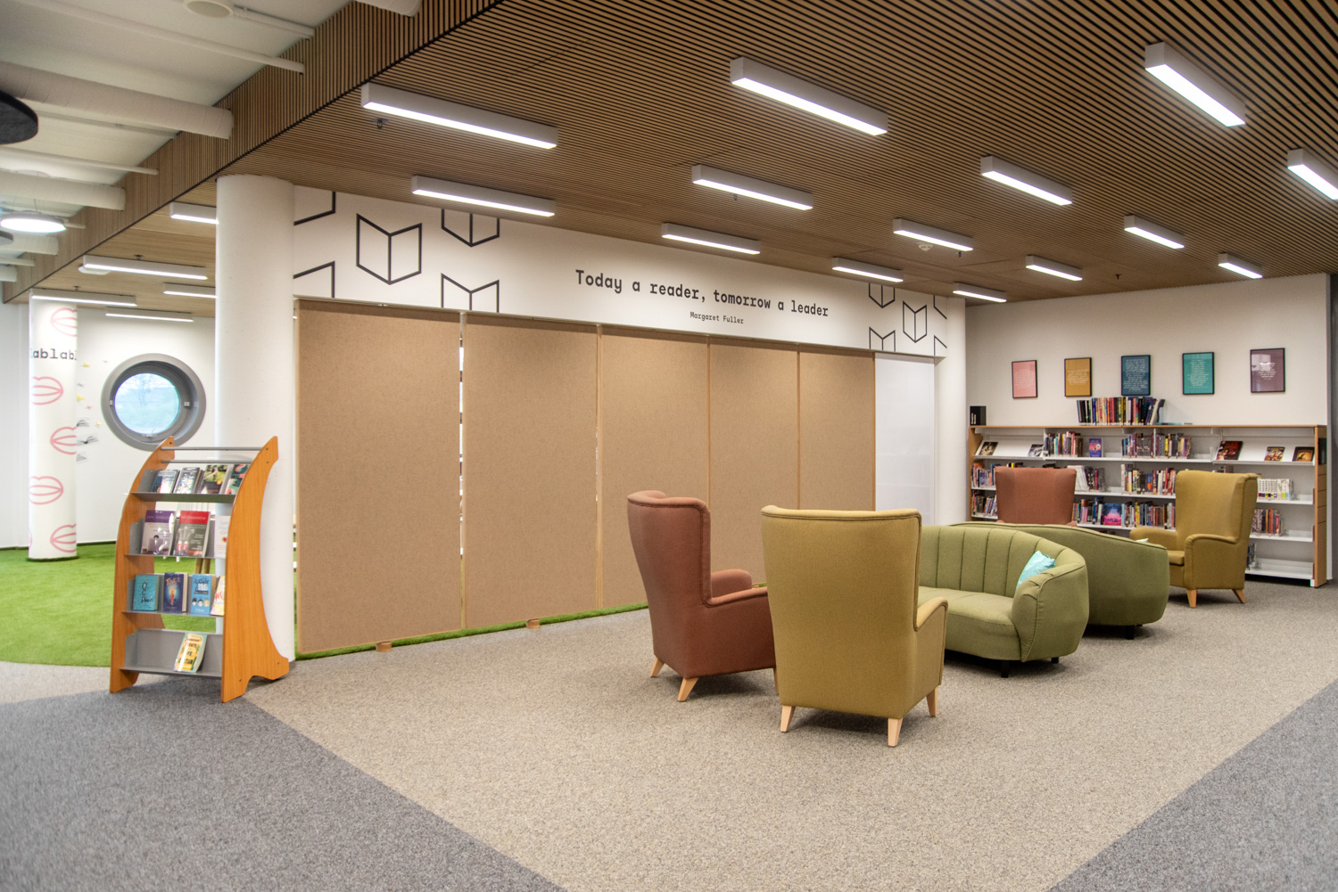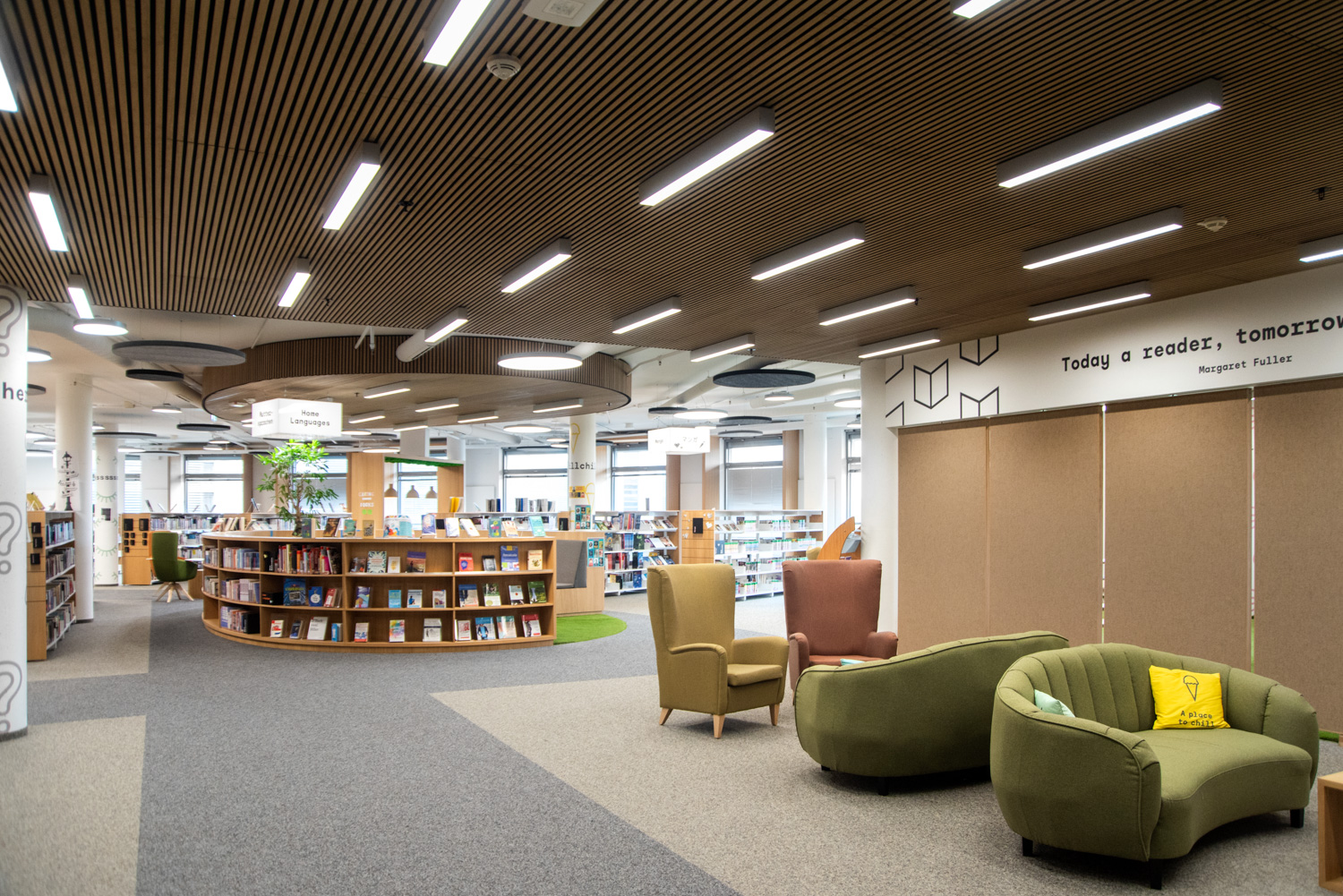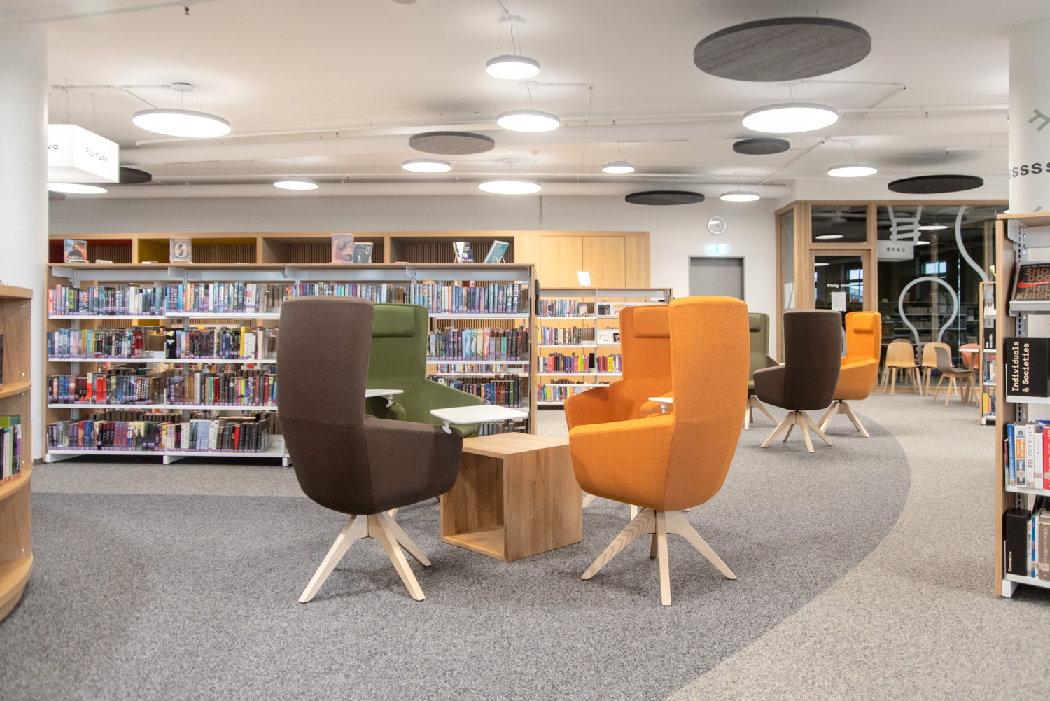 Atmosfæren i biblioteket er varm og behagelig. Bøger og andre materialer står på 60/30 reoler i stål med træbeklædning og endegavle tilpasset skiltning. Besøgende kan slå sig ned i forskellige siddemøbler eller benytte de hyggelige arbejds- og læsehjørner. De runde lamper og akustiske loftsøer komplementerer elegant de runde reolsystemer gennem hele biblioteket.