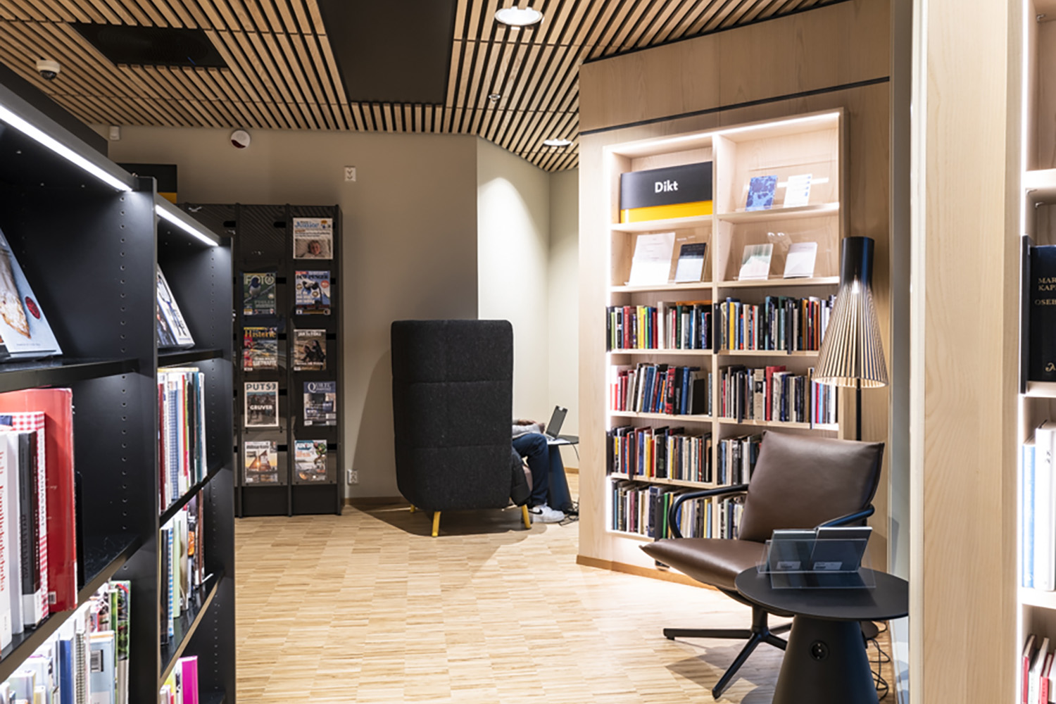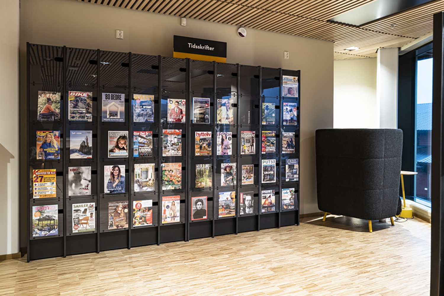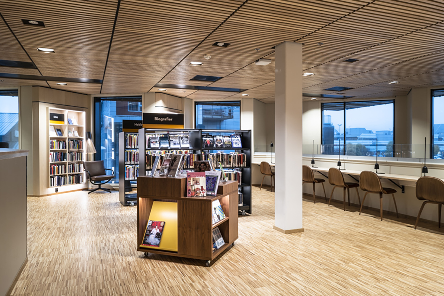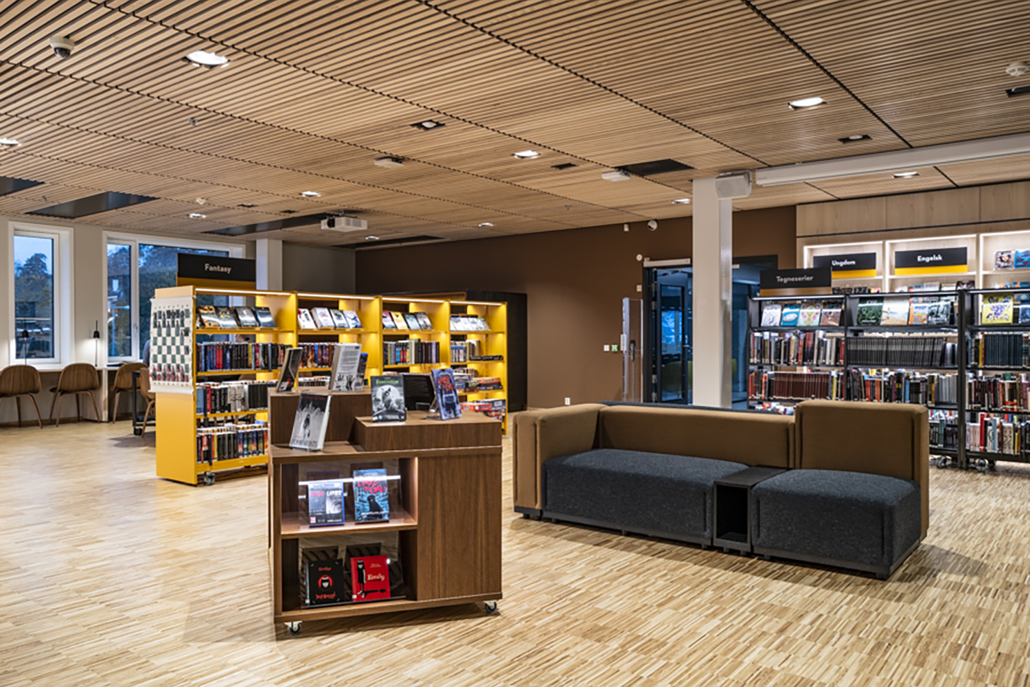 Flere af bibliotekets møbler er med hjul for let at kunne transformere lokalerne til forskellige arrangementer og aktiviteter. På reolernes hylder er der monteret LED-lys for at øge læsbarheden og tilføre biblioteksrummet elegance og funktionalitet.
