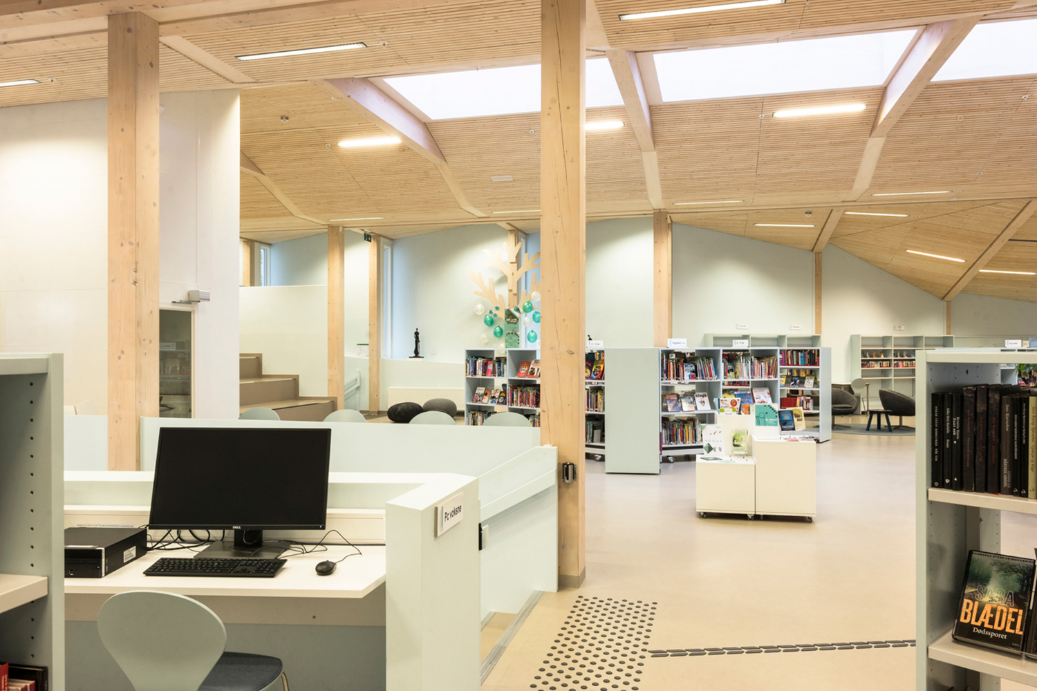 Farverne indendørs er hav og himmel, sand og sten. Væggene er havblå, skrankerne er som sten og gulvet er sandfarvet. Eftersom biblioteket ligger i byhaven, er der også kommet lidt honninggult ind.