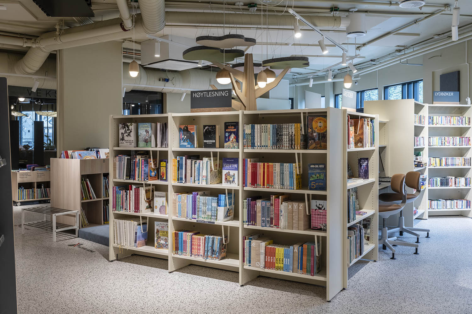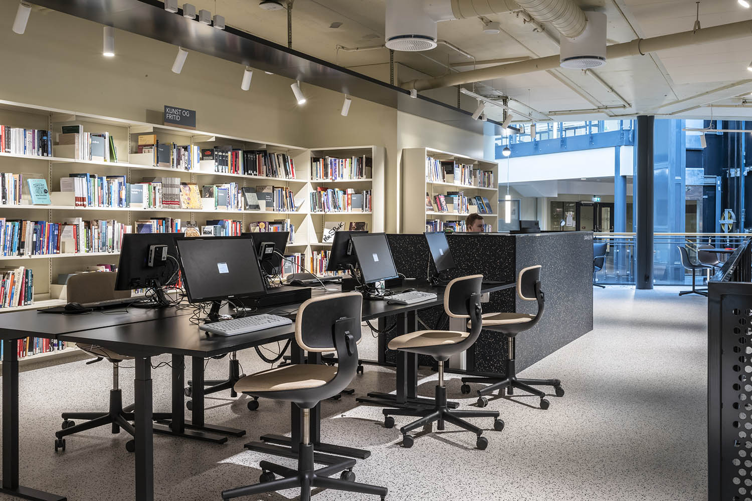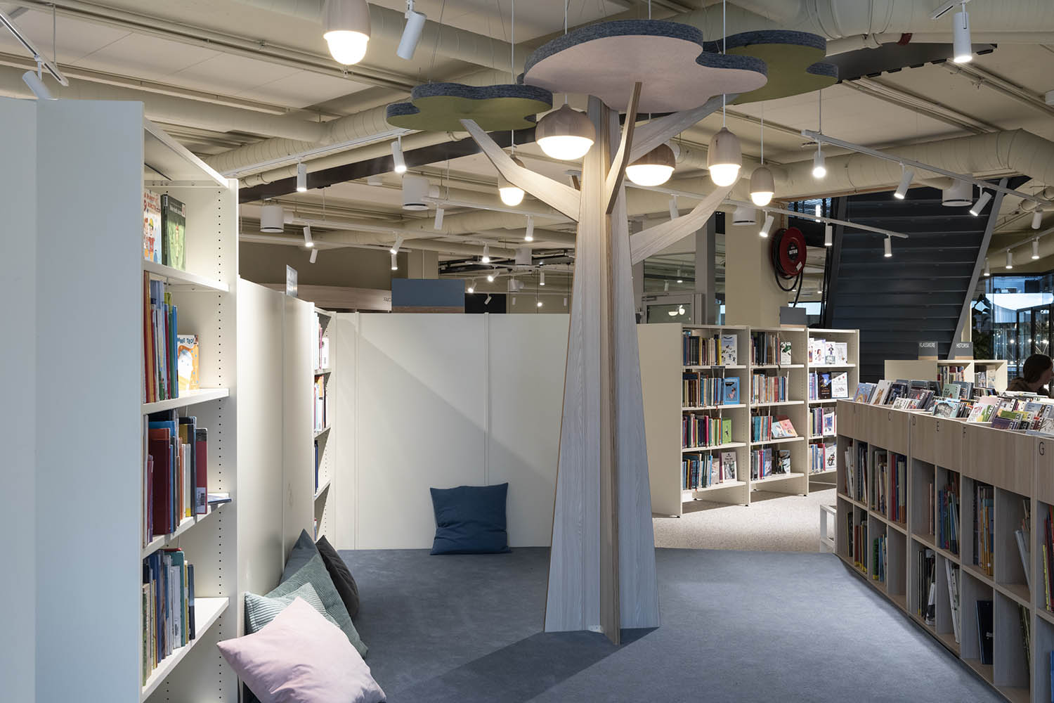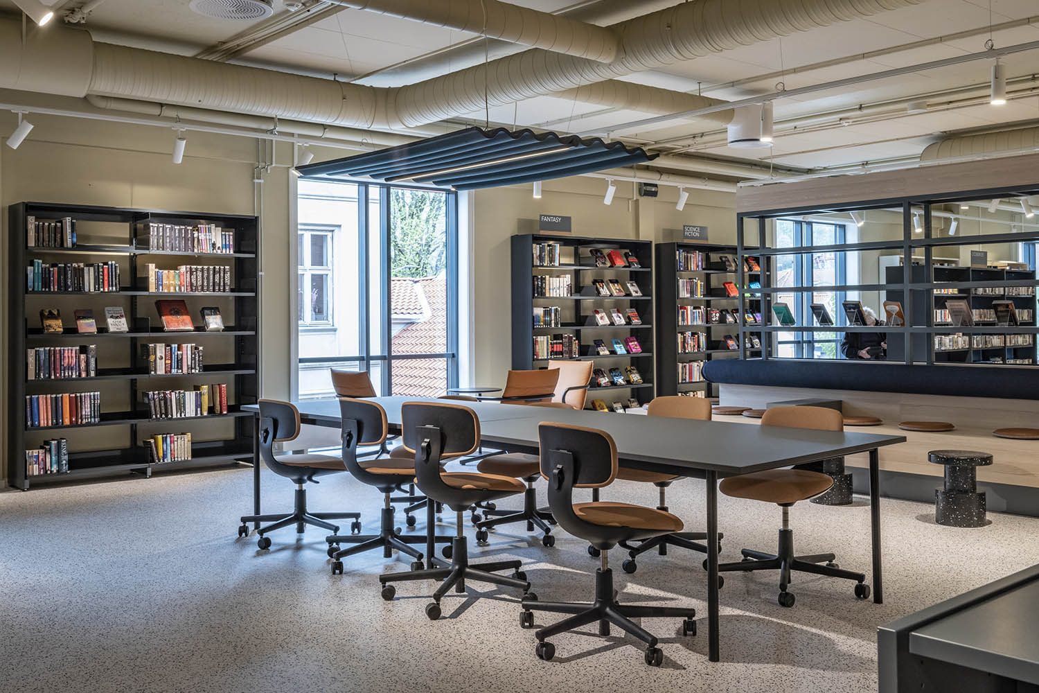 Biblioteket er generelt indrettet med reoler i både lyse og mørke farver, der komplementerer hinanden og sammen med resten af møblerne skaber en indbydende og hyggelig stemning med plads til alle brugere.