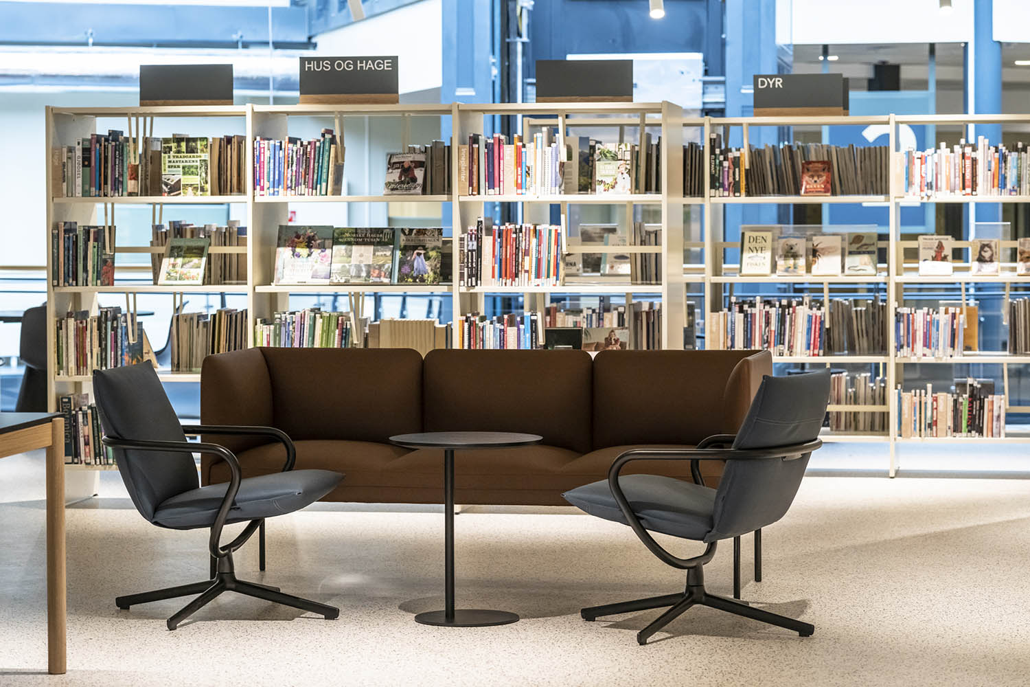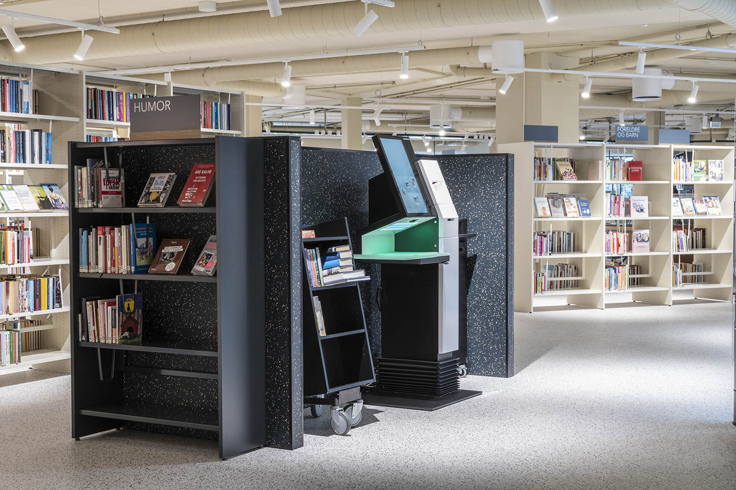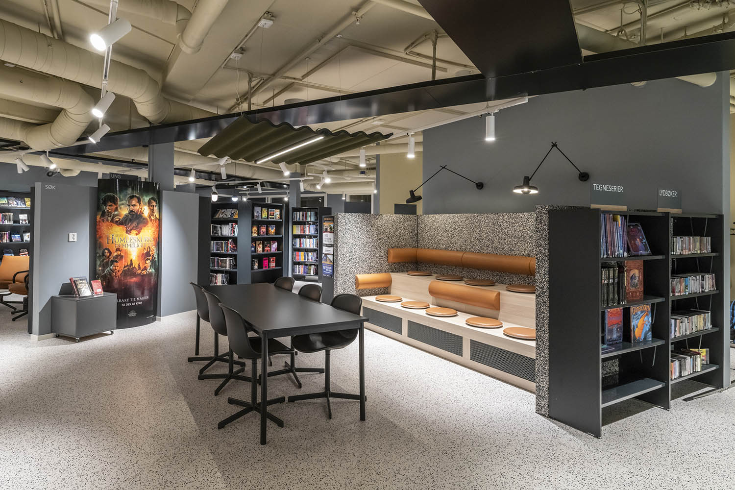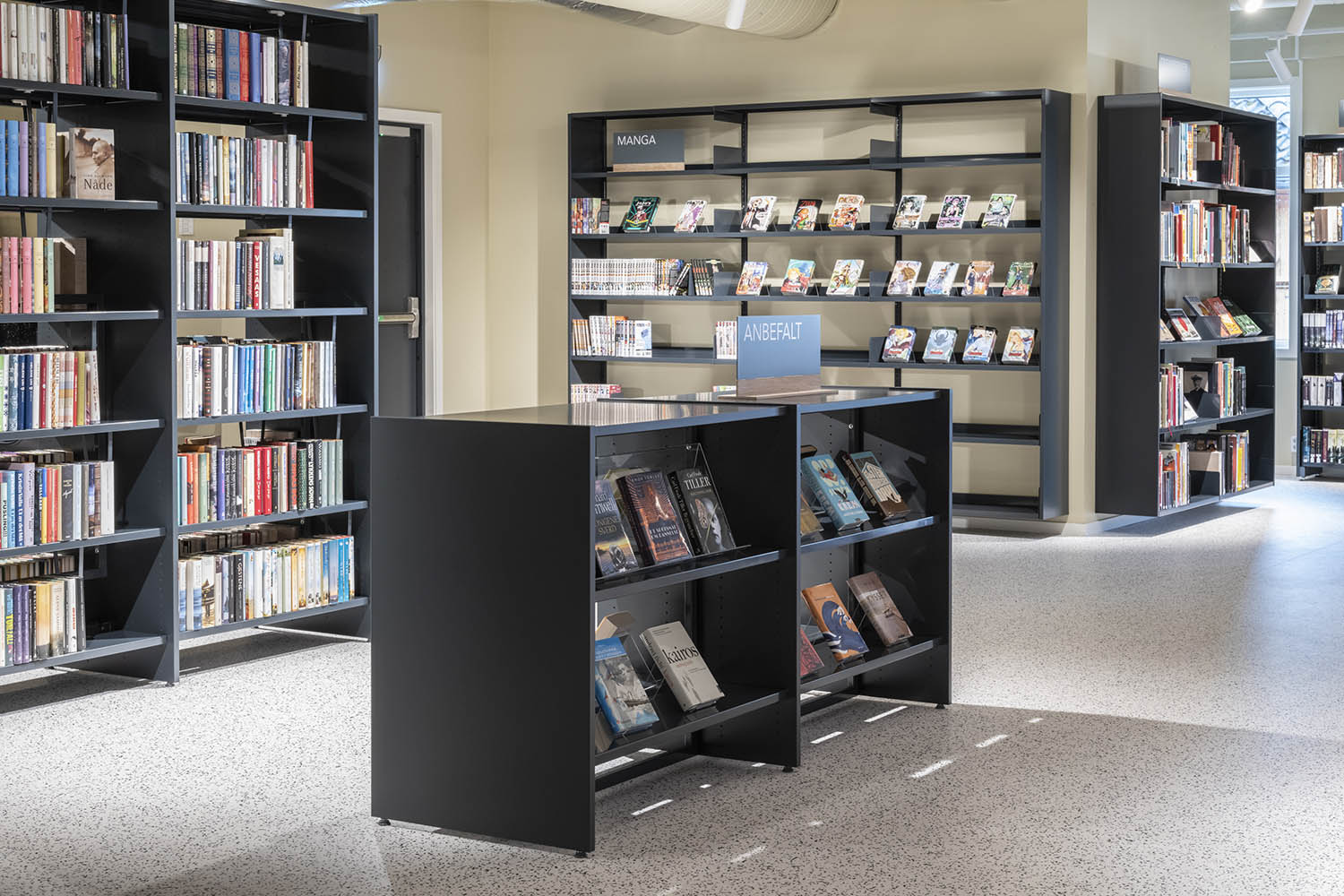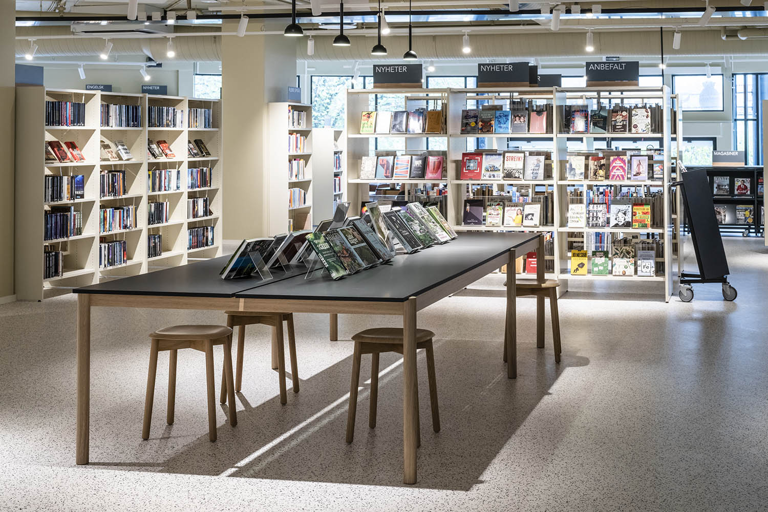 Biblioteket er generelt indrettet med reoler i både lyse og mørke farver, der komplementerer hinanden og sammen med resten af møblerne skaber en indbydende og hyggelig stemning med plads til alle brugere.