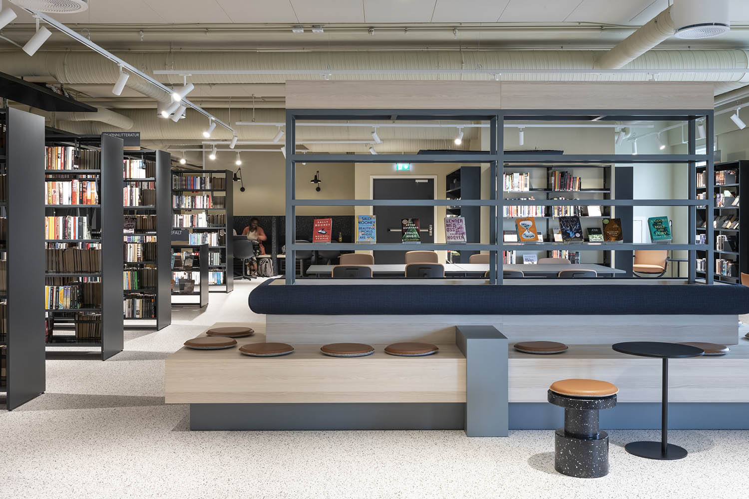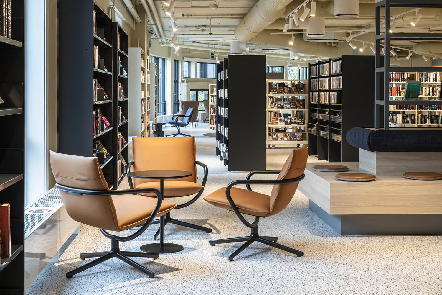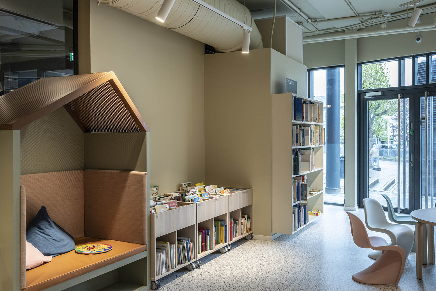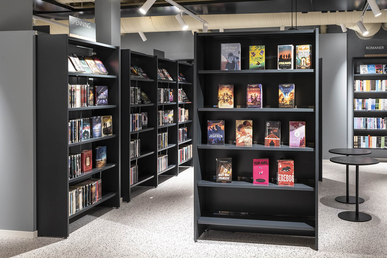 Biblioteket er generelt indrettet med reoler i både lyse og mørke farver, der komplementerer hinanden og sammen med resten af møblerne skaber en indbydende og hyggelig stemning med plads til alle brugere.