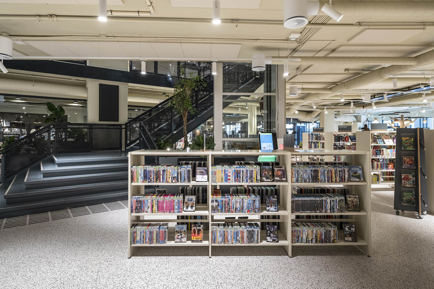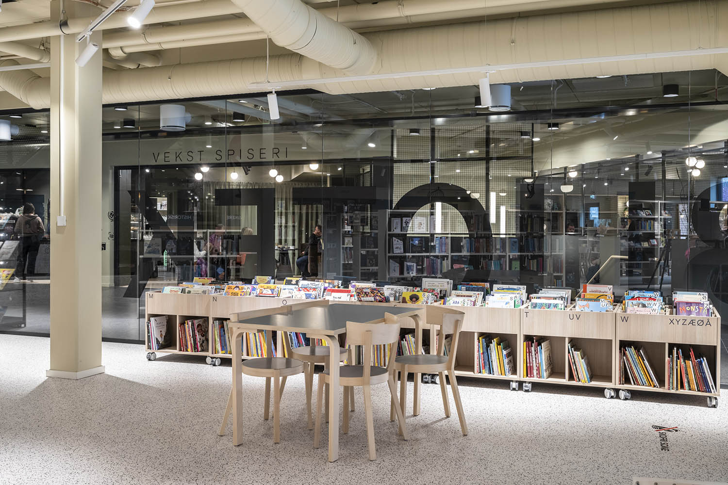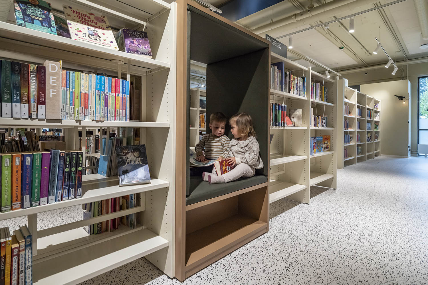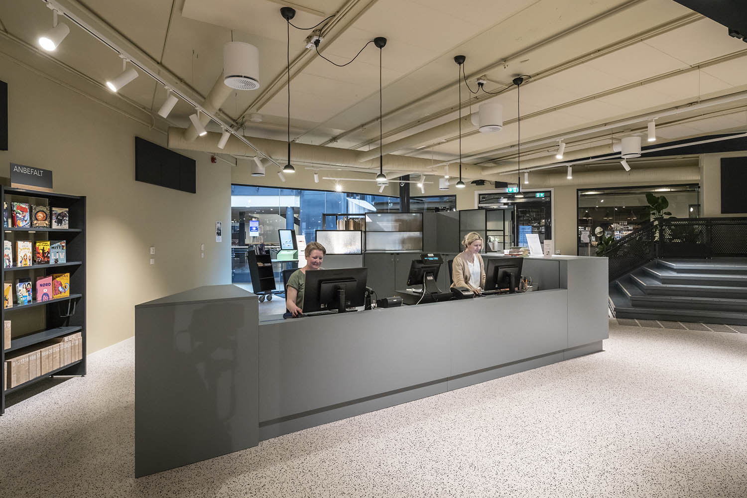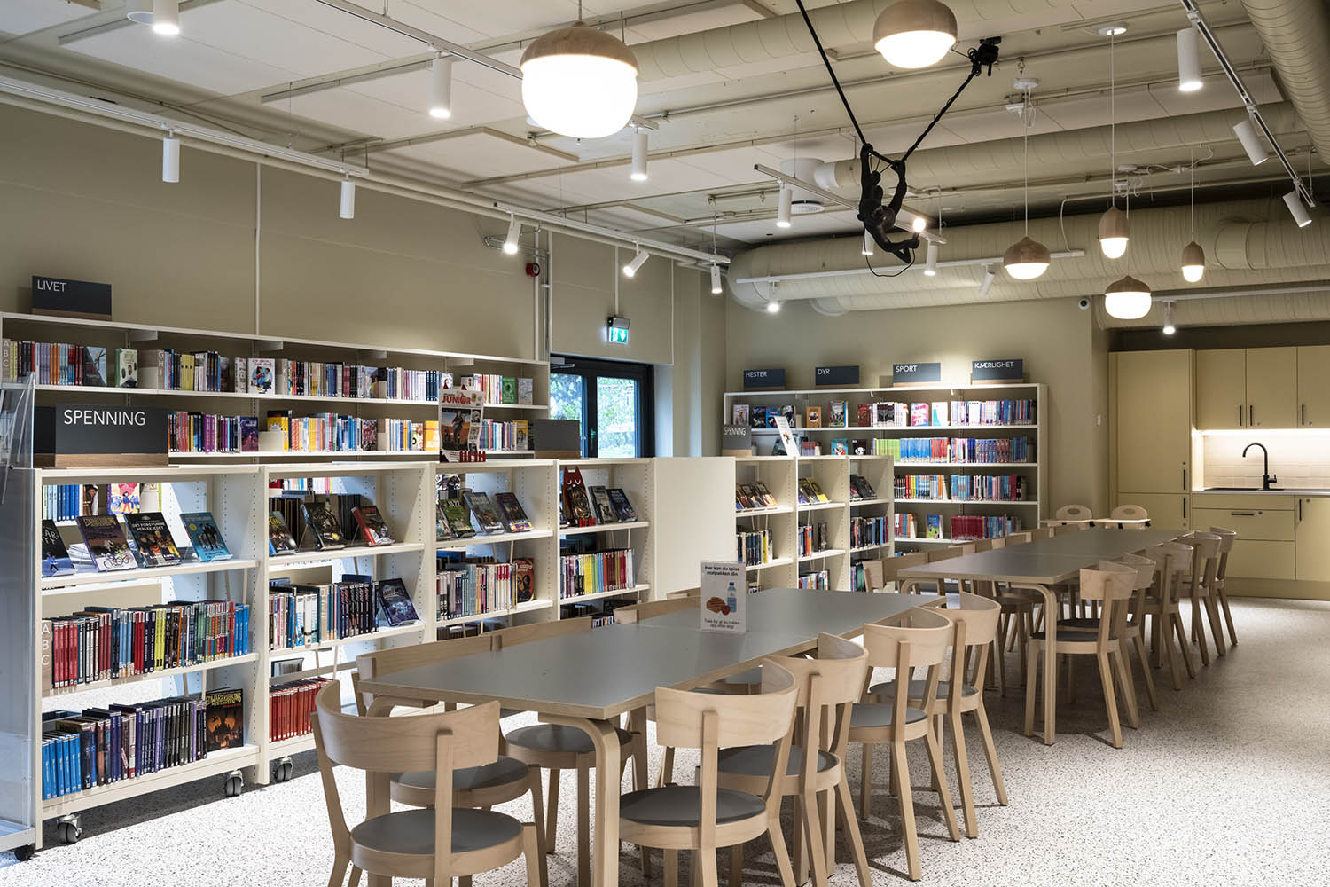 Biblioteket er generelt indrettet med reoler i både lyse og mørke farver, der komplementerer hinanden og sammen med resten af møblerne skaber en indbydende og hyggelig stemning med plads til alle brugere.