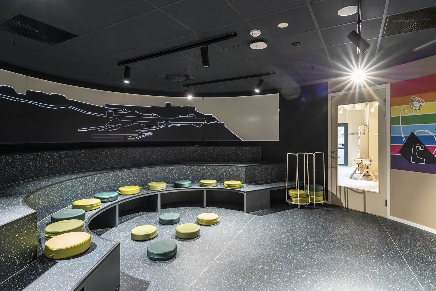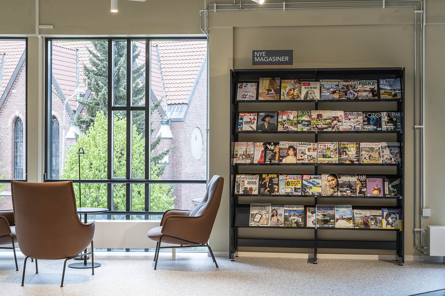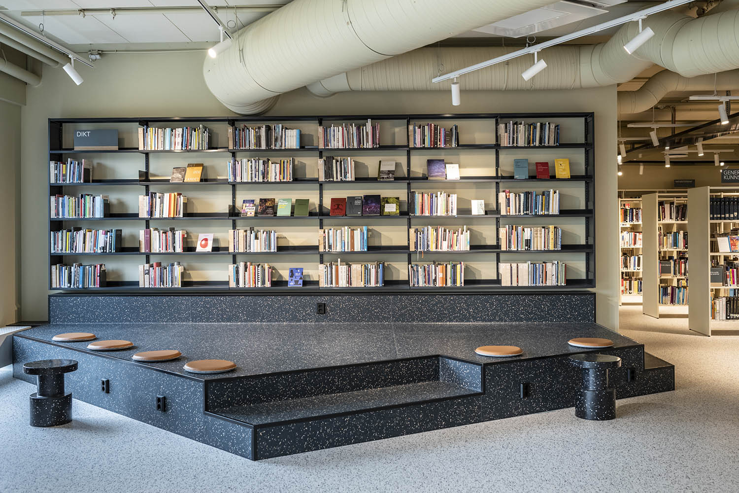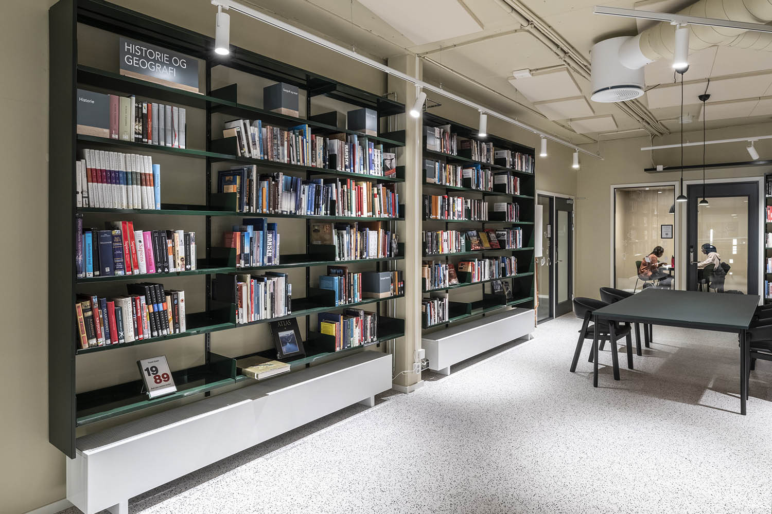 Biblioteket er generelt indrettet med reoler i både lyse og mørke farver, der komplementerer hinanden og sammen med resten af møblerne skaber en indbydende og hyggelig stemning med plads til alle brugere.