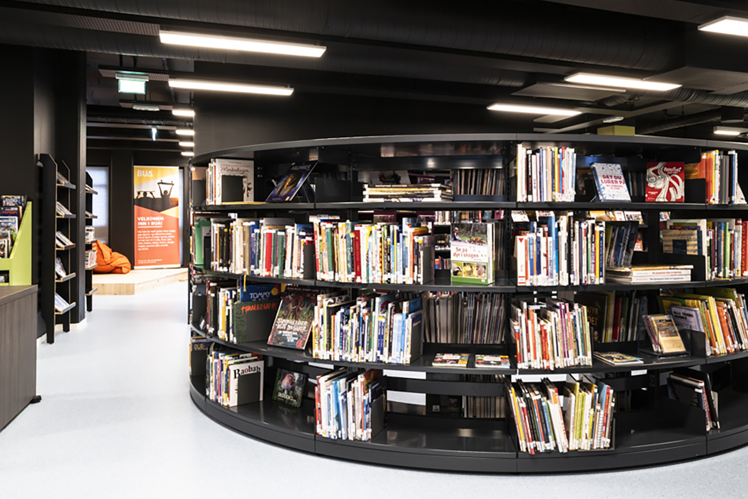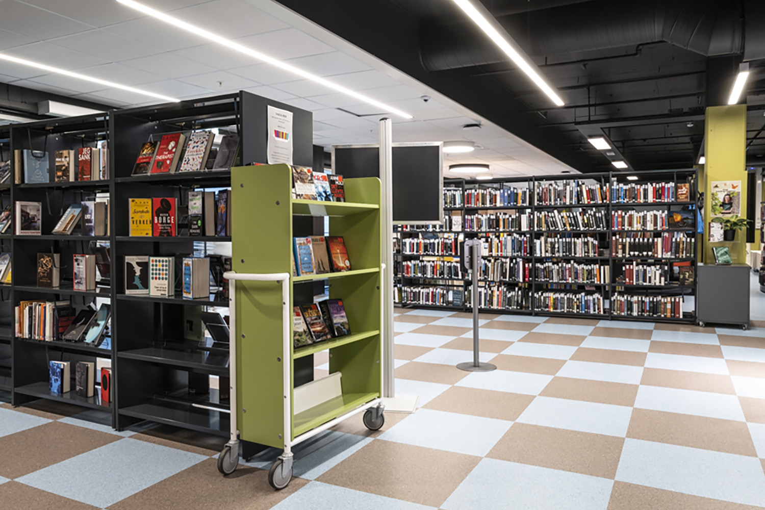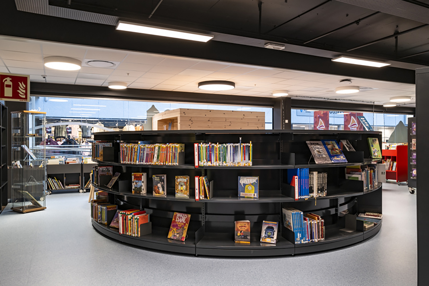 Da biblioteket skal udfylde flere funktioner, er medarbejdere og besøgende afhængige af fleksibilitet. Mange reoler og udstillingspodier har hjul, så de let kan flyttes. I børnebiblioteket giver farverige krybber og runde, lave reoler med integrerede siddepladser mulighed for fordybelse i bøgernes verden.