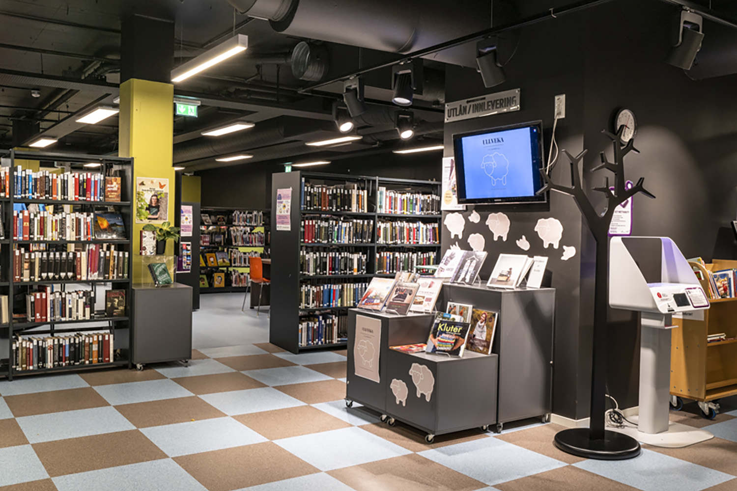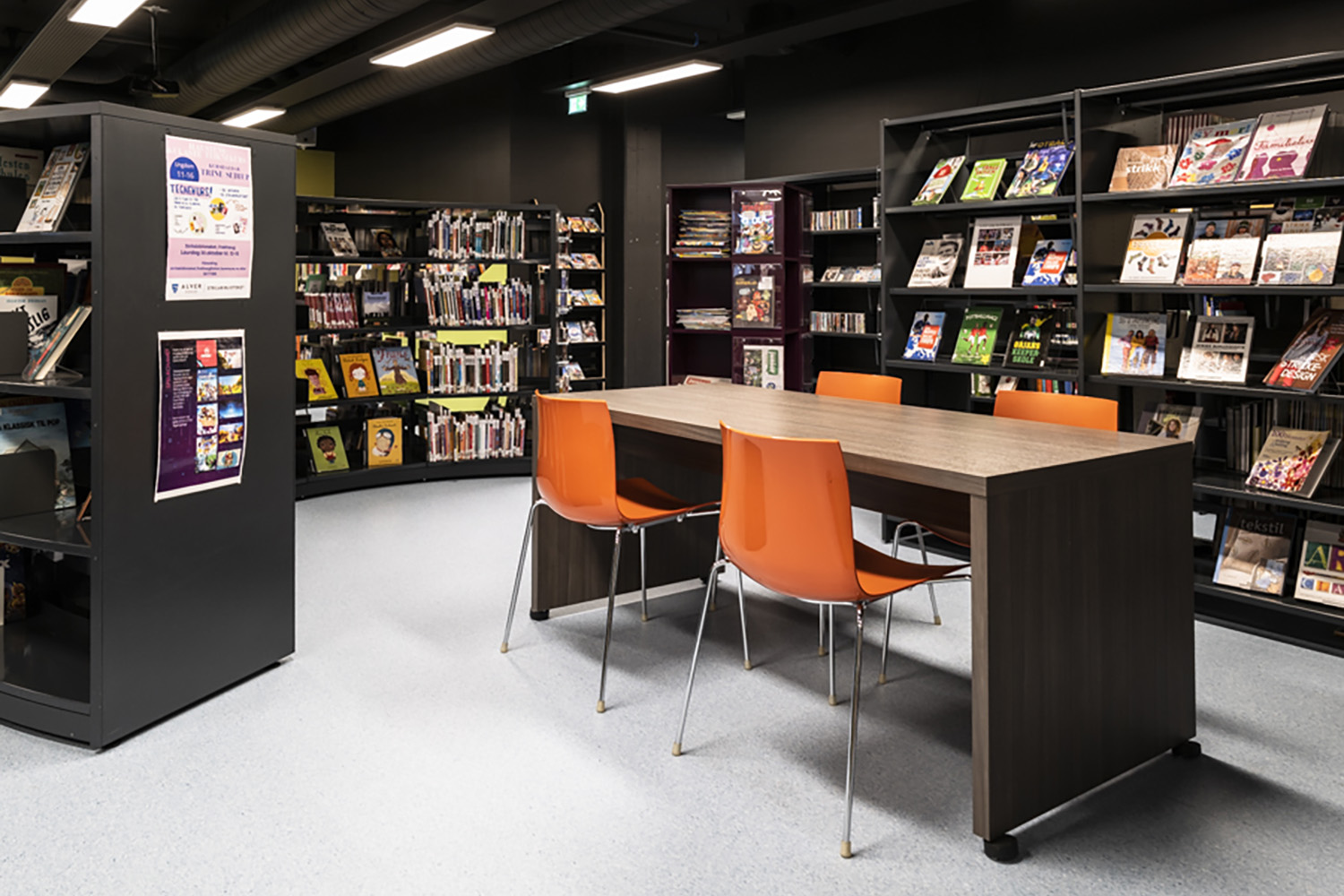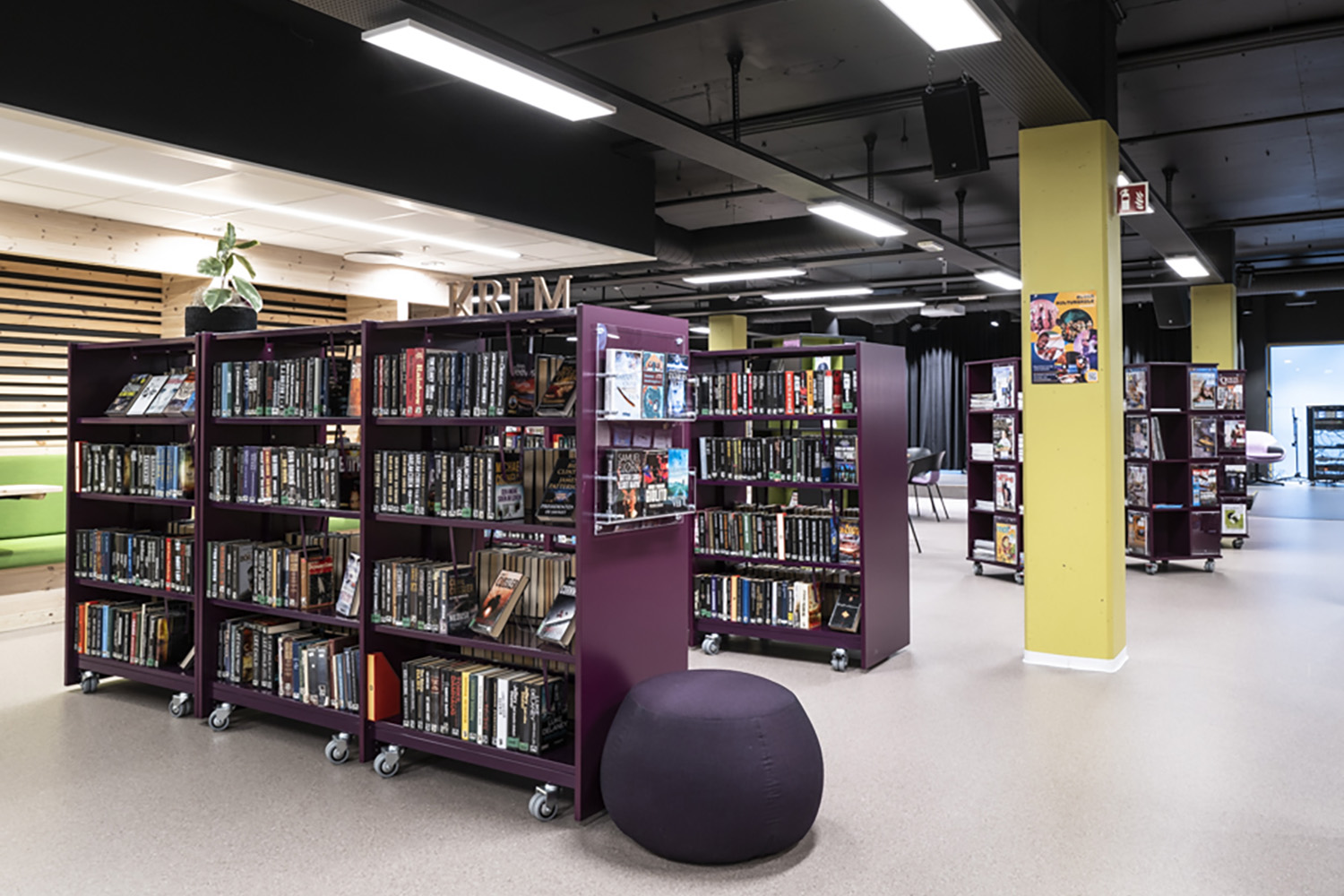 Da biblioteket skal udfylde flere funktioner, er medarbejdere og besøgende afhængige af fleksibilitet. Mange reoler og udstillingspodier har hjul, så de let kan flyttes. I børnebiblioteket giver farverige krybber og runde, lave reoler med integrerede siddepladser mulighed for fordybelse i bøgernes verden.