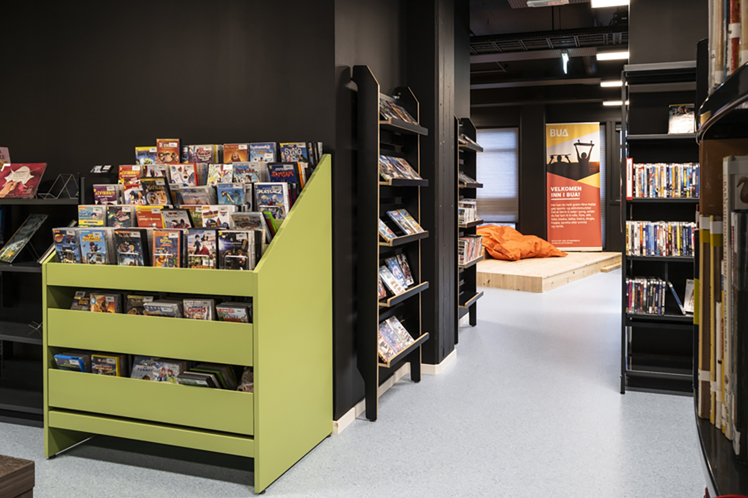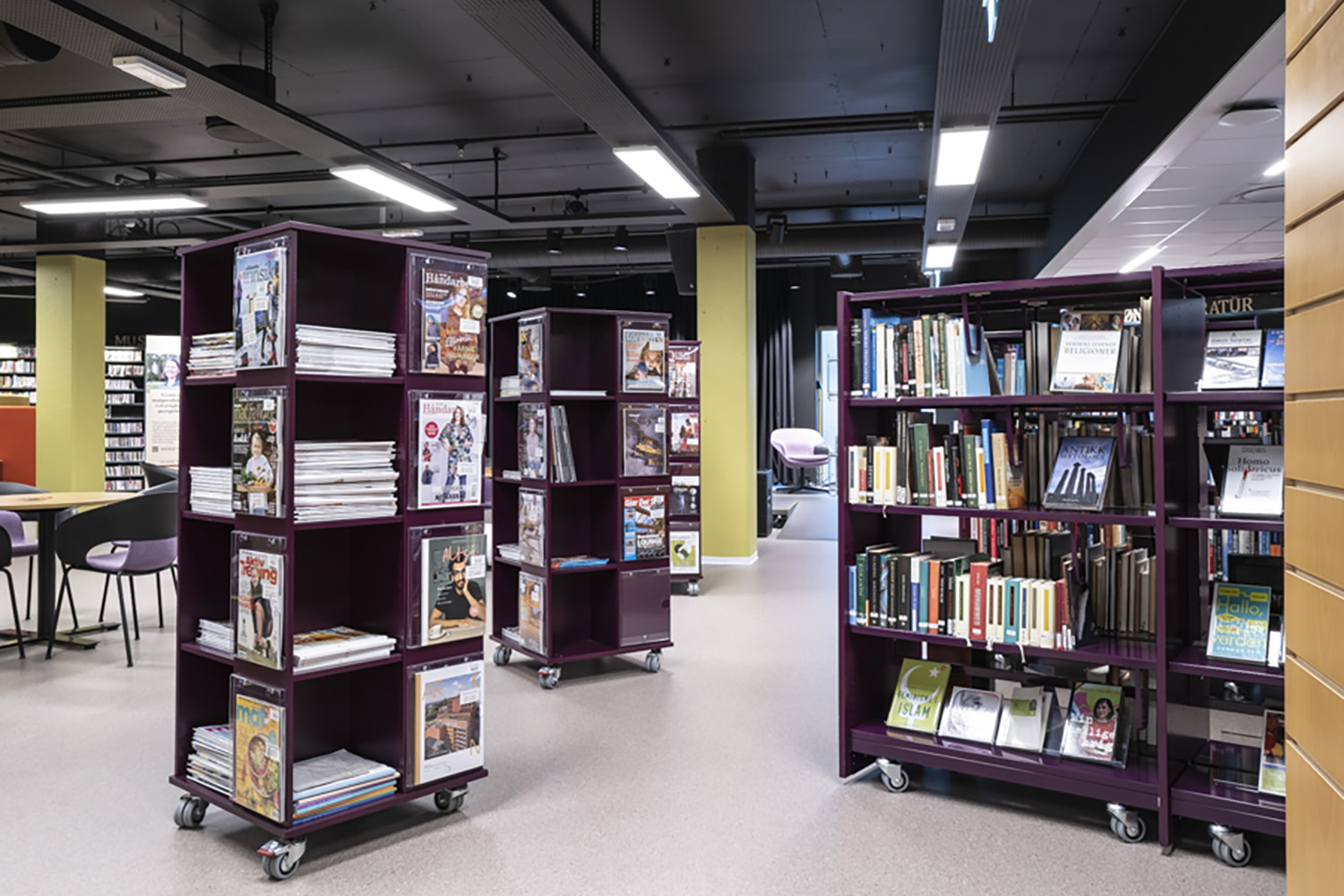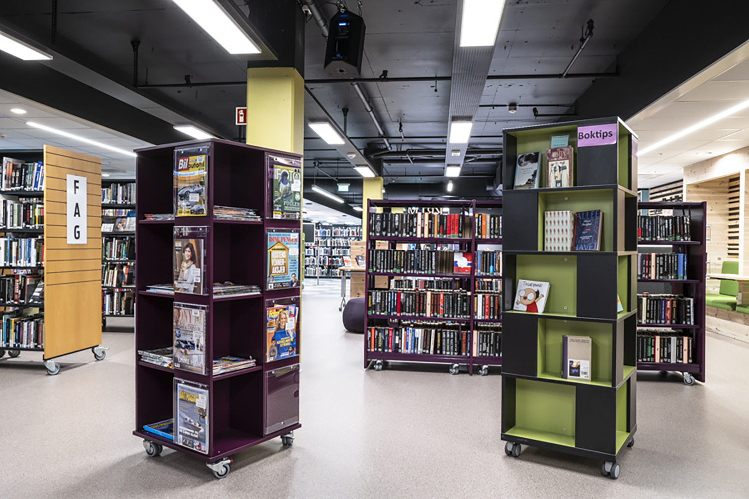 For at bløde indretningen op er der i høj grad også brugt mobile udstillingstårne i specialmalede farver, der passer til resten af biblioteksindretningen.