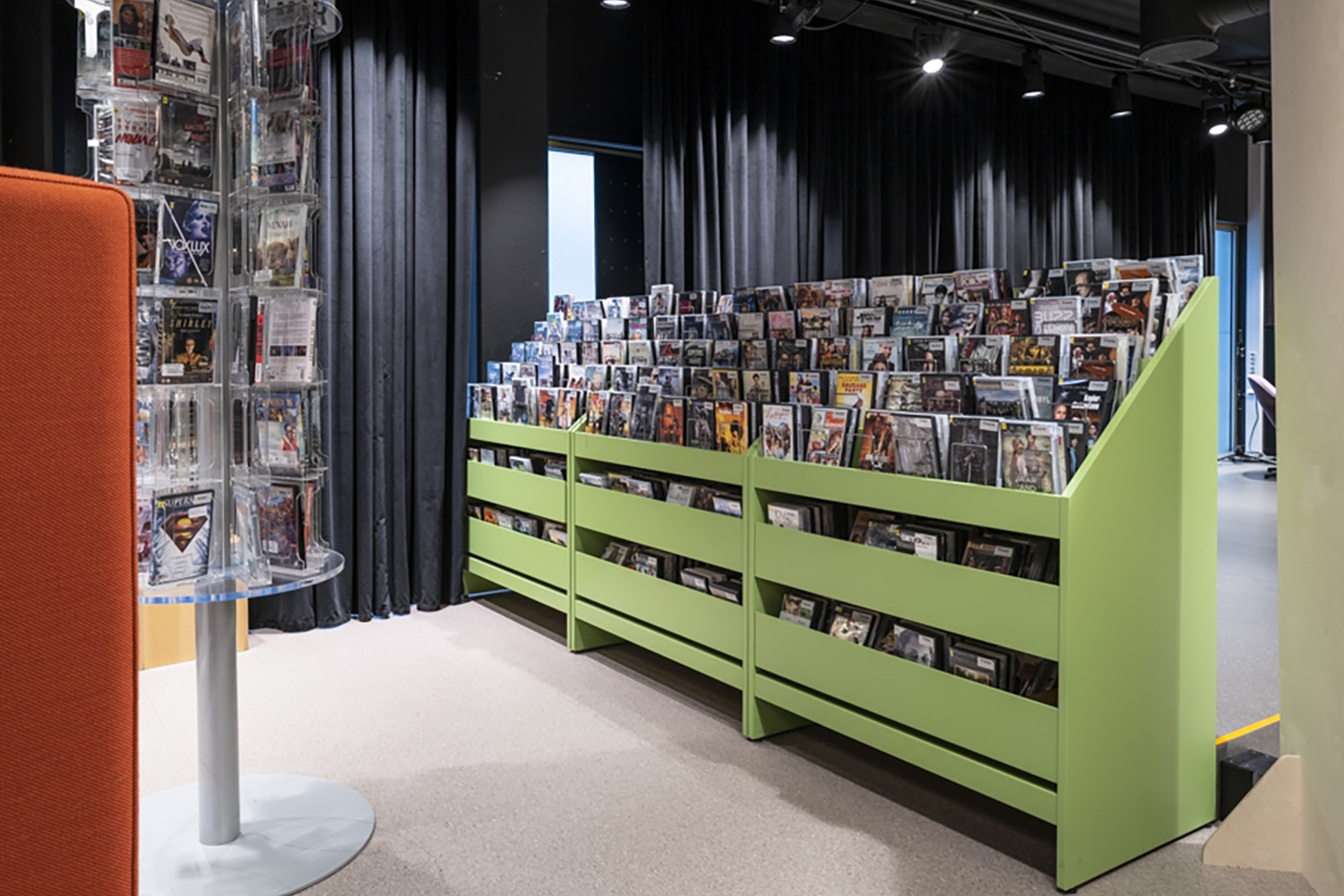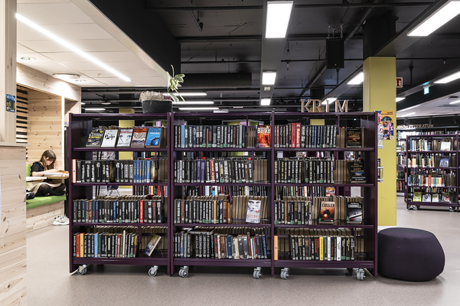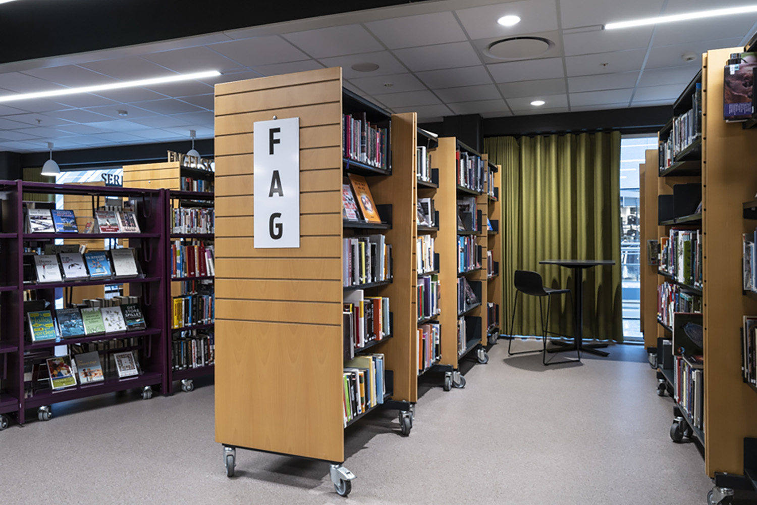 For at bløde indretningen op er der i høj grad også brugt mobile udstillingstårne i specialmalede farver, der passer til resten af biblioteksindretningen.