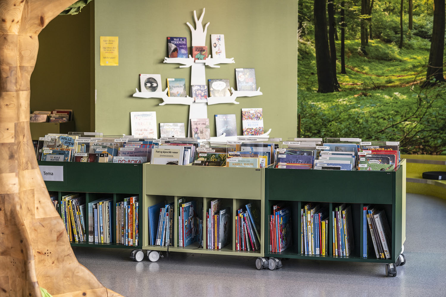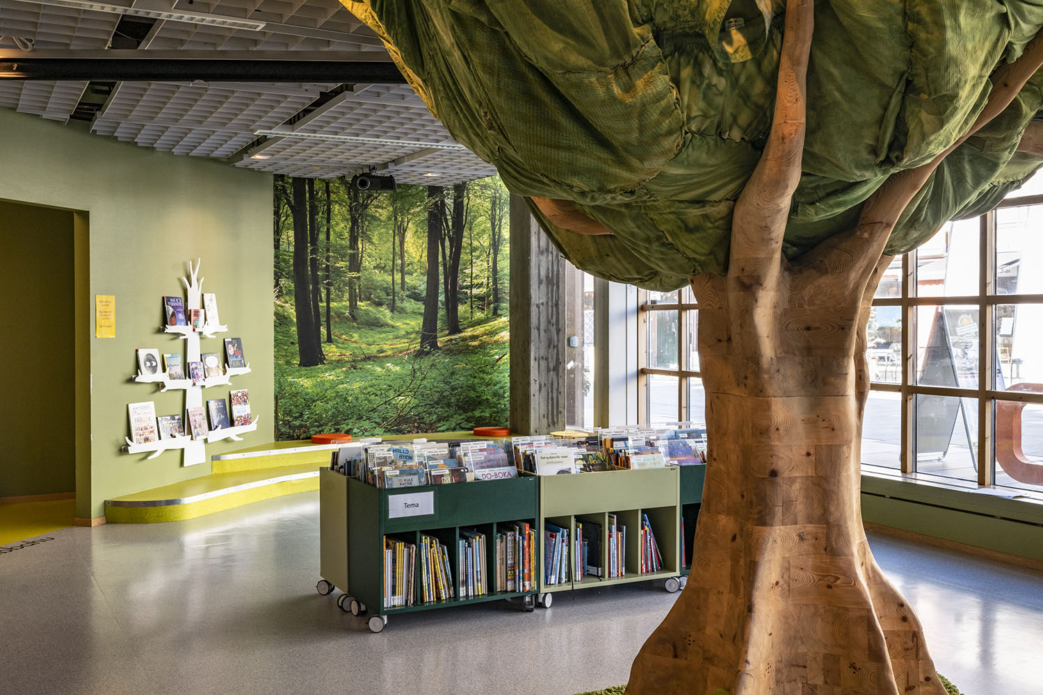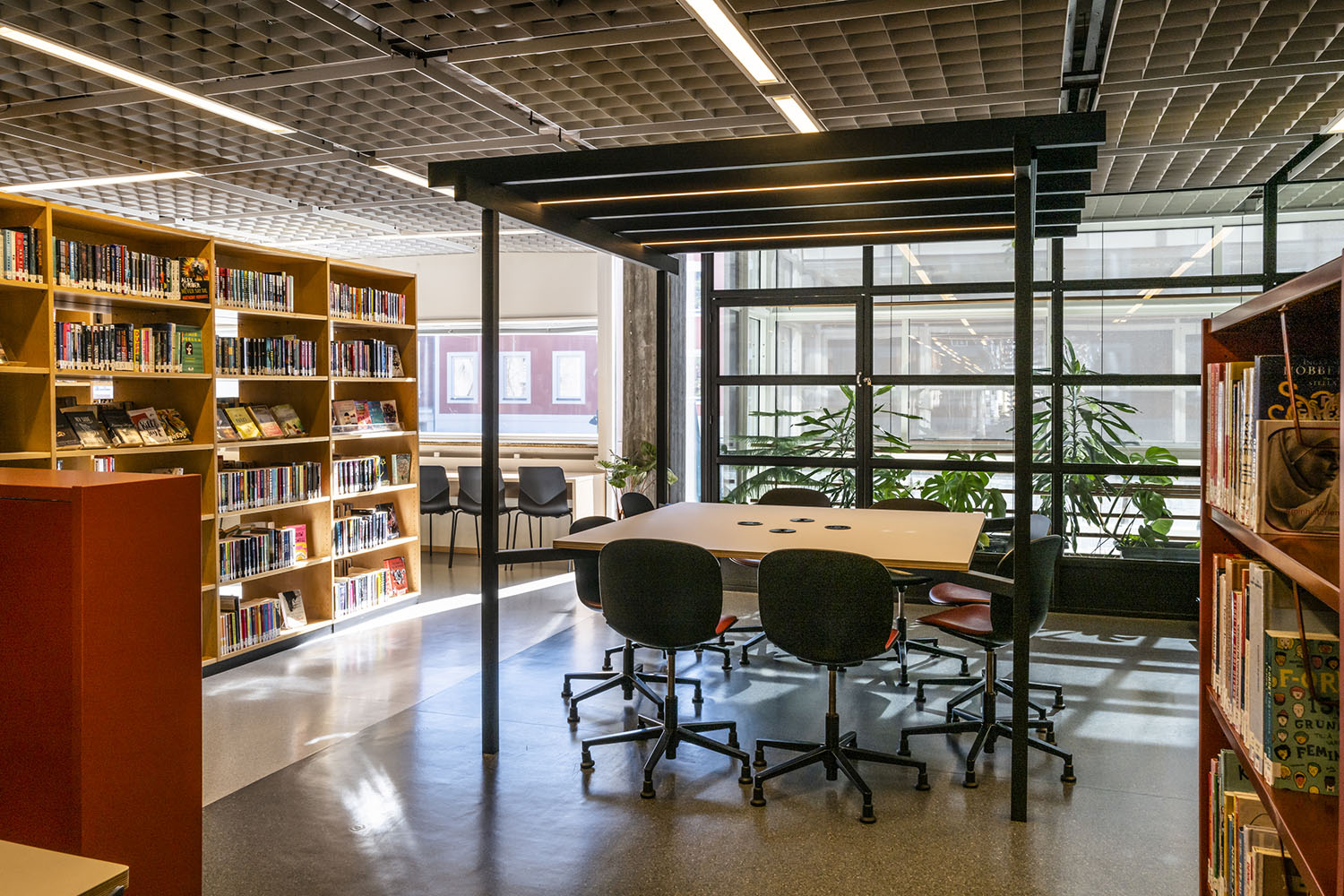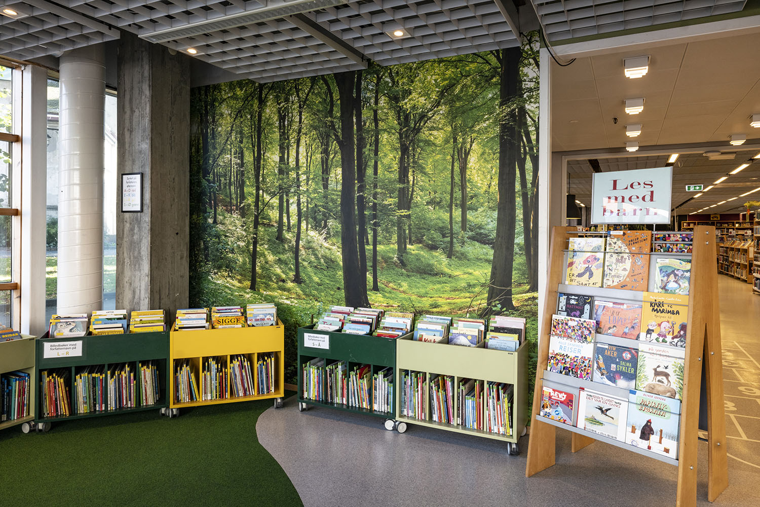 Biblioteket er indrettet med både genbrug, ombygning af eksisterende møbler og nye reoler. De nye farverige reoler skaber en lille oase i fin kontrast til eksisterende reoler i natur. Den eksisterende sofa som tidligere havde en anden form et andet sted i biblioteket er blevet re-designet til en iøjnefaldende siddeplads ved hjælp af nye rygelementer i flere, harmoniske farver.