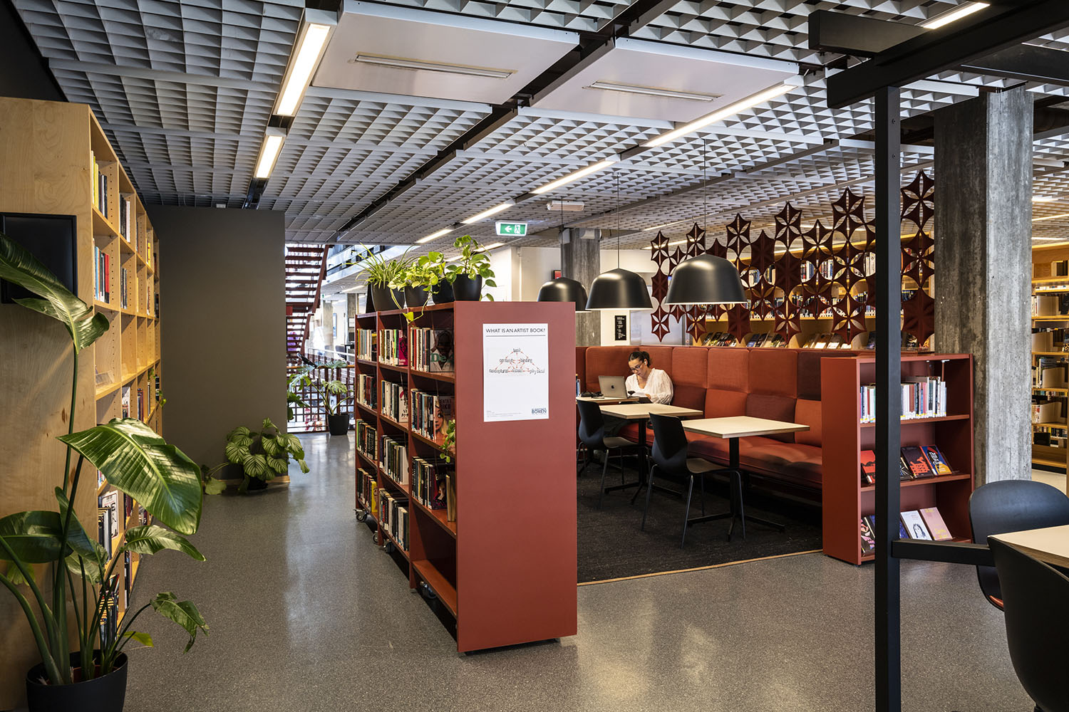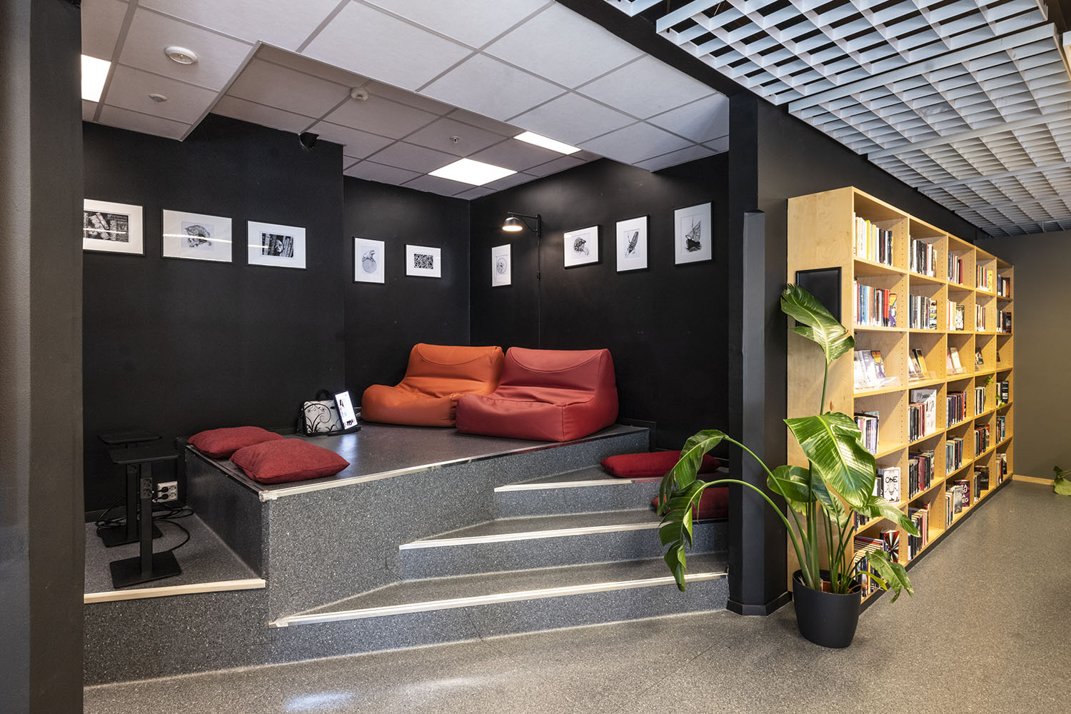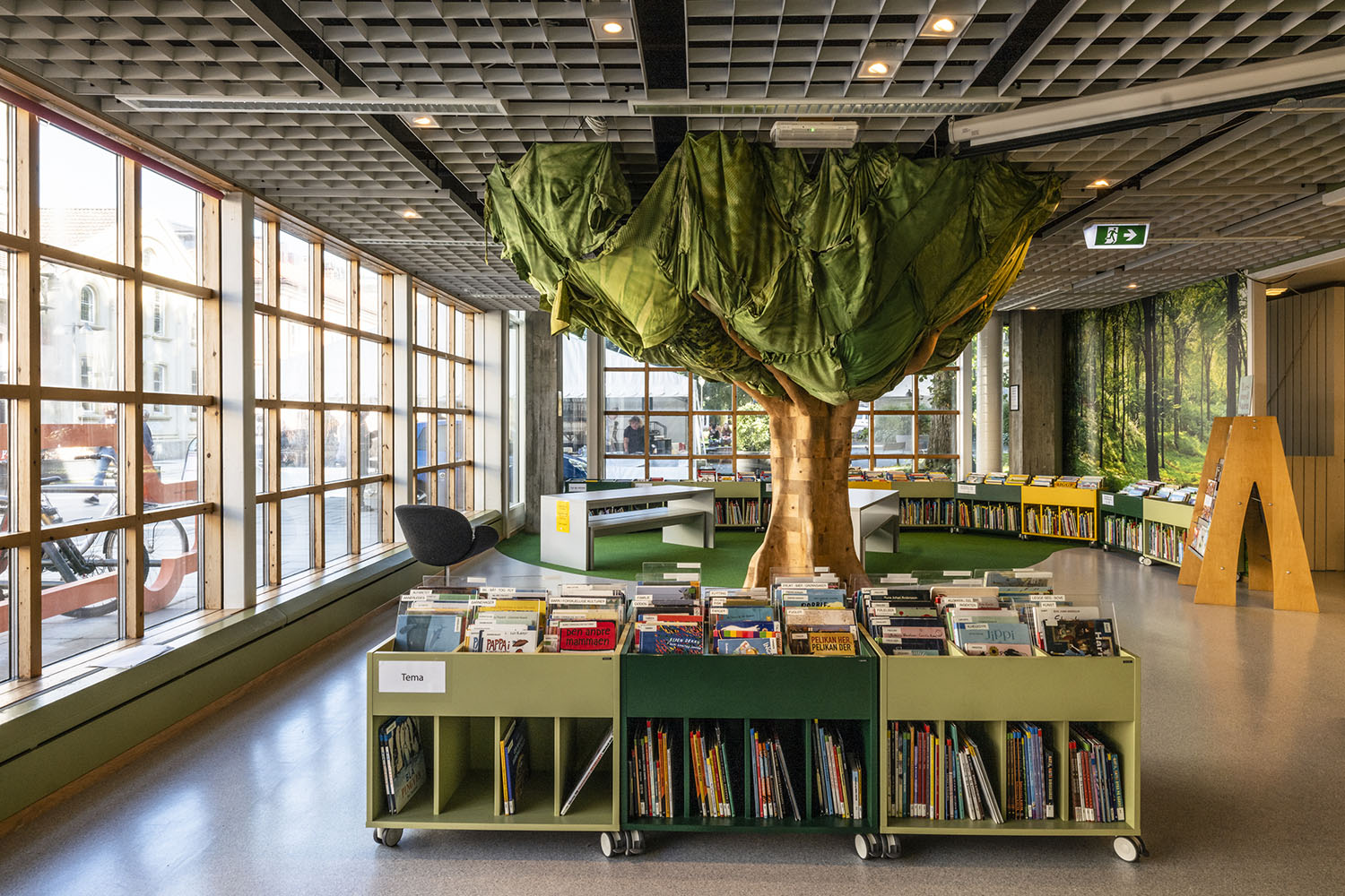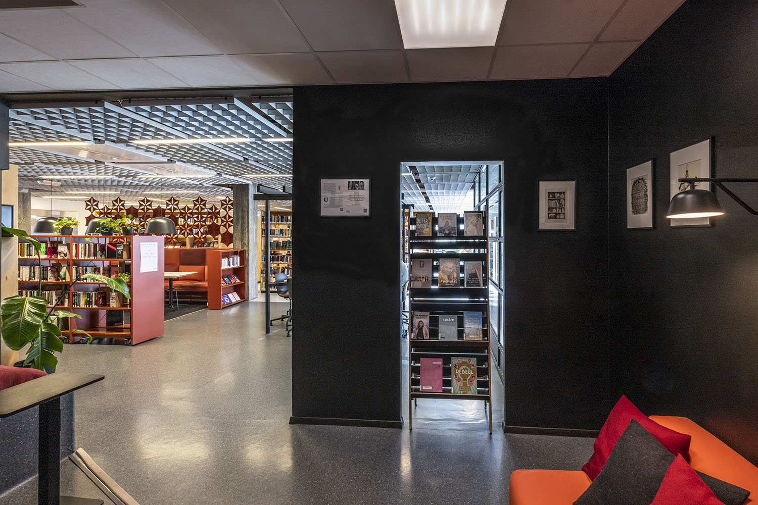 Biblioteket er indrettet med både genbrug, ombygning af eksisterende møbler og nye reoler. De nye farverige reoler skaber en lille oase i fin kontrast til eksisterende reoler i natur. Den eksisterende sofa som tidligere havde en anden form et andet sted i biblioteket er blevet re-designet til en iøjnefaldende siddeplads ved hjælp af nye rygelementer i flere, harmoniske farver.