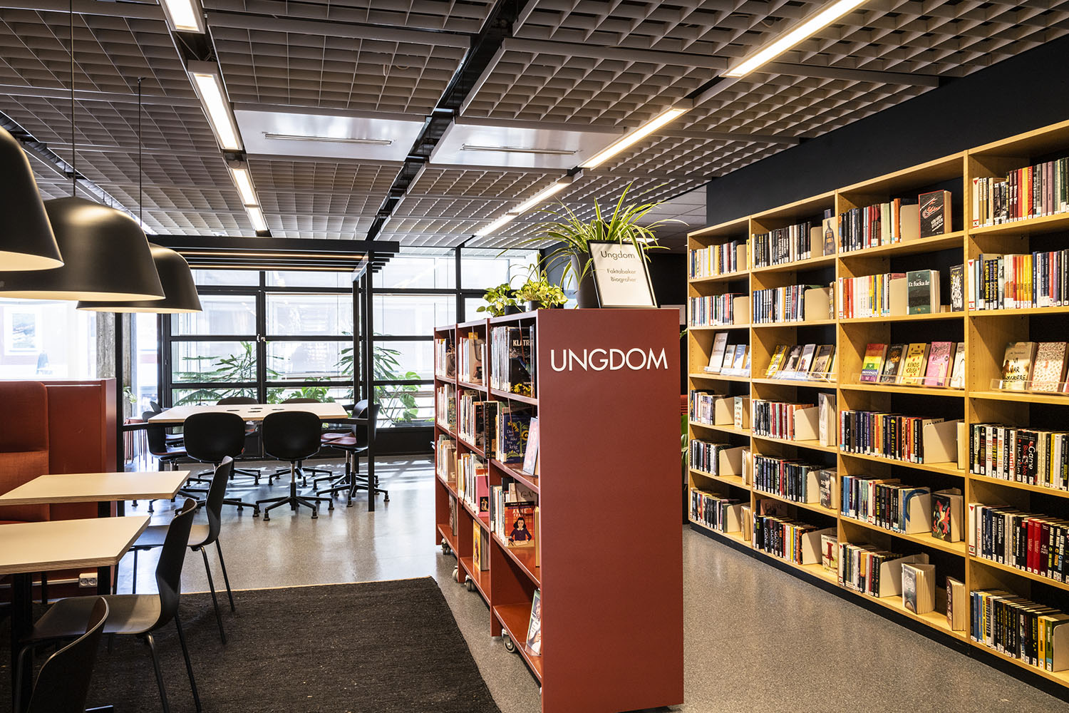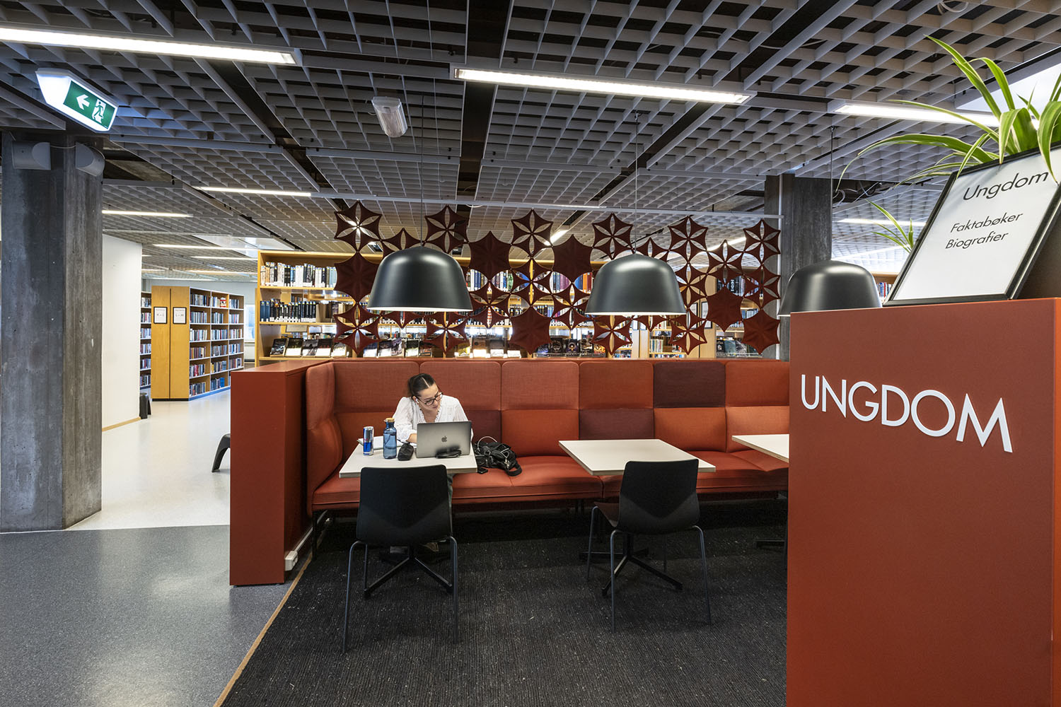 Ønsket for ungdomsafdelingen var at skabe et hyggeligt og lidt afskærmet område fra resten af biblioteket. Her kan de unge mødes til socialt samvær, og både siddepladserne og arbejdsbordene til gruppe- og skolearbejde er meget populære. Samtidig er vejen til fiktion i voksenafdelingen kort.