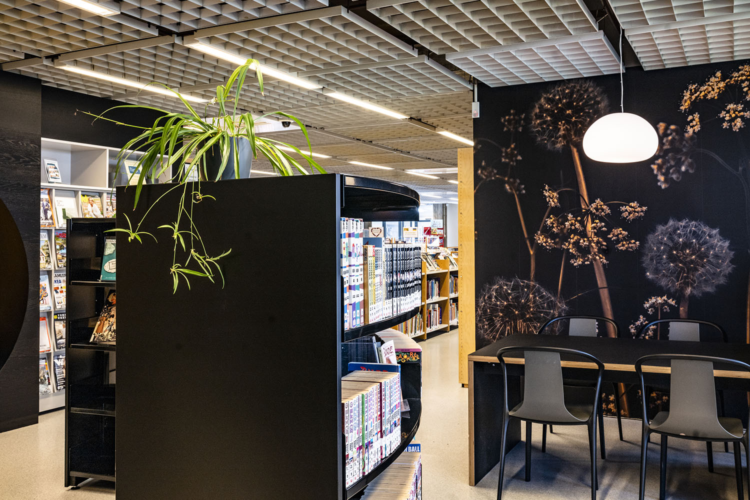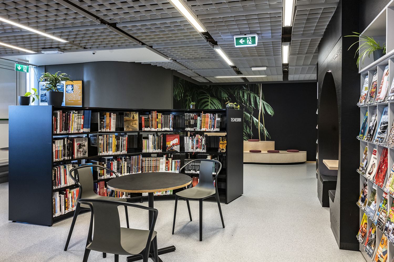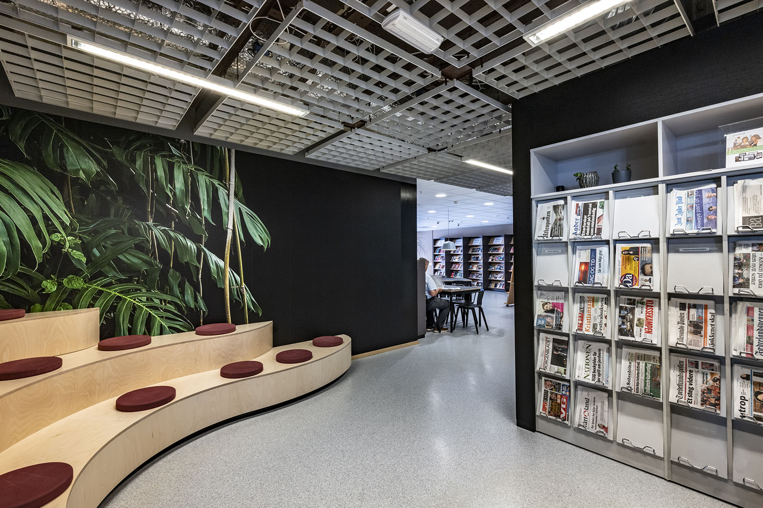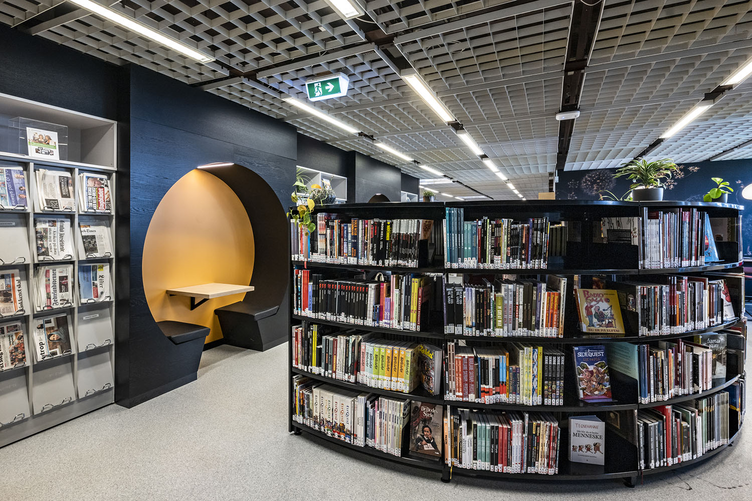 I den nye afdeling med aviser, tidsskrifter og tegneserier skaber runde reoler et rum i rummet og giver et luftigt udtryk med den lave højde. Den runde form er taget med op i den iøjnefaldende siddeplads mod væggen samt i siddegruppen på gulvet.