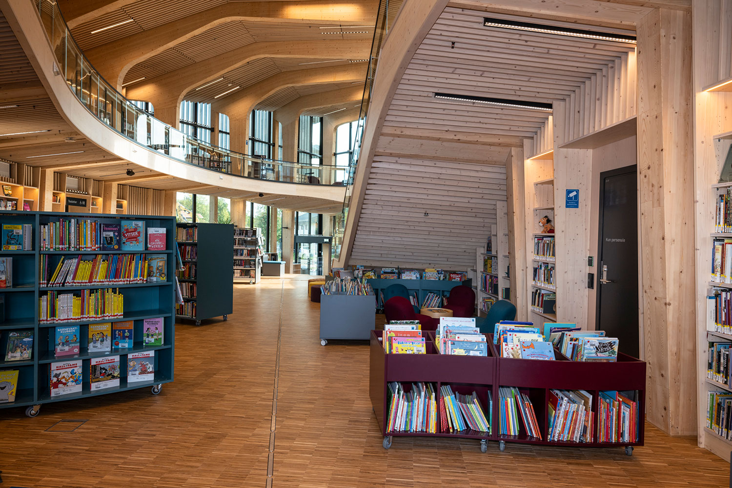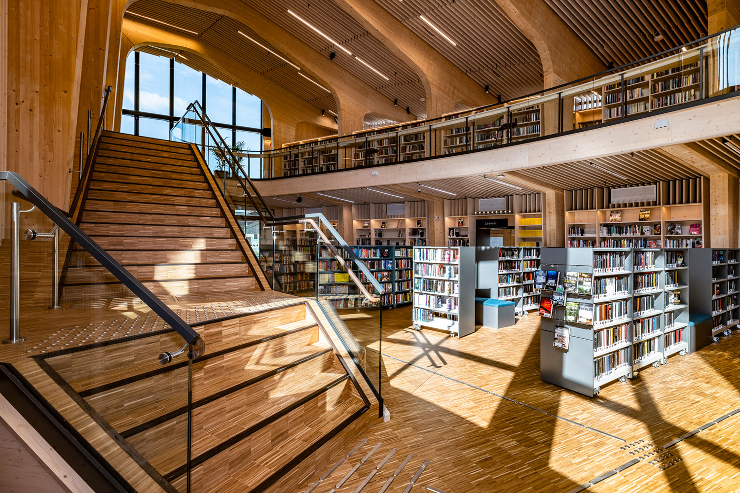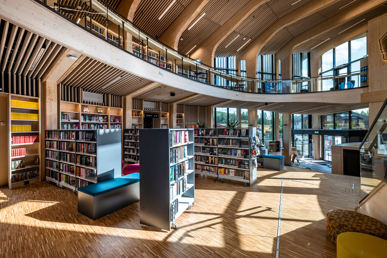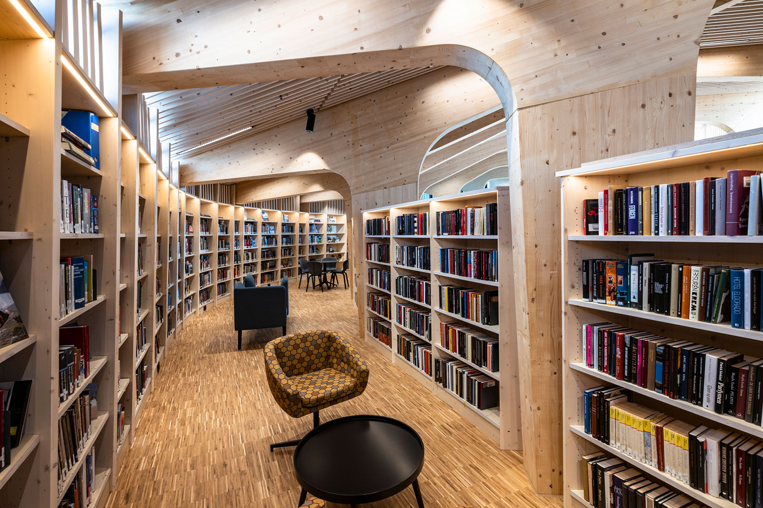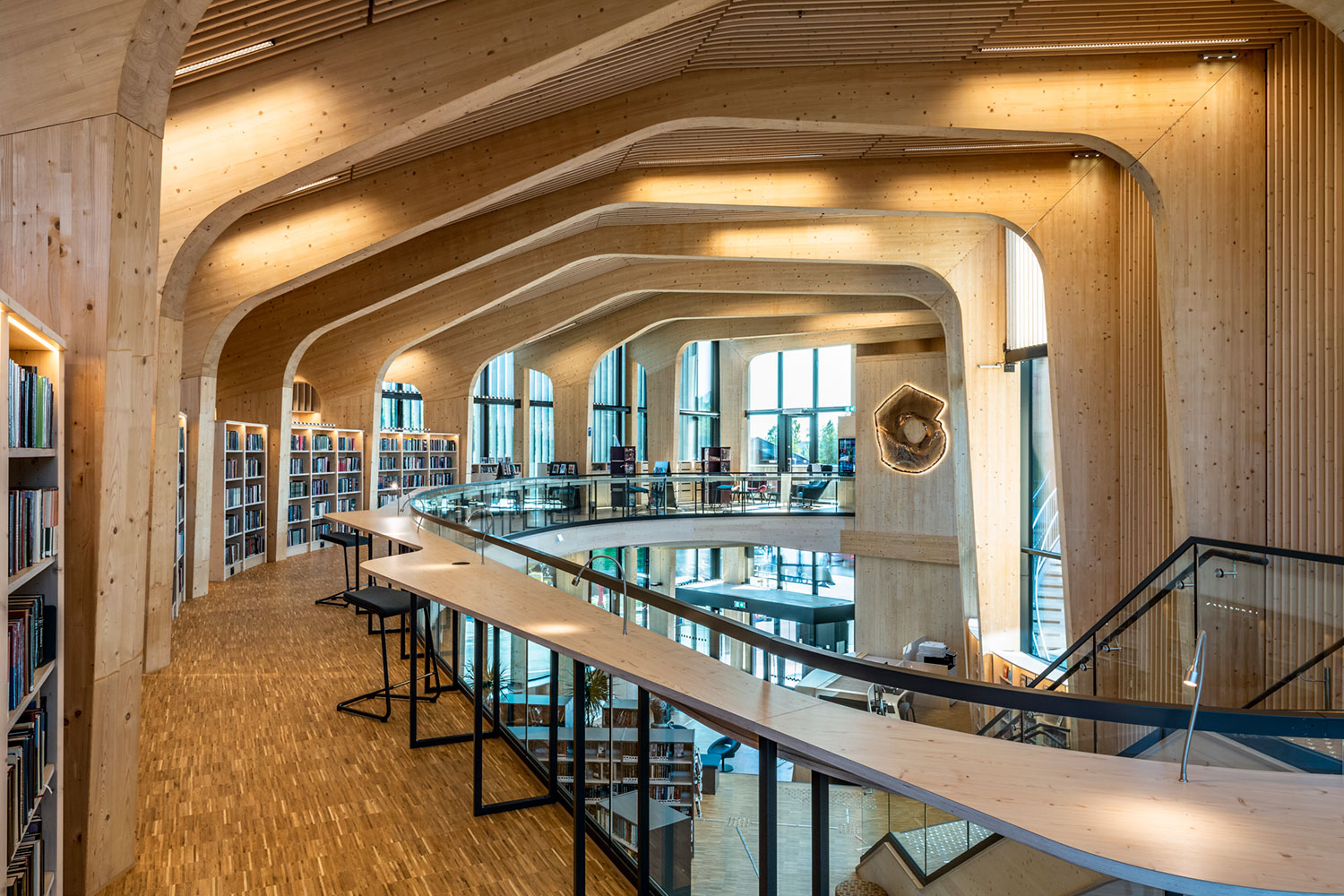 Den organiskformede og spektakulære bygning er blevet et trækplaster for både litteratur- og arkitektinteresserede. Bygningen er udført med bærende konstruktioner i massivt træ med et åbent atrium i midten.
