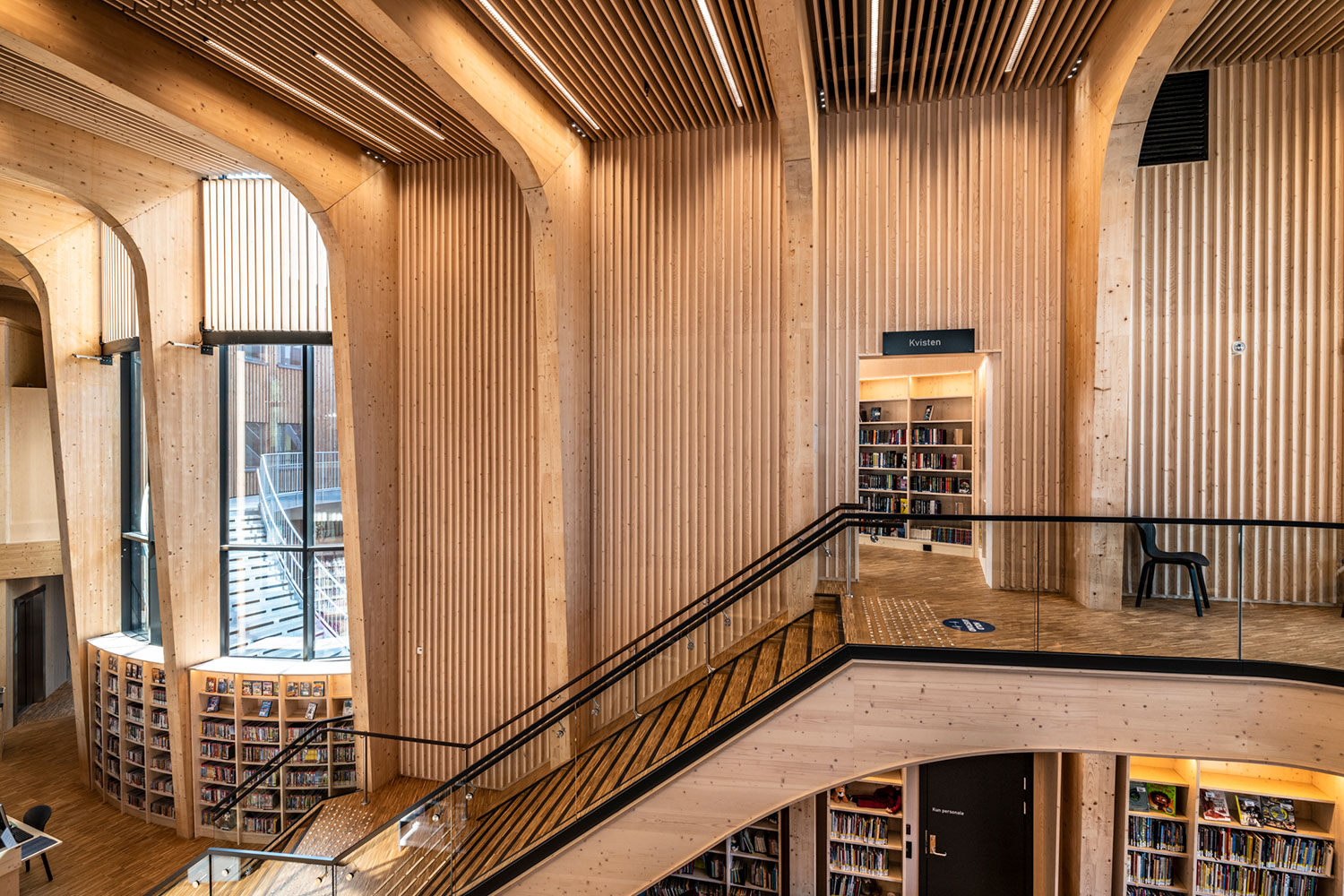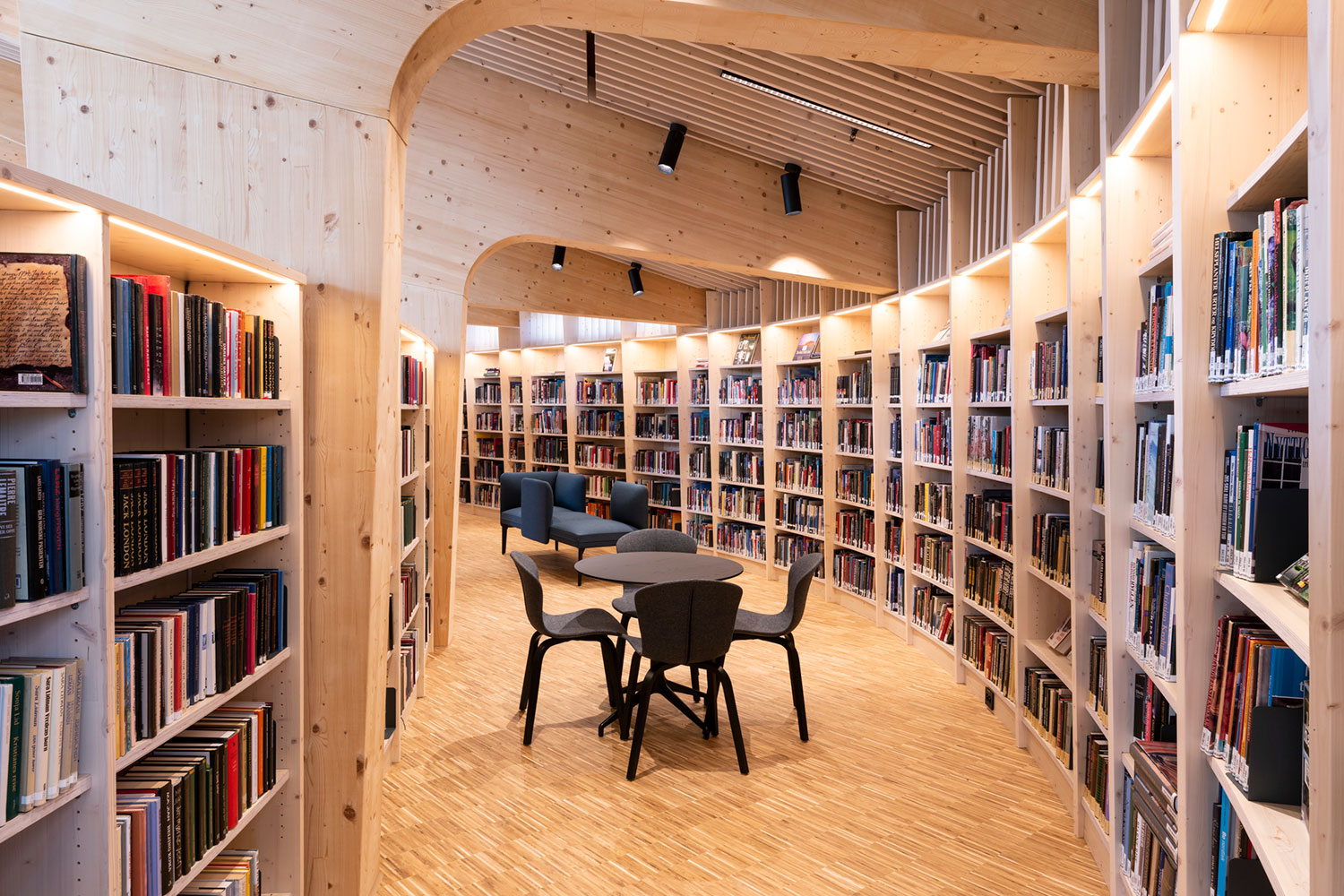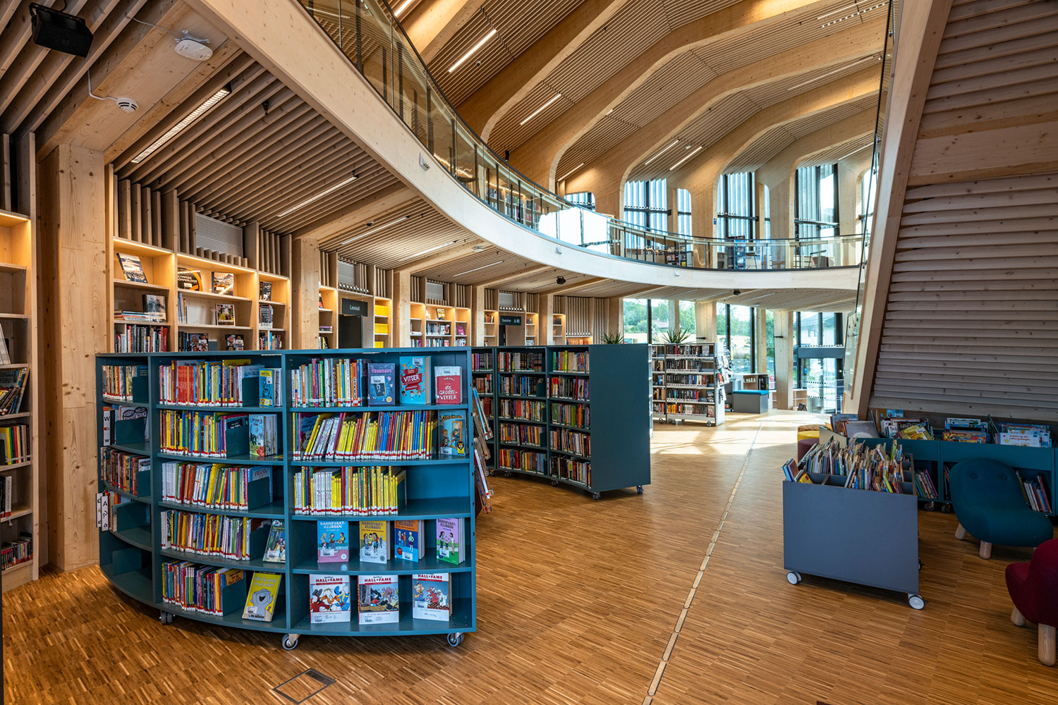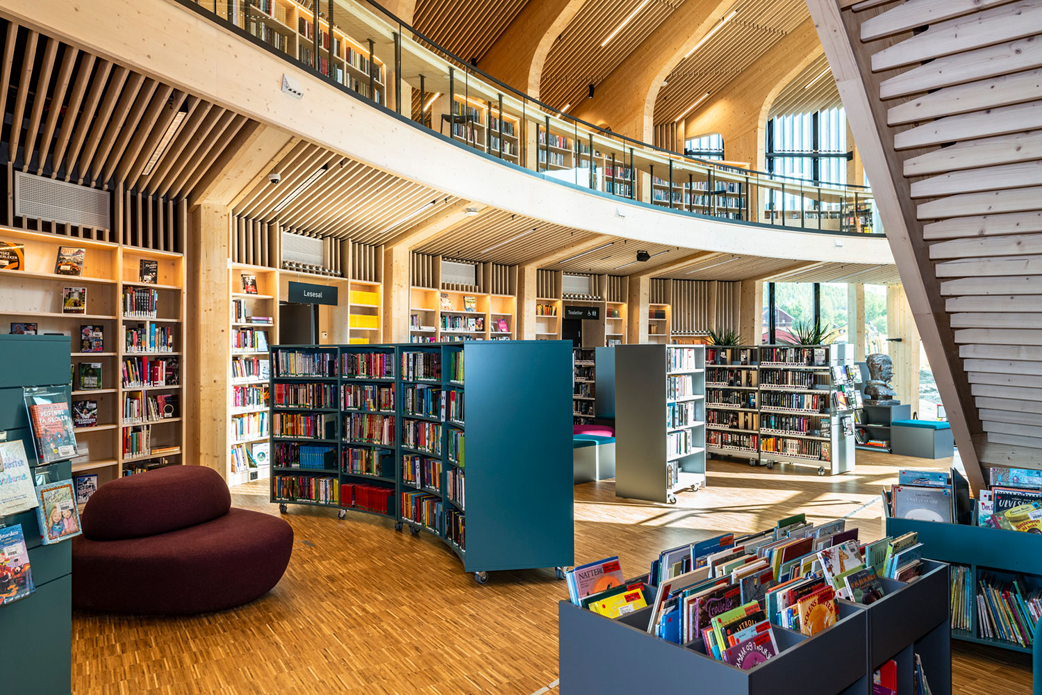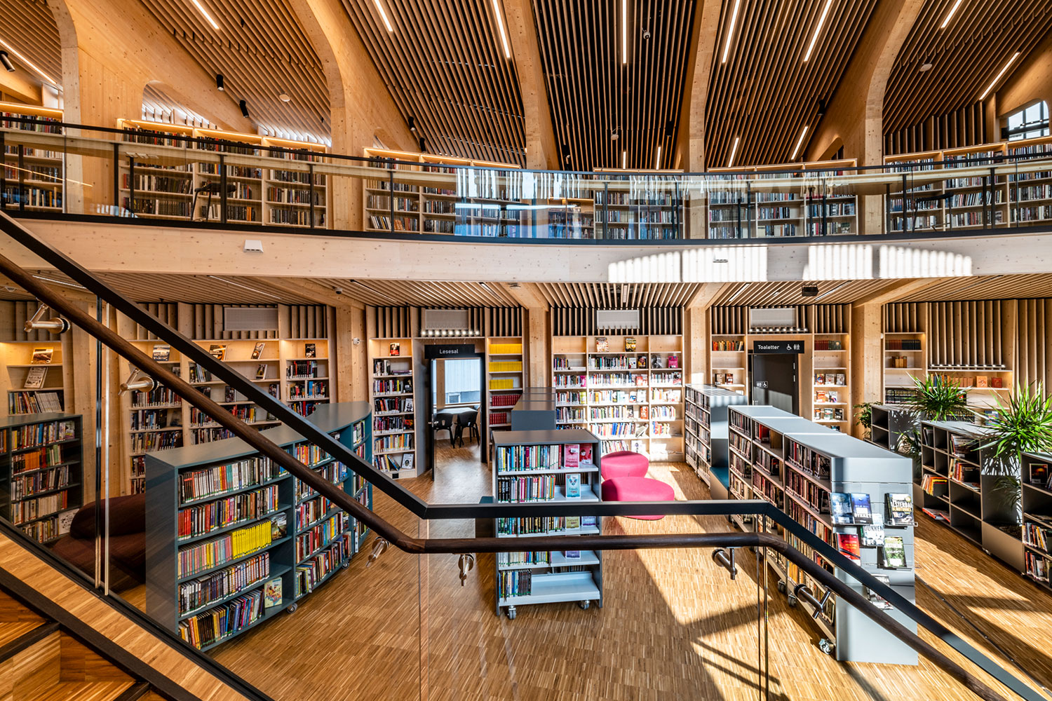 Den organiskformede og spektakulære bygning er blevet et trækplaster for både litteratur- og arkitektinteresserede. Bygningen er udført med bærende konstruktioner i massivt træ med et åbent atrium i midten.