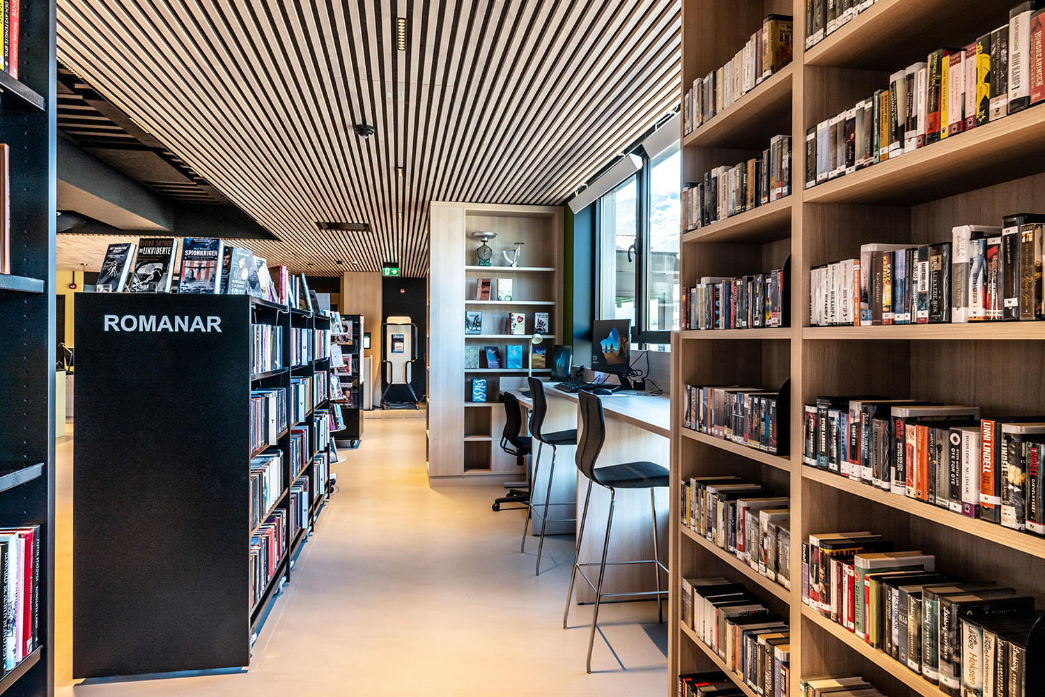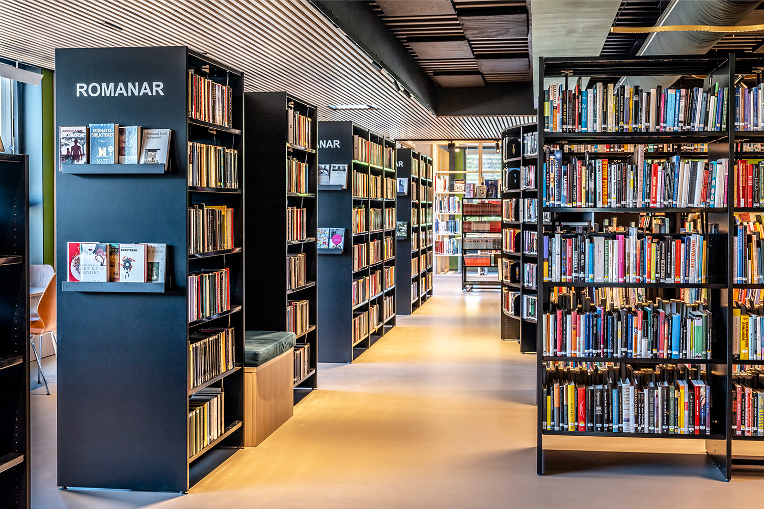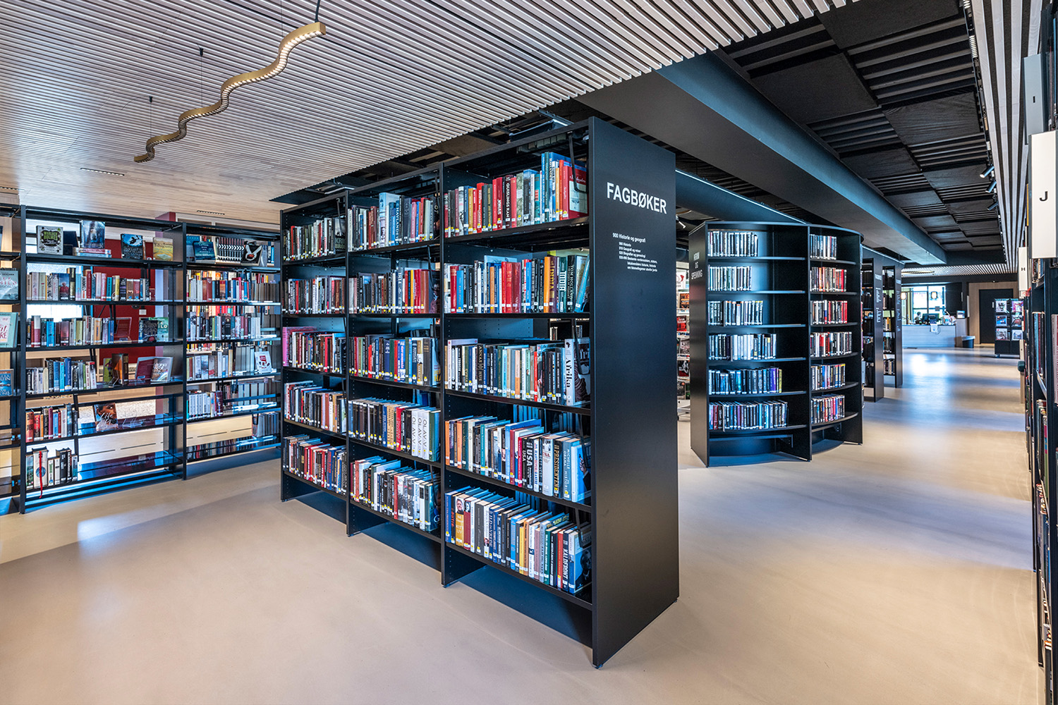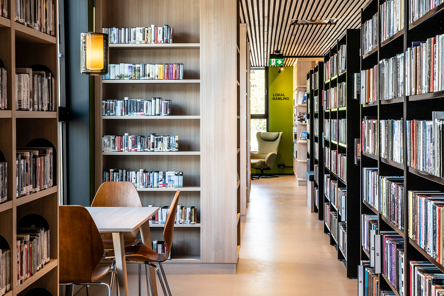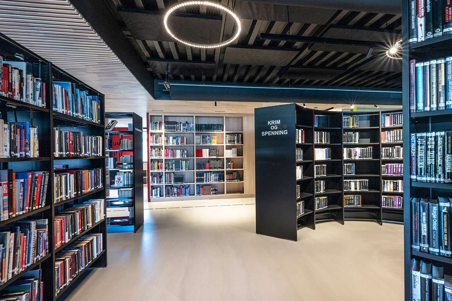 De sorte reoler midt i lokalet er leveret af BS Eurobib, men for at udnytte den høje loftshøjde er alle de lyse reoler langs væggene specialdesignet. Biblioteket er blevet et populært sted at sidde sammen med venner, spille spil, læse aviser, studere mv. Biblioteket har desuden udvidet åbningstiderne, så det nu også er muligt at besøge biblioteket i weekenden.