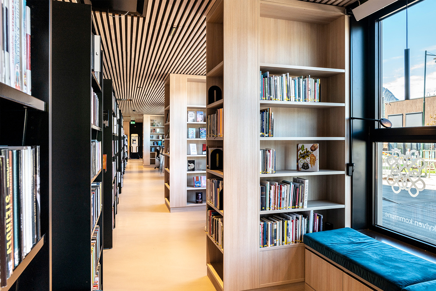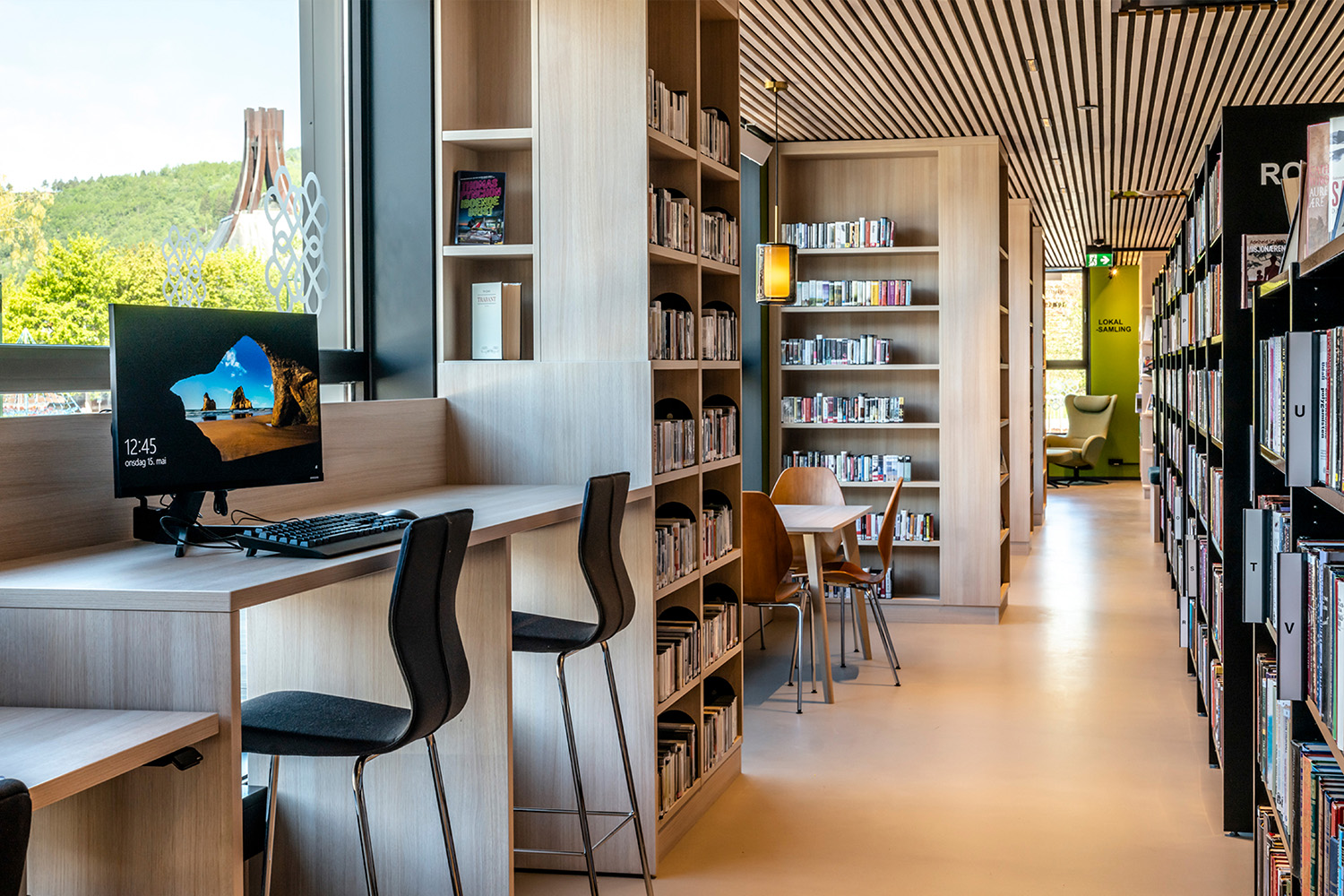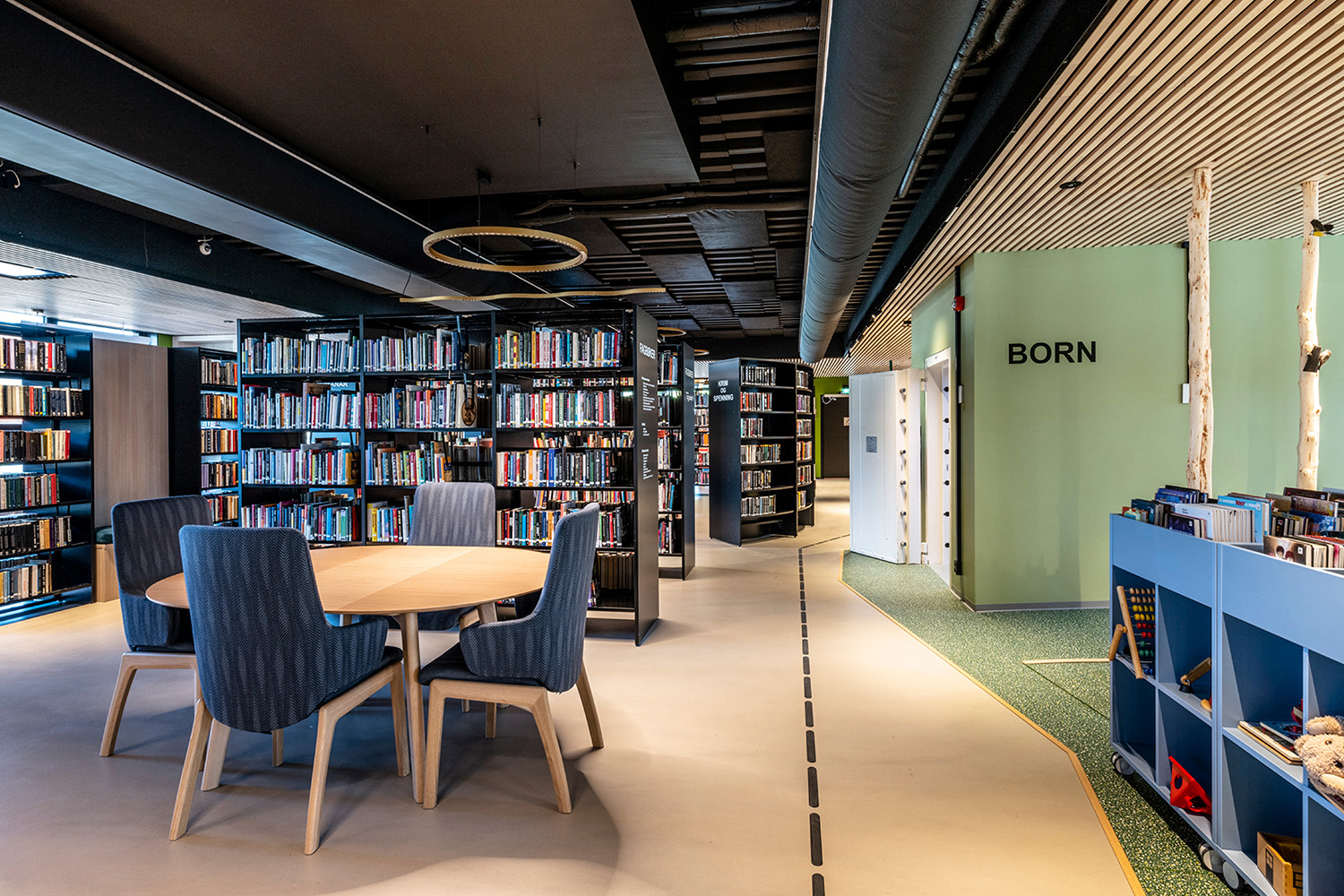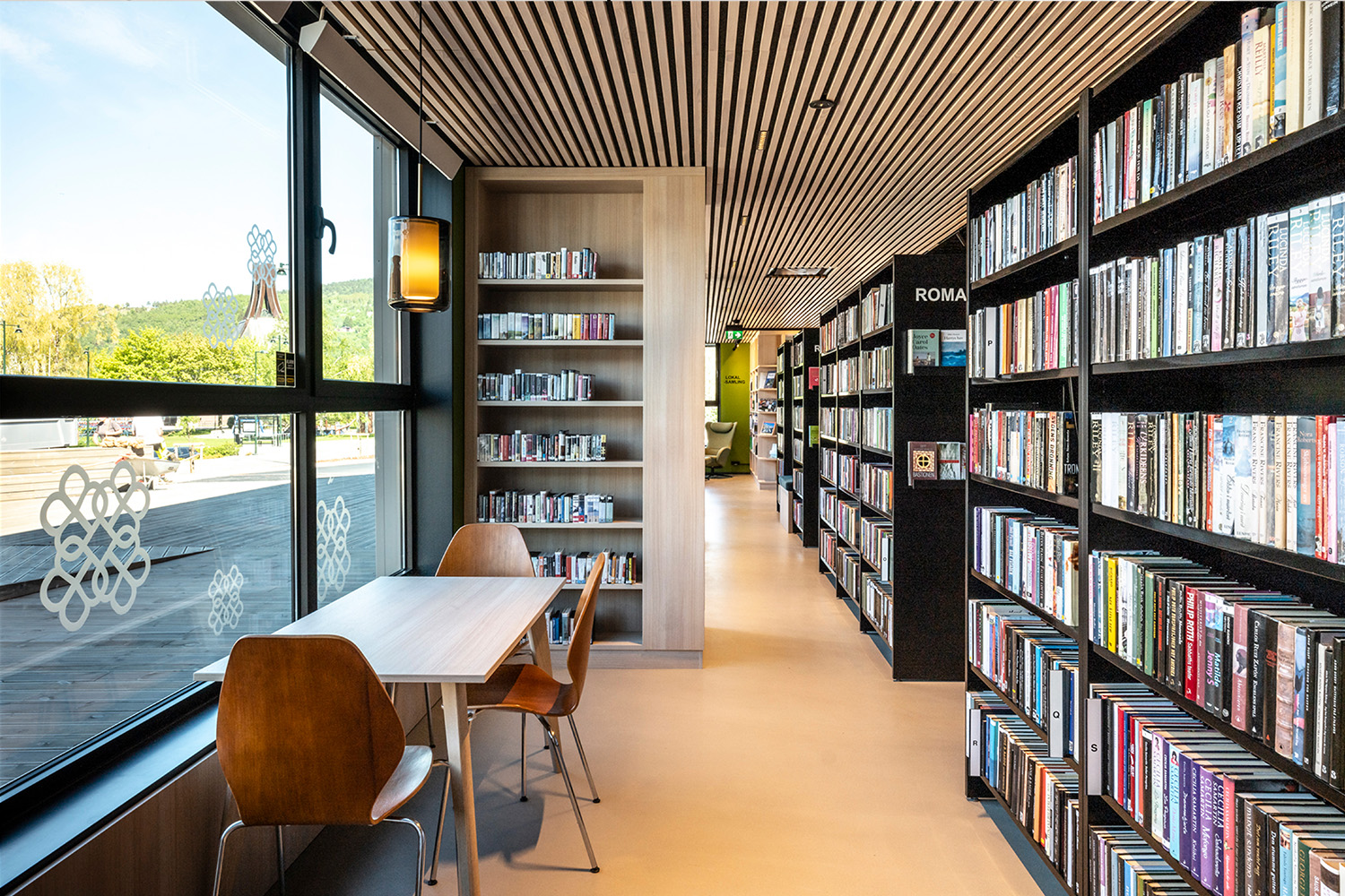 De sorte reoler midt i lokalet er leveret af BS Eurobib, men for at udnytte den høje loftshøjde er alle de lyse reoler langs væggene specialdesignet. Biblioteket er blevet et populært sted at sidde sammen med venner, spille spil, læse aviser, studere mv. Biblioteket har desuden udvidet åbningstiderne, så det nu også er muligt at besøge biblioteket i weekenden.