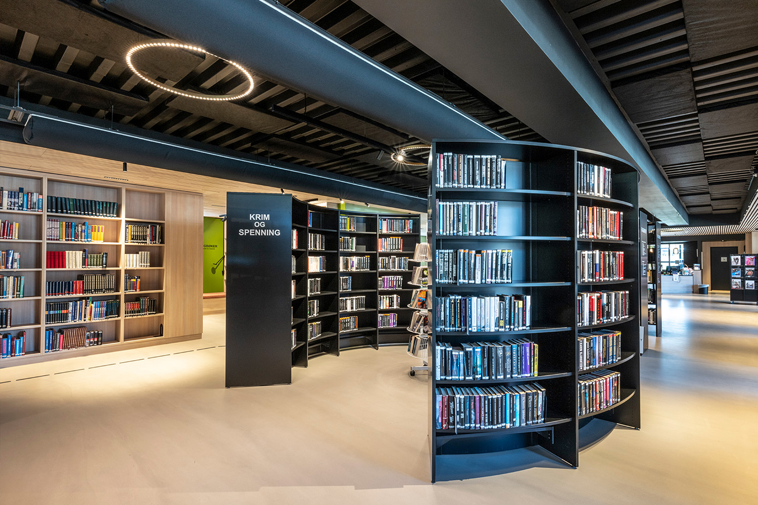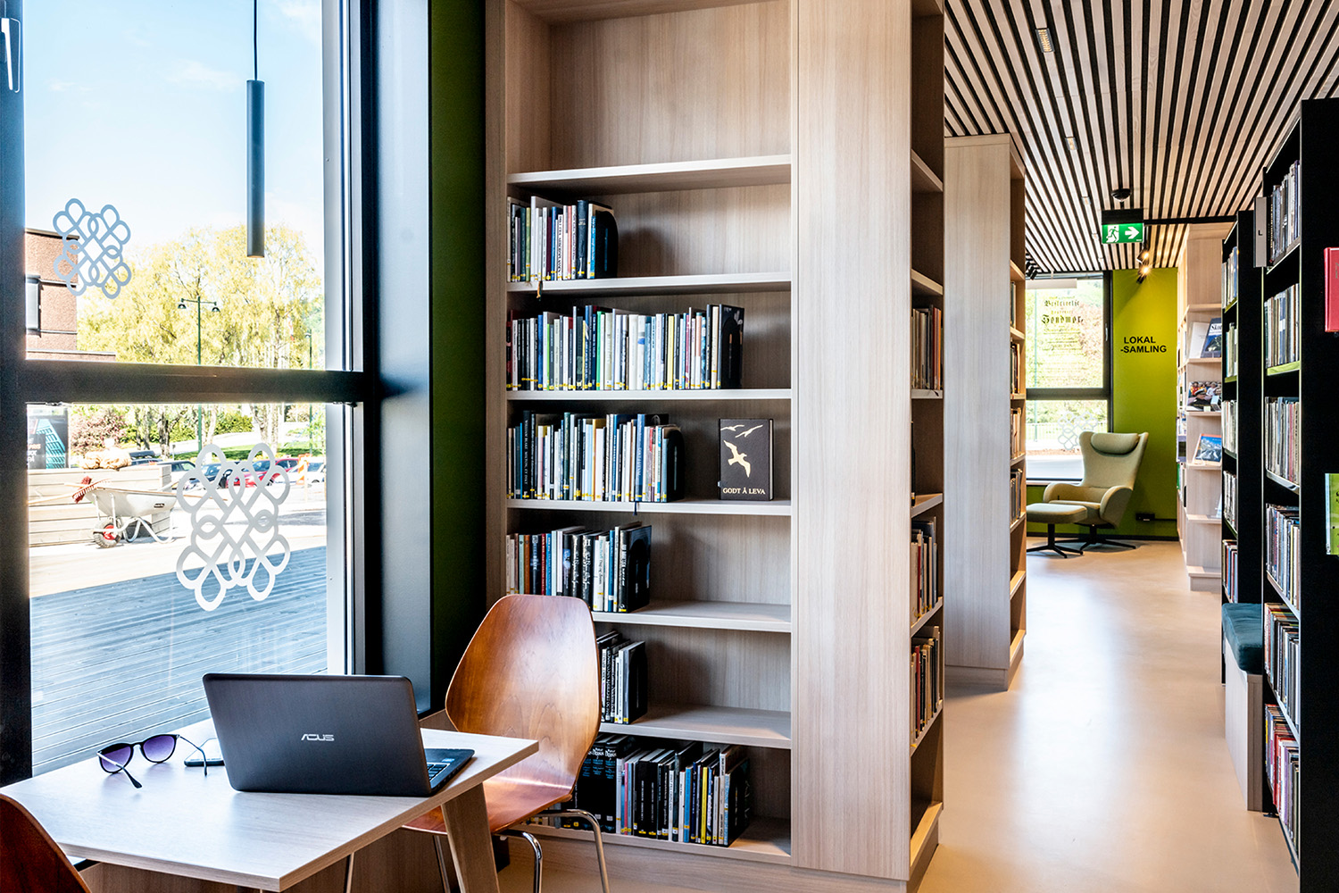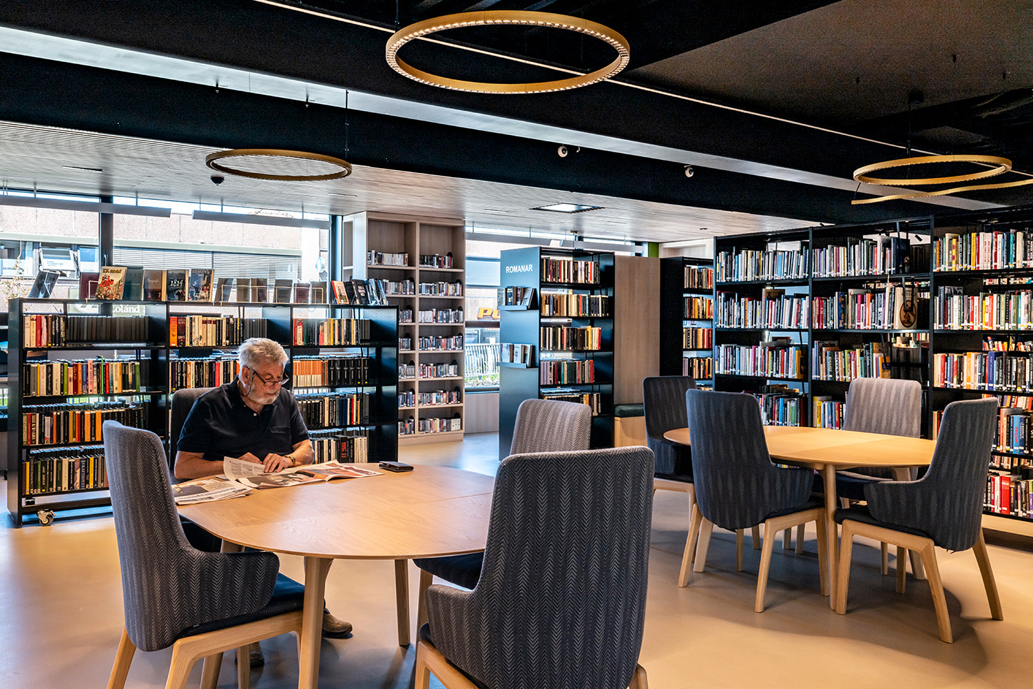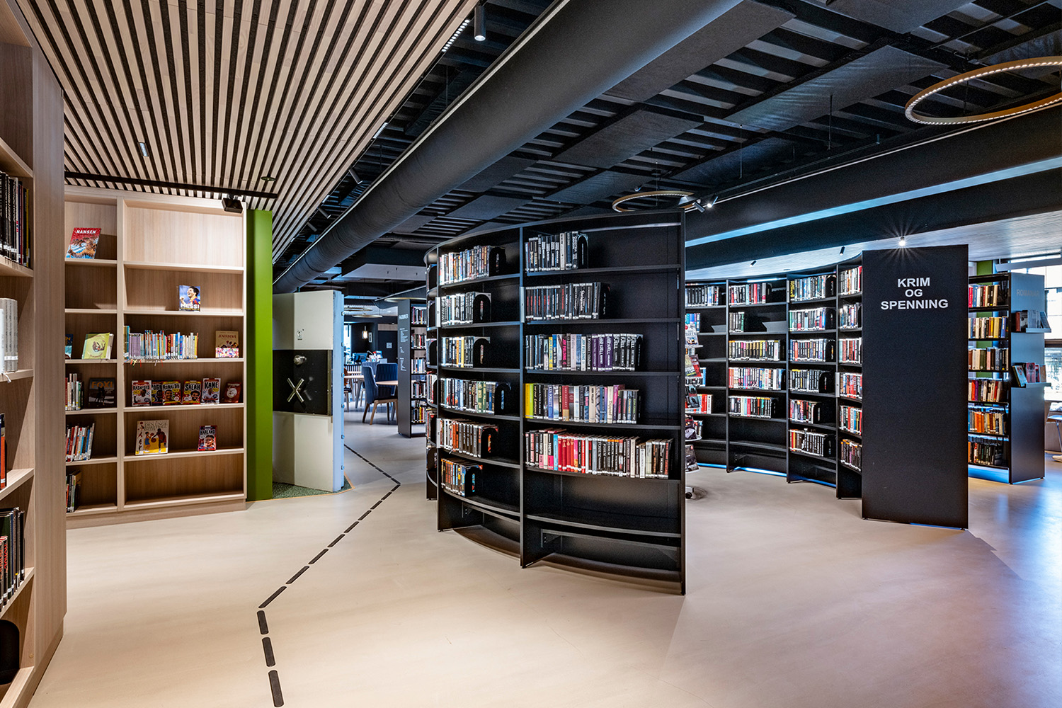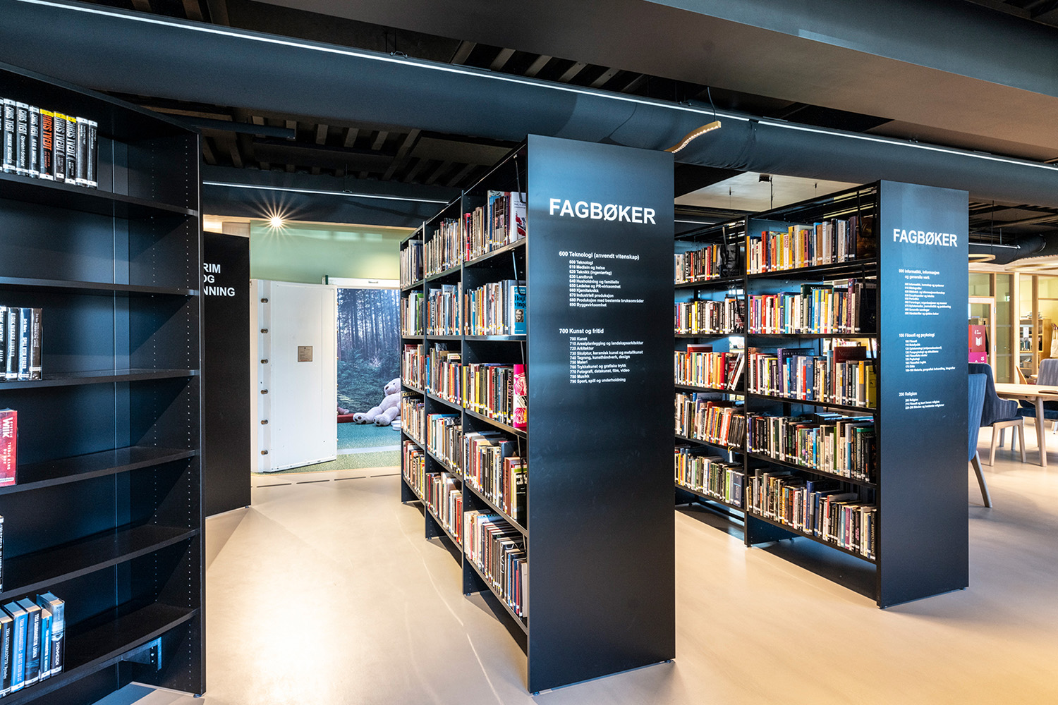 De sorte reoler midt i lokalet er leveret af BS Eurobib, men for at udnytte den høje loftshøjde er alle de lyse reoler langs væggene specialdesignet. Biblioteket er blevet et populært sted at sidde sammen med venner, spille spil, læse aviser, studere mv. Biblioteket har desuden udvidet åbningstiderne, så det nu også er muligt at besøge biblioteket i weekenden.