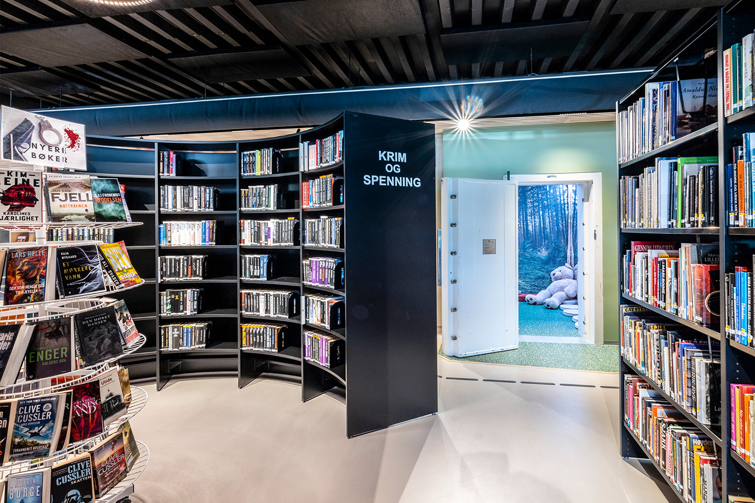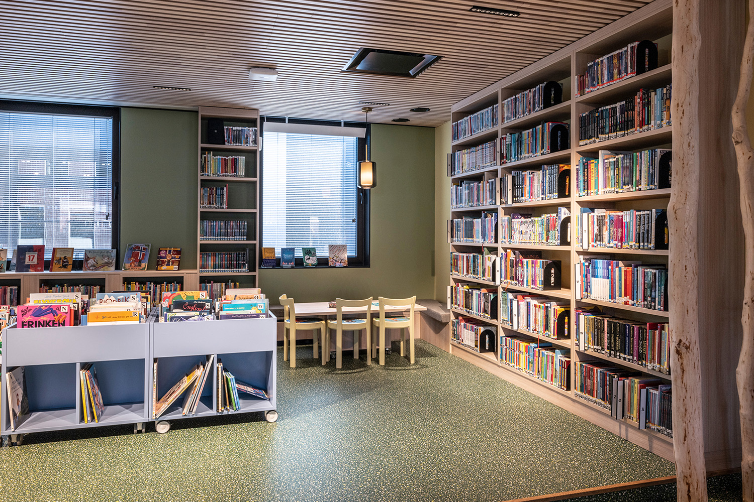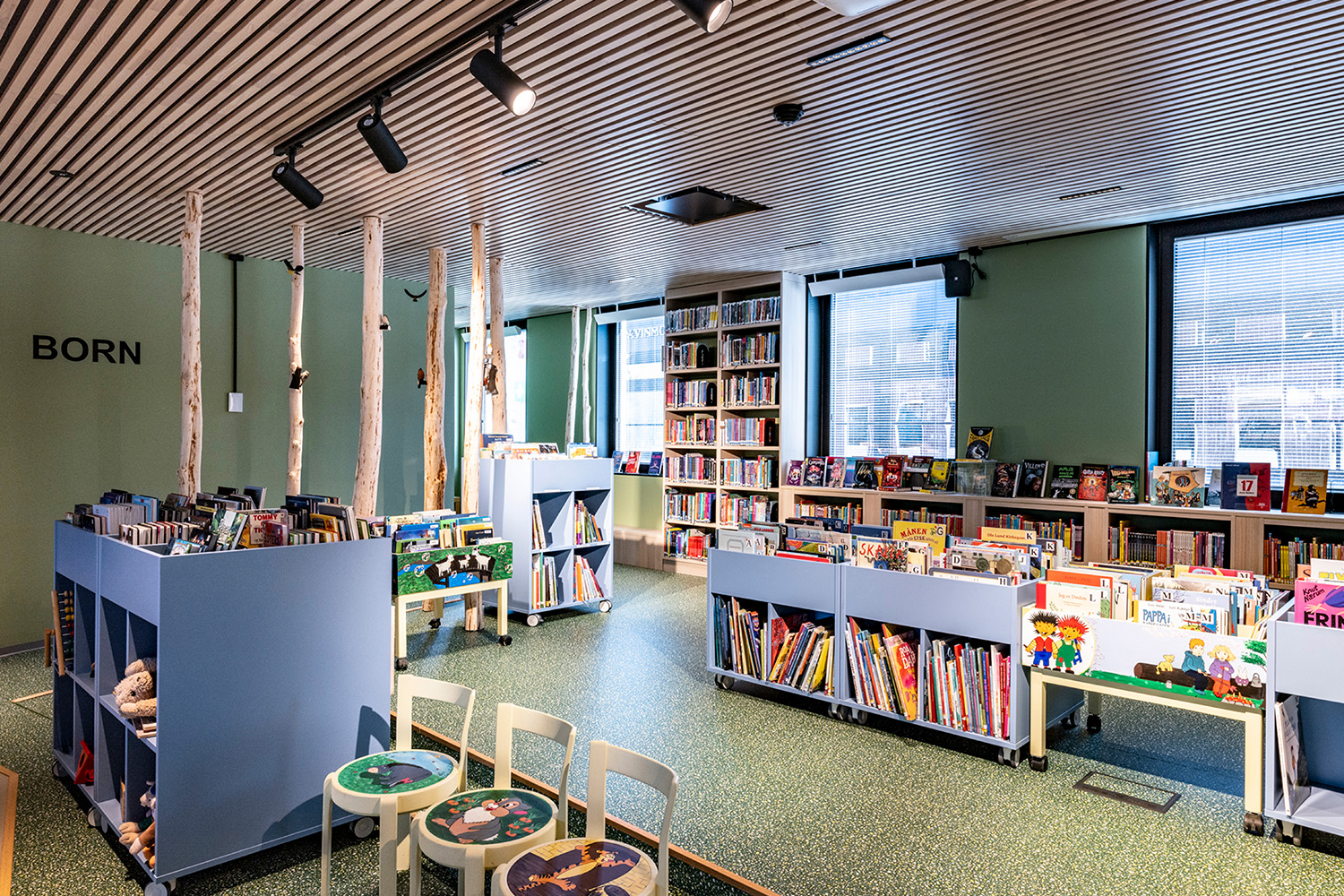Det norske indretningsteam hos BS Eurobib har beholdt det gamle bankhverv for at bevare lidt af bygningens historie. Det er nu blevet et hyggeligt læserum for børn og viderefører skovtemaet, som er den del af den øvrige børneafdeling.