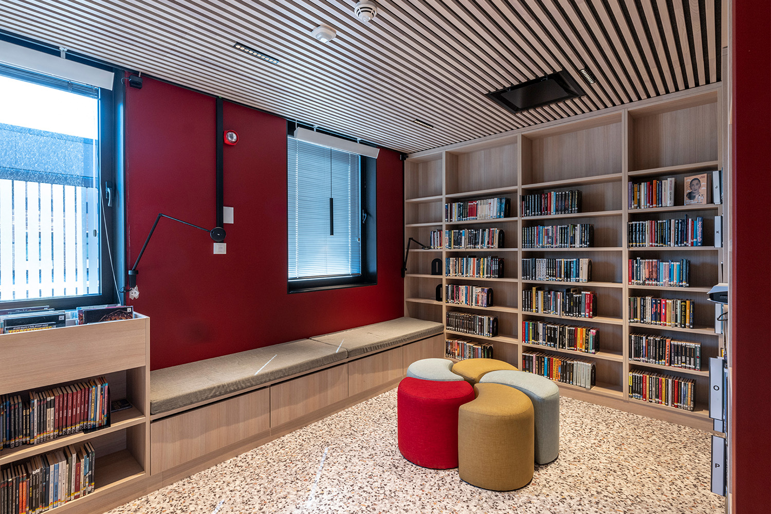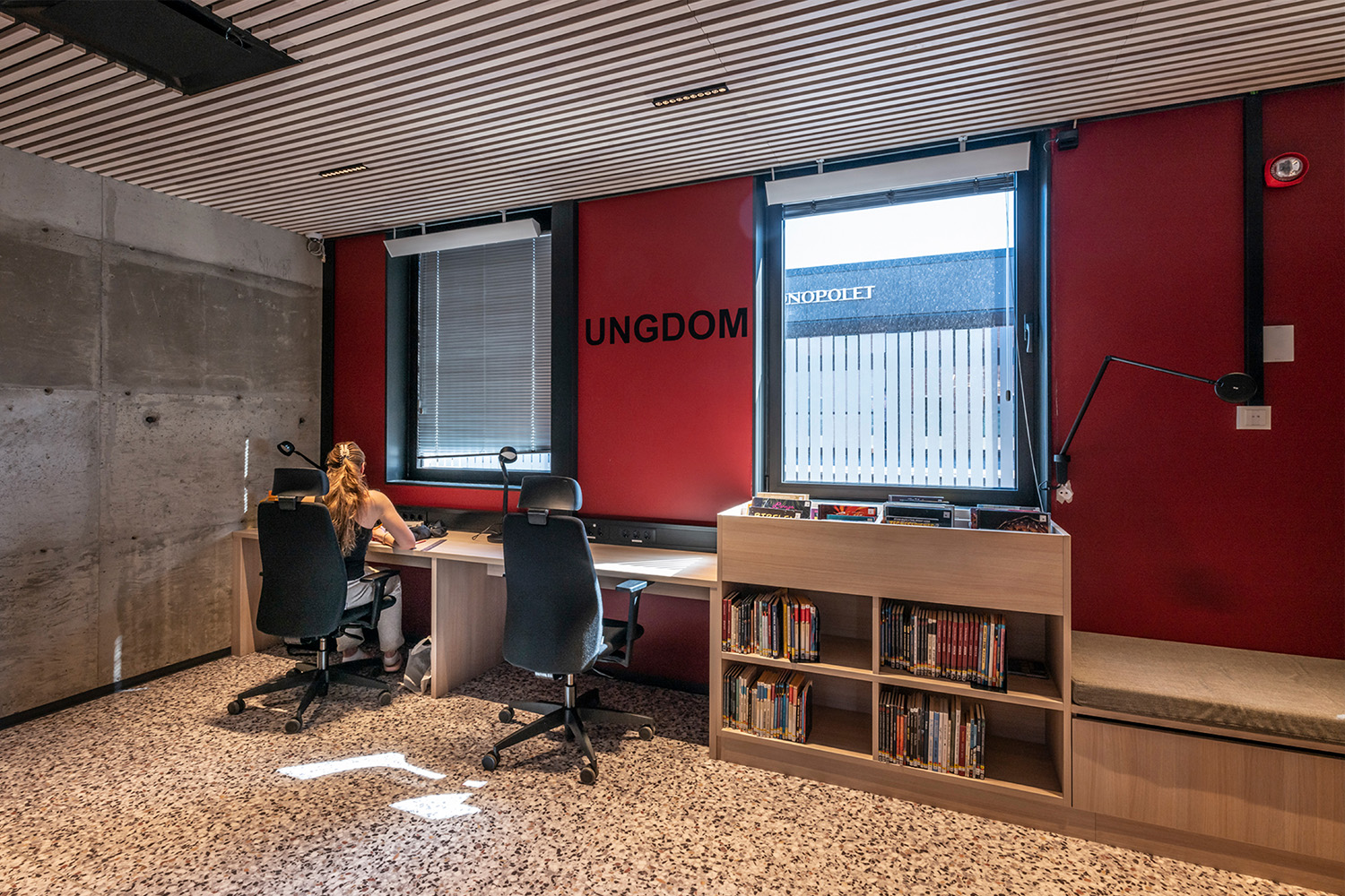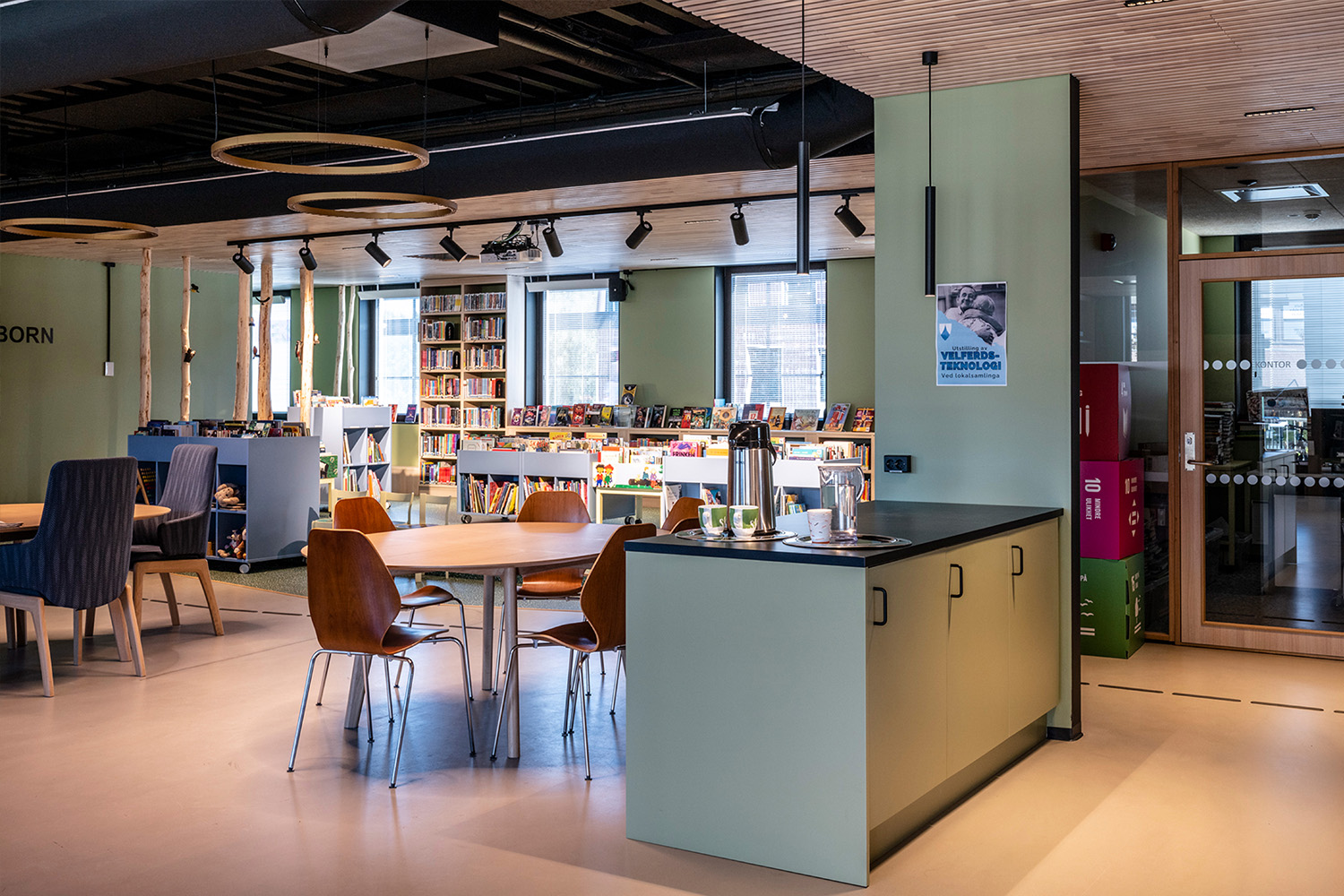 Det norske indretningsteam hos BS Eurobib har beholdt det gamle bankhverv for at bevare lidt af bygningens historie. Det er nu blevet et hyggeligt læserum for børn og viderefører skovtemaet, som er den del af den øvrige børneafdeling.