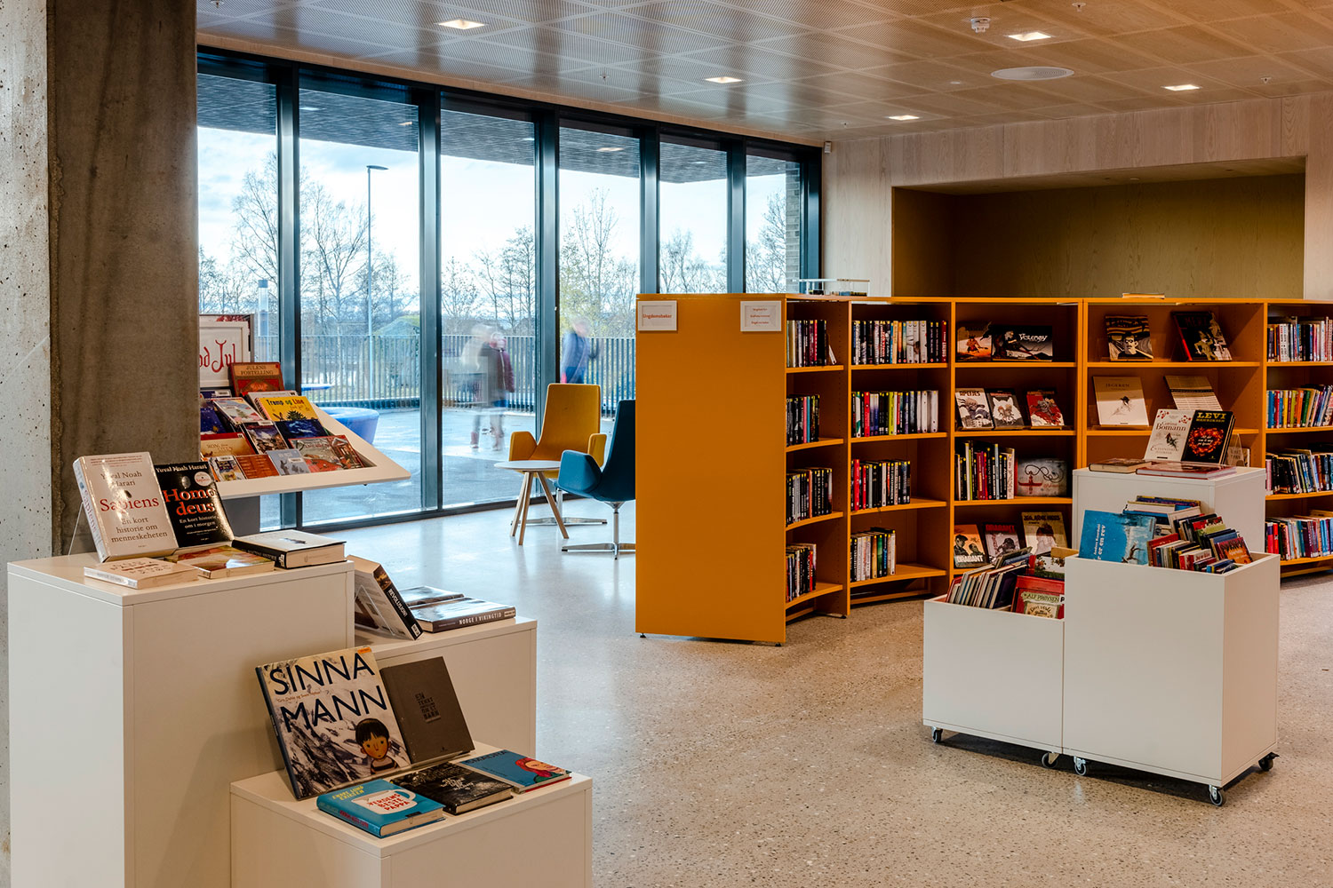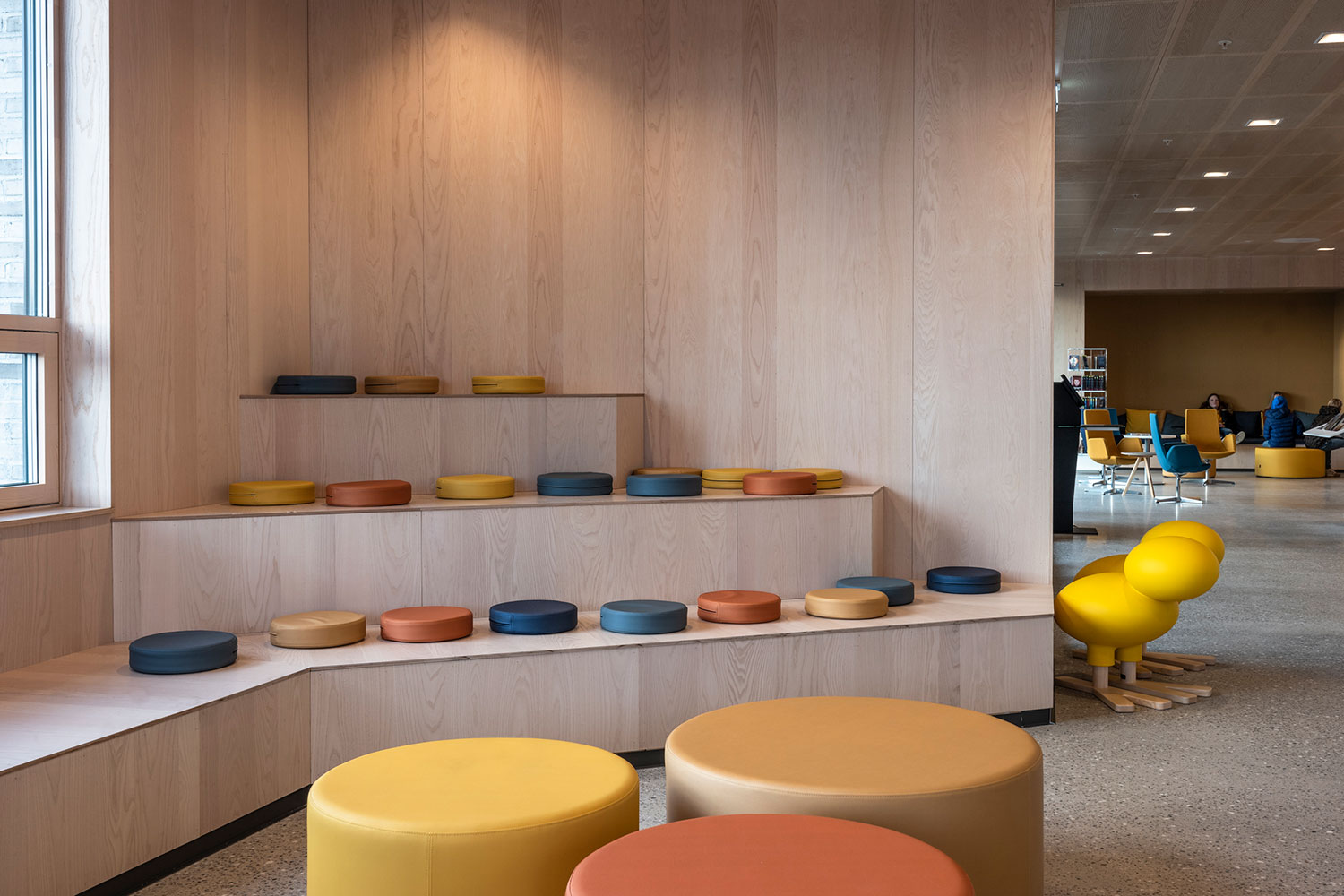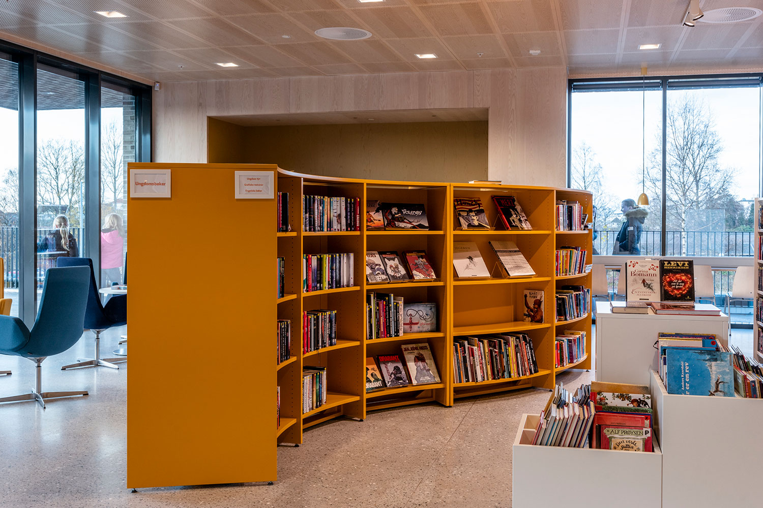 Organiske former på dele af inventaret giver sammen med varme interiørfarver biblioteksrummet et moderne og indbydende præg.