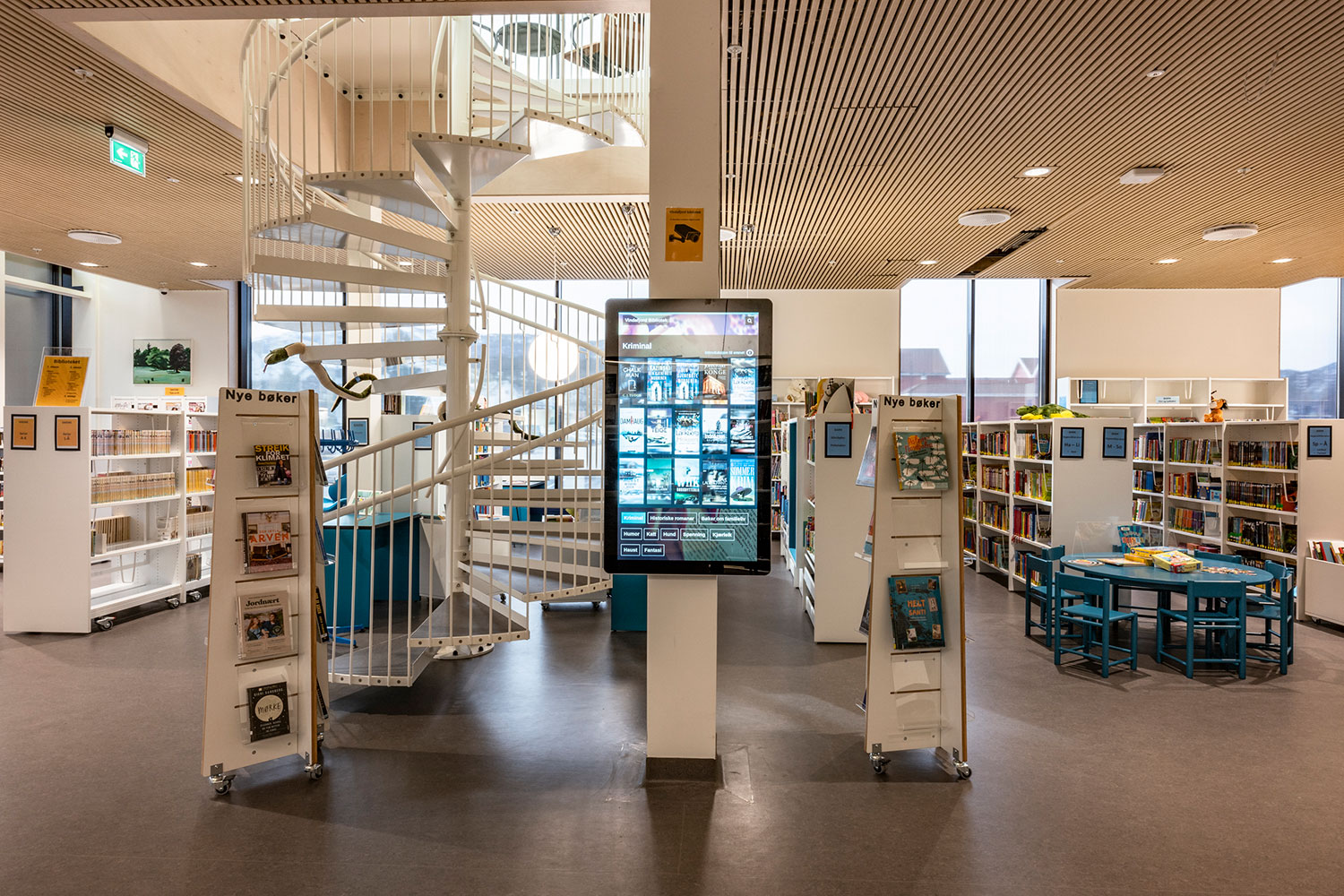 I børneafdelingen er der lave, fritstående reoler midt i rummet og højere reoler ved væggene. Det giver et luftigt udtryk og samtidig et godt overblik. Sammen med de mobile bogkrybber giver det børnene let adgang til bøgerne.