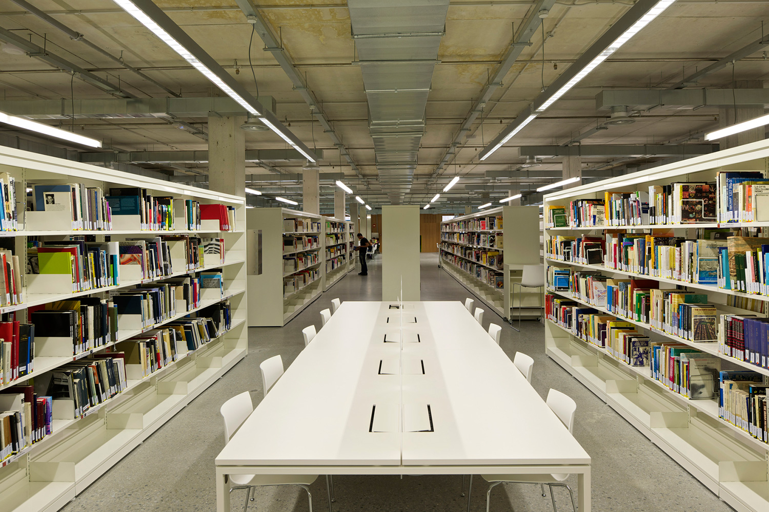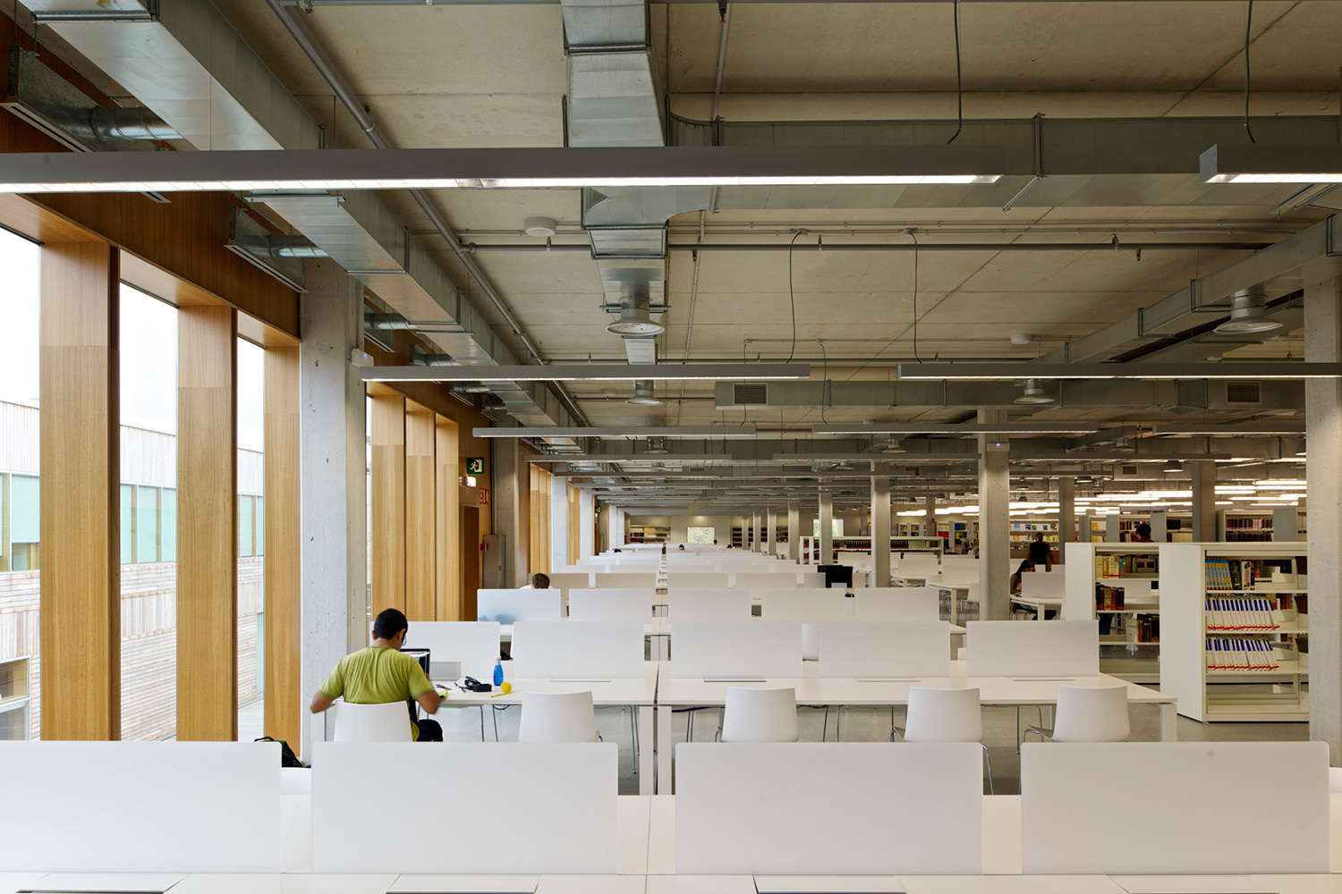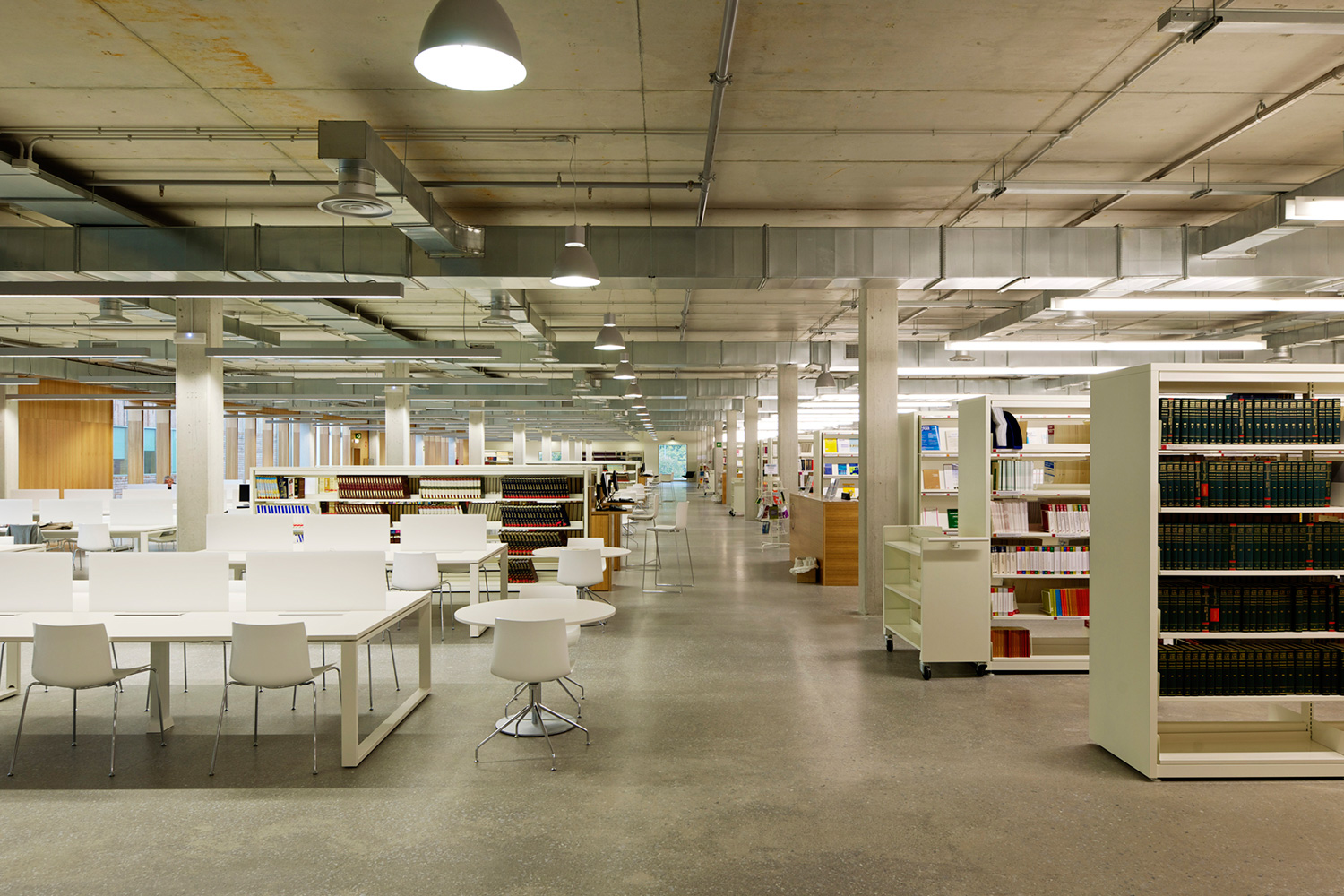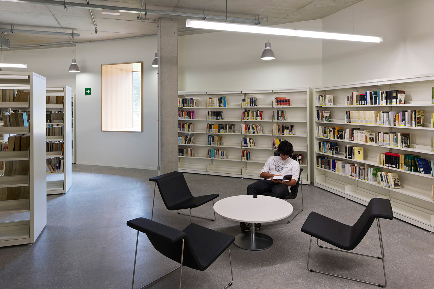 En gård separerer den to etagers høje bygning i to asymmetriske dele. Den store del rummer bibliotekets bogsamling. Den anden, mindre del, tilbyder læsesale og en forelæsningssal. BCI leverede 17.000 meter af 60/30 reolsystemet med 40 mm endepaneler og tophylder. Specialdesignede hvide bogrulleborde fuldender indretningskonceptet.