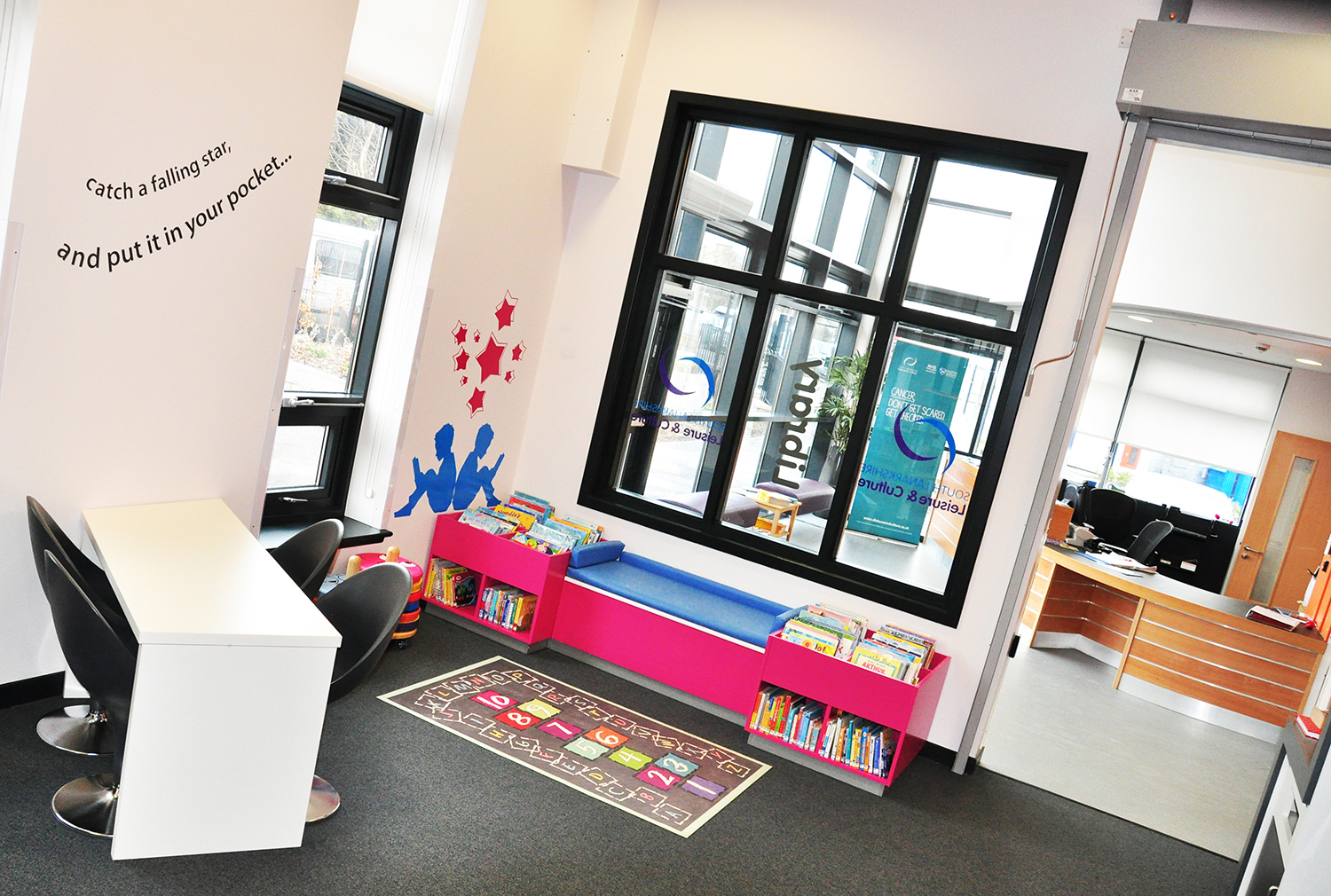 Synlig skiltning og poetisk grafik leverer et lyrisk bagtæppe, som resulterer i et teknologisk dynamisk og imødekommende bibliotek som befolkningen kan omfavne og nyde.