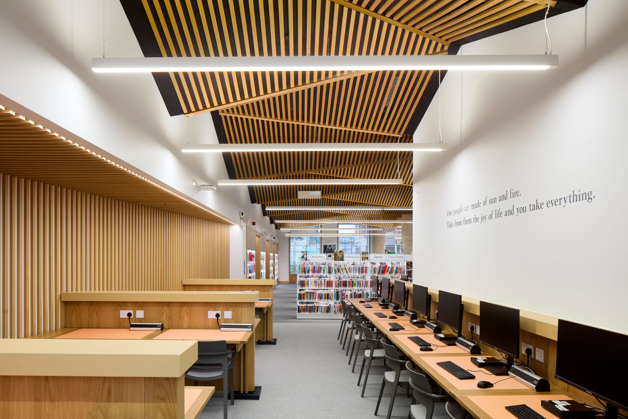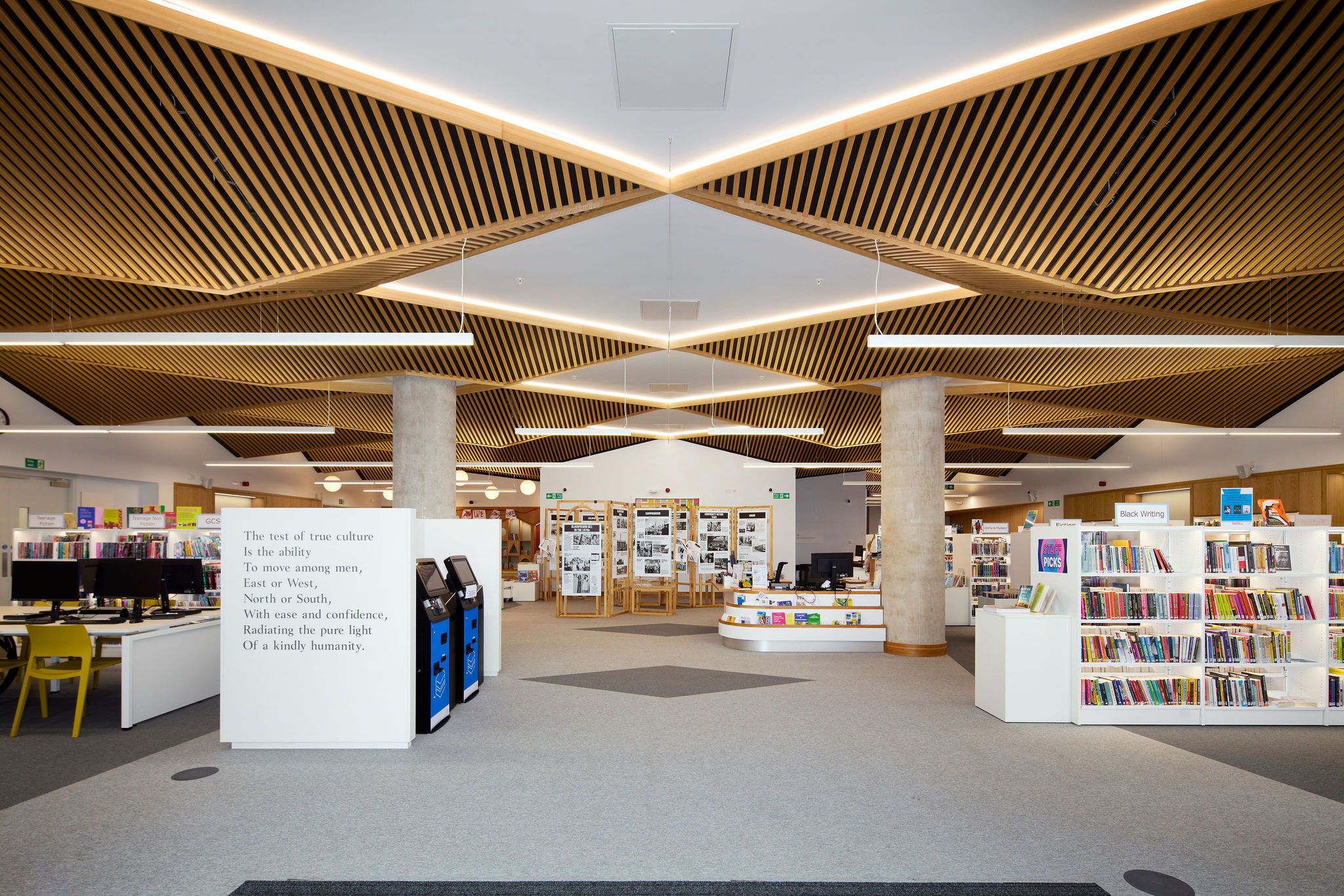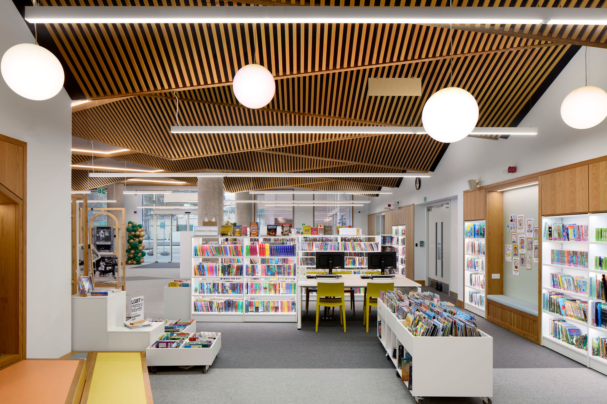 Biblioteket tilbyder traditionelle services som bog- og DVD-udlåning, aviser og tidsskrifter, adgang til pc’er, print- og kopi, mødelokaler, studiepladser, gratis Wi-Fi og en selvbetjent sundhedskiosk. Biblioteket inkluderer også et innovationsrum, der giver mulighed for at afprøve nye programmer og services.