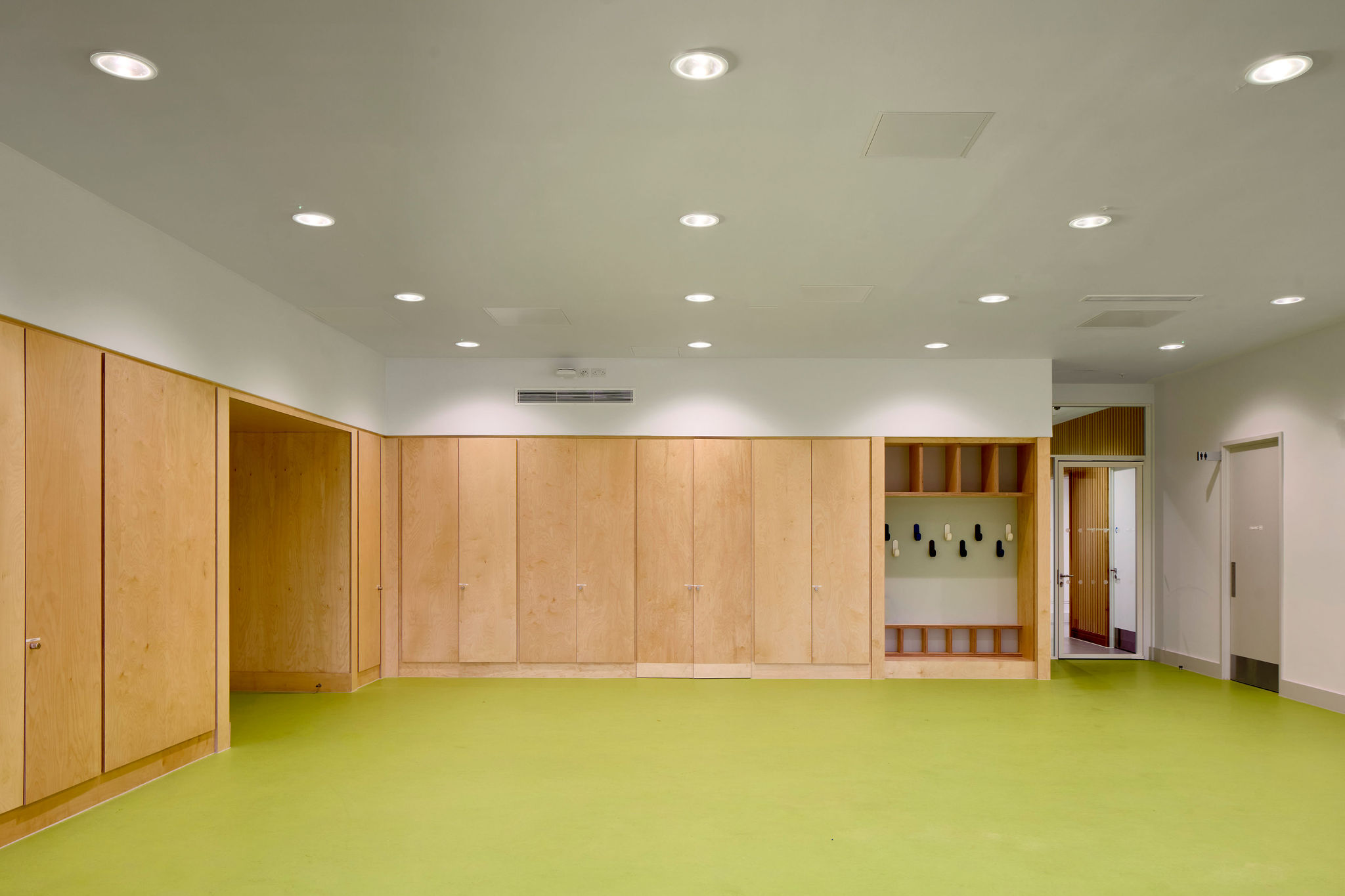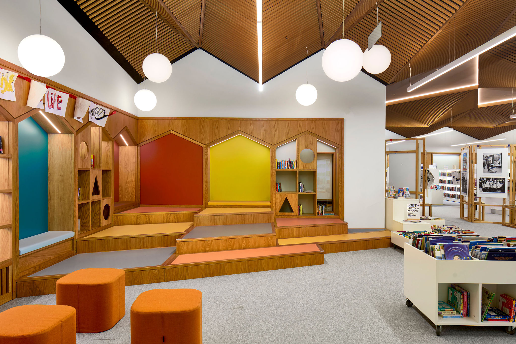 Biblioteket er placeret i stueplan i en bygning med boligarealer på de øvrige etager. Lokalerne kan tilgås via hovedbibliotekets indgang inden for normale åbningstider og via en separat indgang uden for åbningstiden. Biblioteket og fællesområderne vender ud mod en ny, offentlig plads på 198 kvadratmeter. Der er to mødelokaler i biblioteket og et aktivitetsrum, der bliver brugt til legerum om morgenen på hverdage. Aktivitetsrummet har træpaneler på væggene samt en slidstærk og vandafvisende gulvbelægning. Det er, sammen med mødelokalerne, udstyret med projektionsfaciliteter og åbner direkte ud til børnebiblioteket via skydedøre.