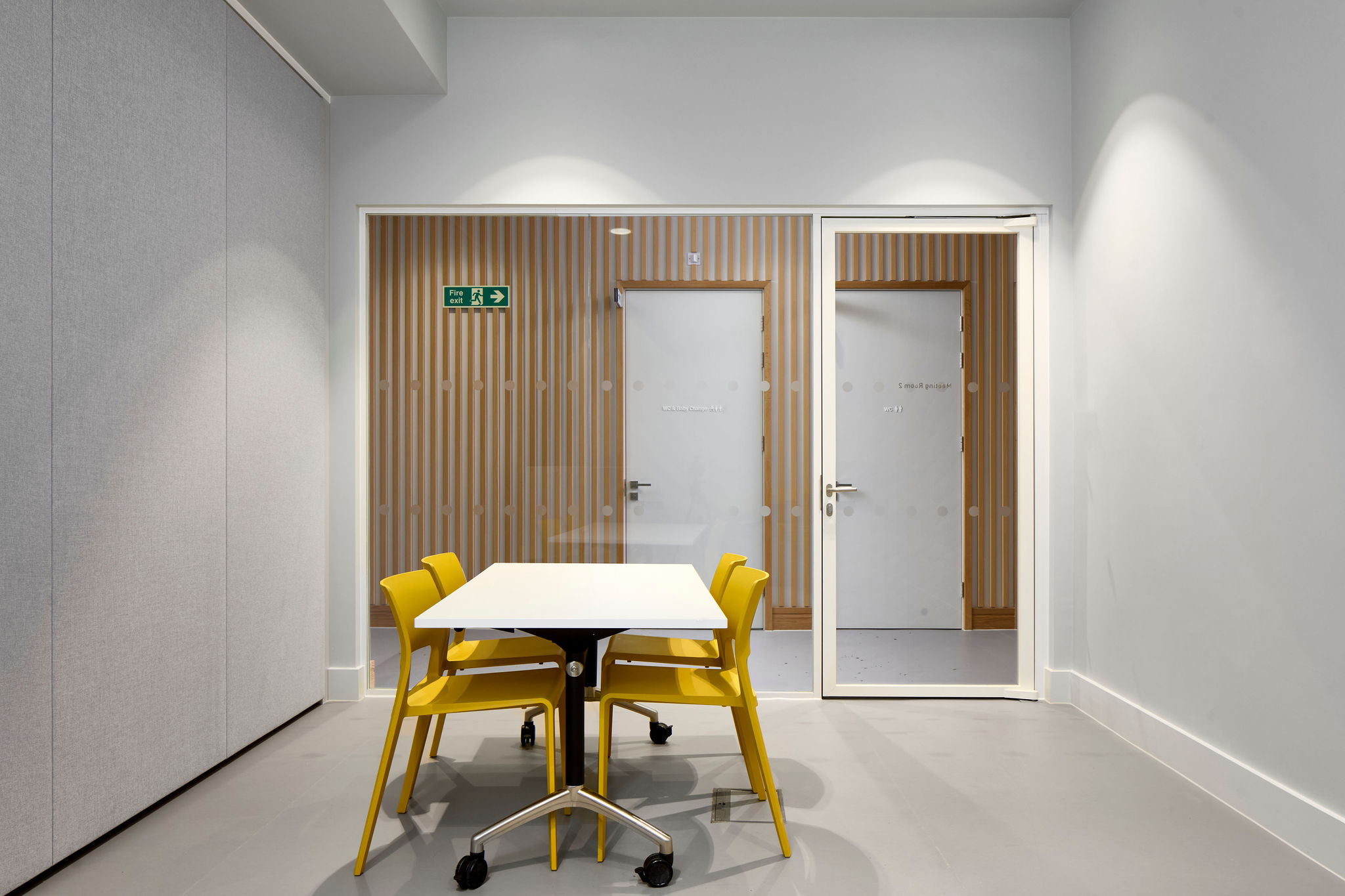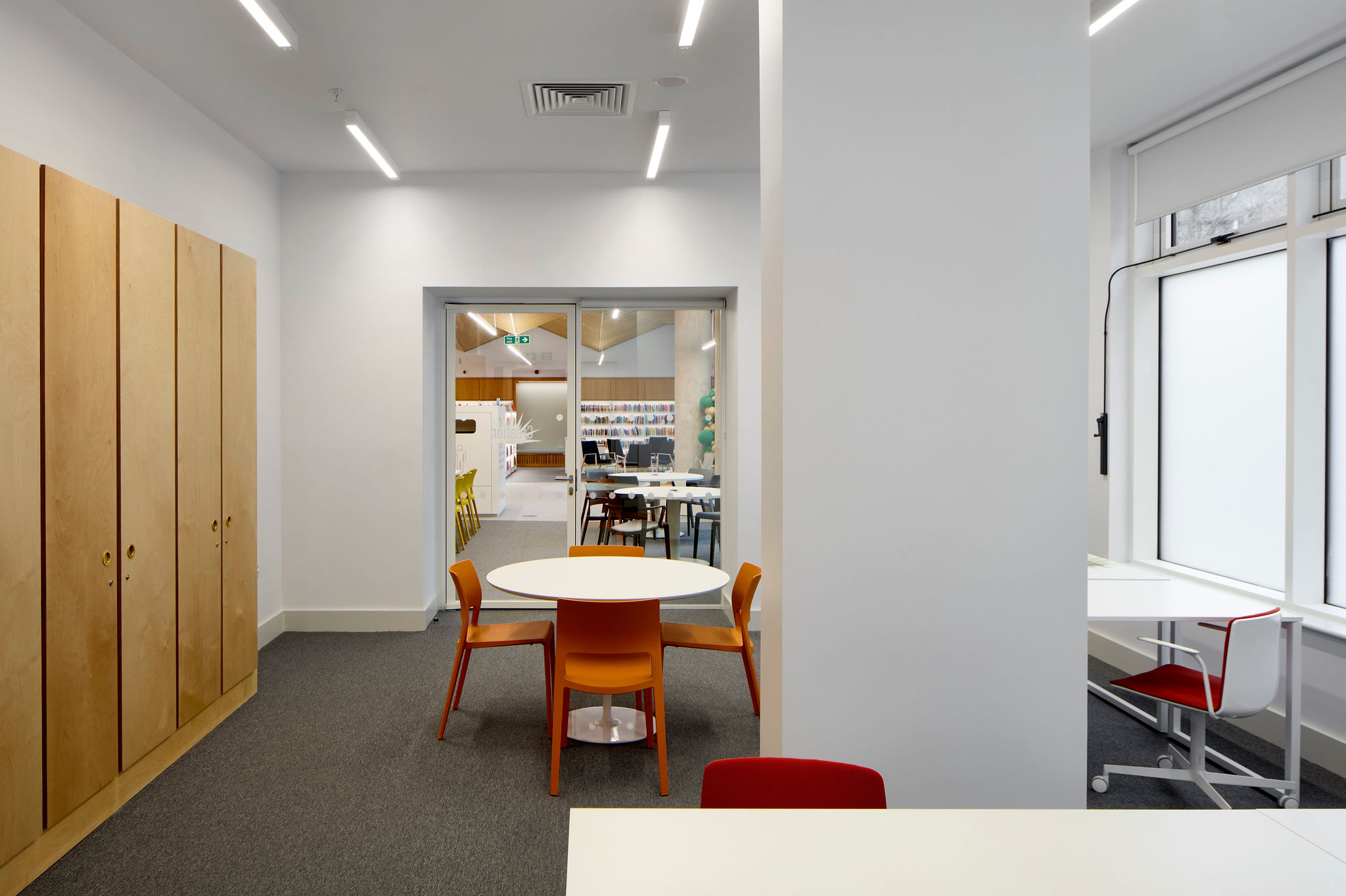 Biblioteket er fuldt tilgængeligt og nemt at komme rundt i, da det er placeret på den samme etage. Der er opbevaring til både store og små genstande, og det naturlige lys får rummet til at føles let og lyst.