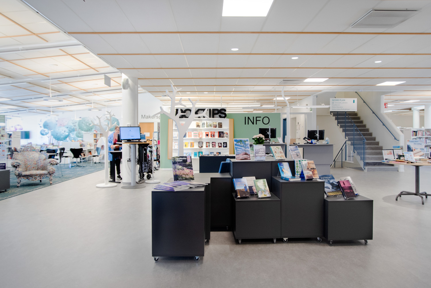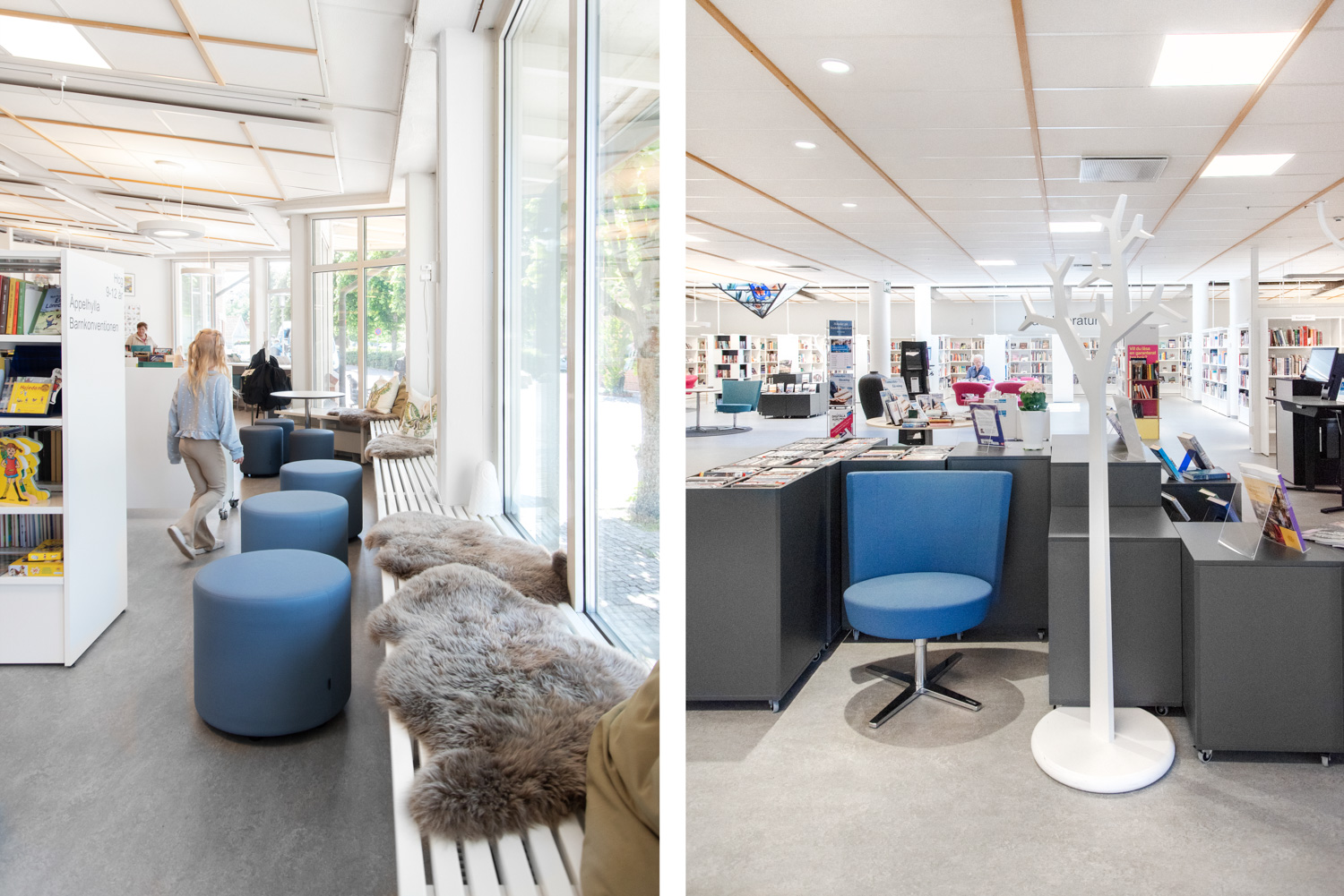 På Laholms Stadsbibliotek har kombinationen af genbrug og nyt inventar skabt en tidssvarende og imødekommende indretning, der fremhæver bygningens unikke kendetegn.