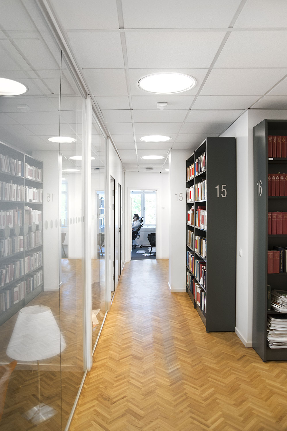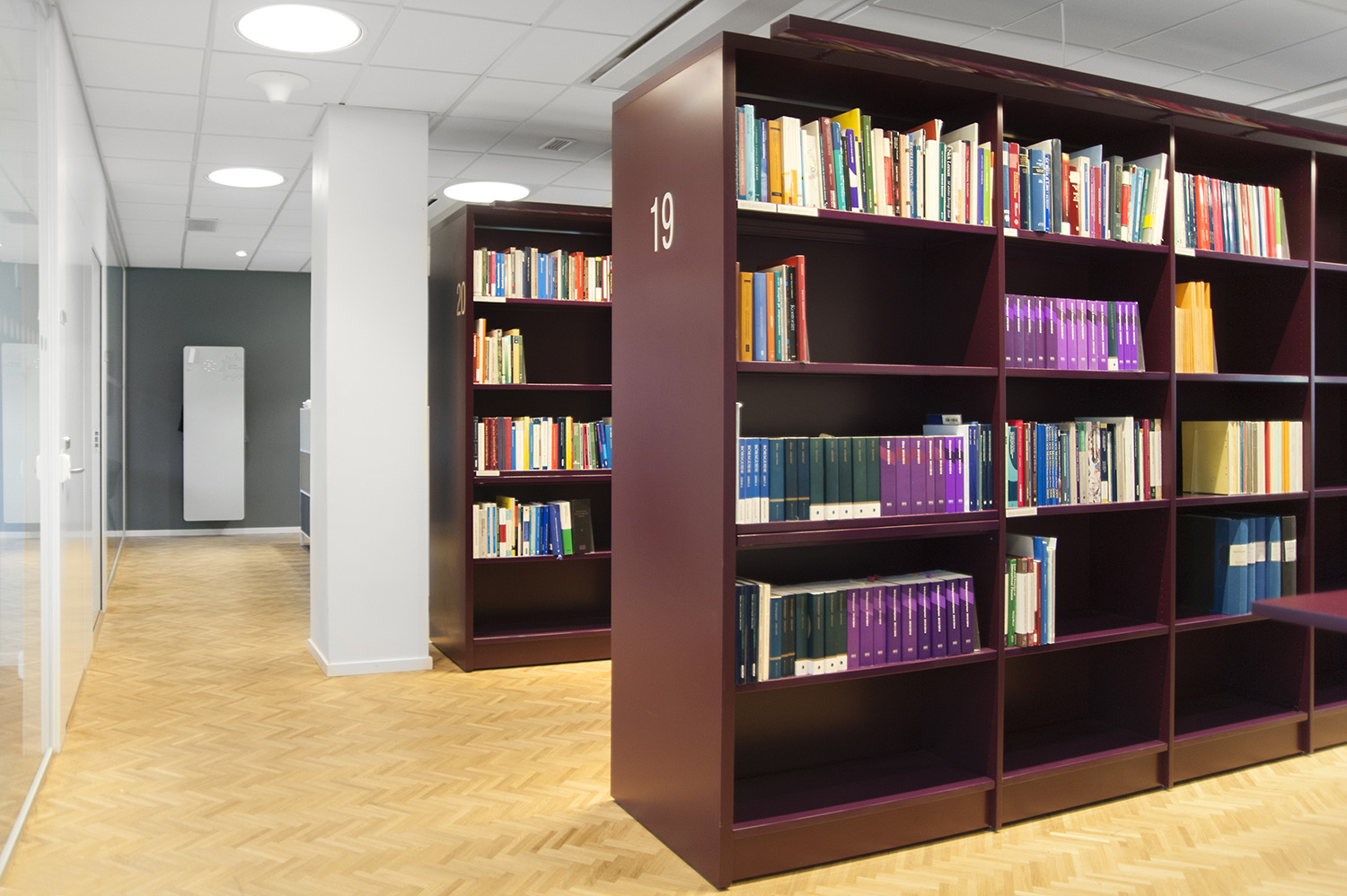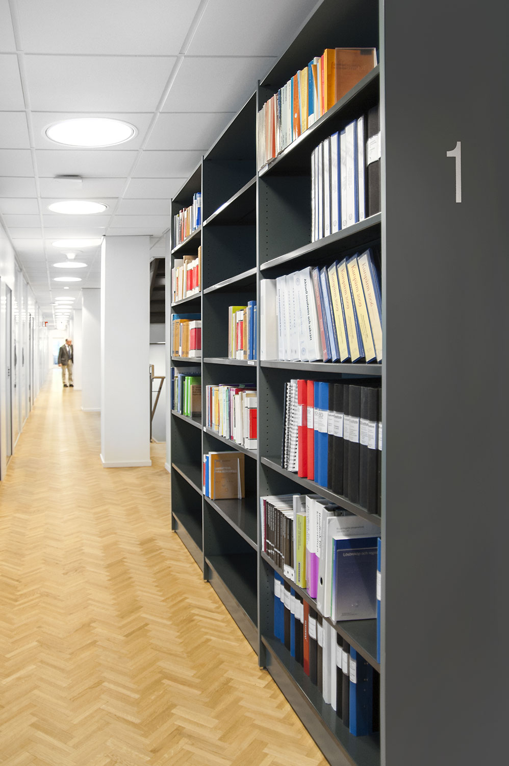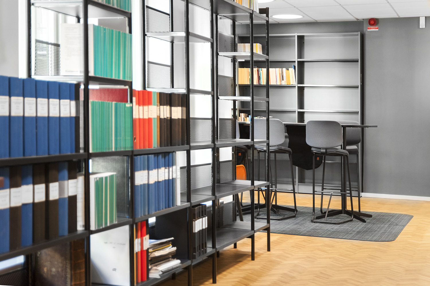Biblioteksdelen har til formål at tjene firmaets advokater og til dette formål er Frontline blevet valgt som fritsående reoler og vægreoler. Rondea reoler i grafitgrå er placeret foran vinduespartierne for at lukke den maksimale mængde lys ind i rummet samtidig med at opbevaring er mulig.