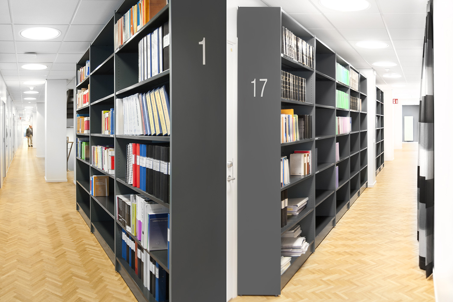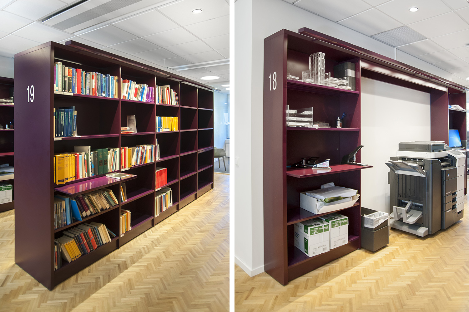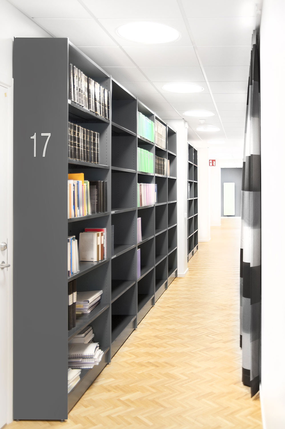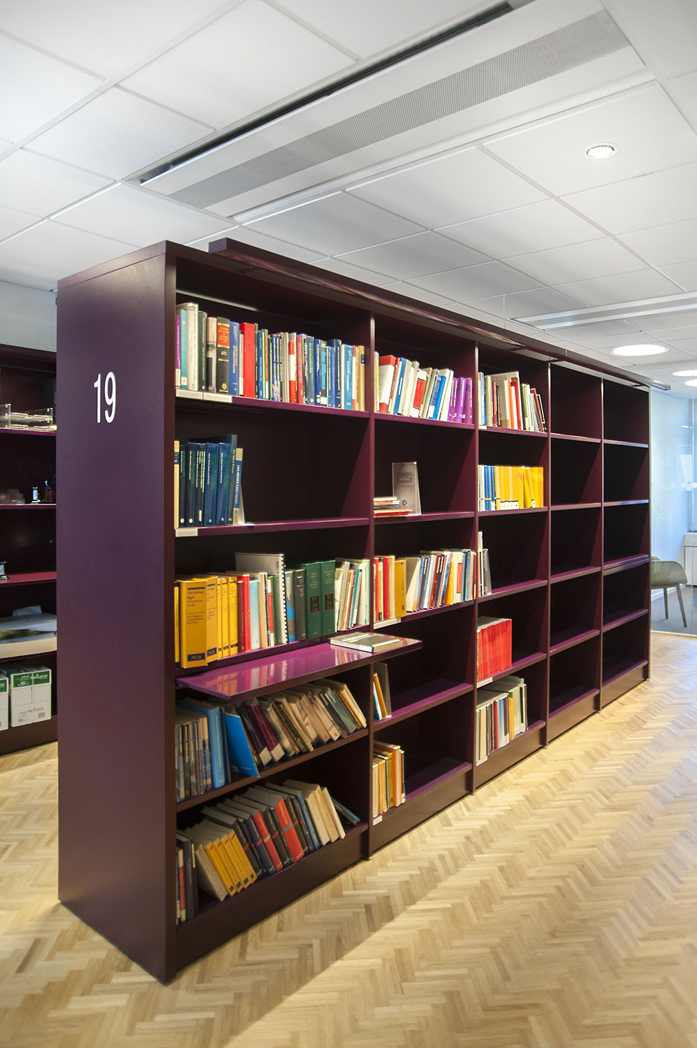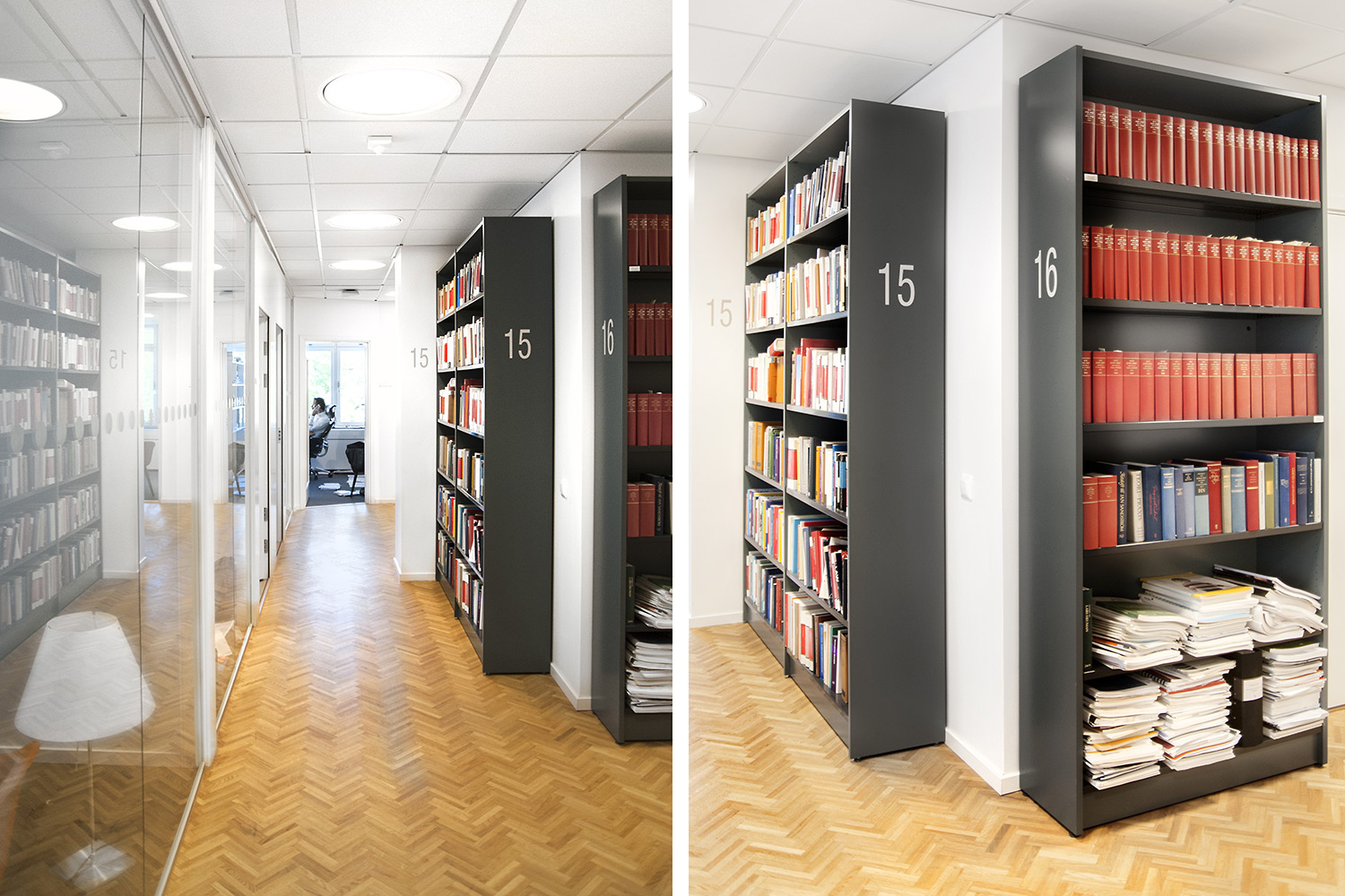 Biblioteksdelen har til formål at tjene firmaets advokater og til dette formål er Frontline blevet valgt som fritsående reoler og vægreoler. Rondea reoler i grafitgrå er placeret foran vinduespartierne for at lukke den maksimale mængde lys ind i rummet samtidig med at opbevaring er mulig.