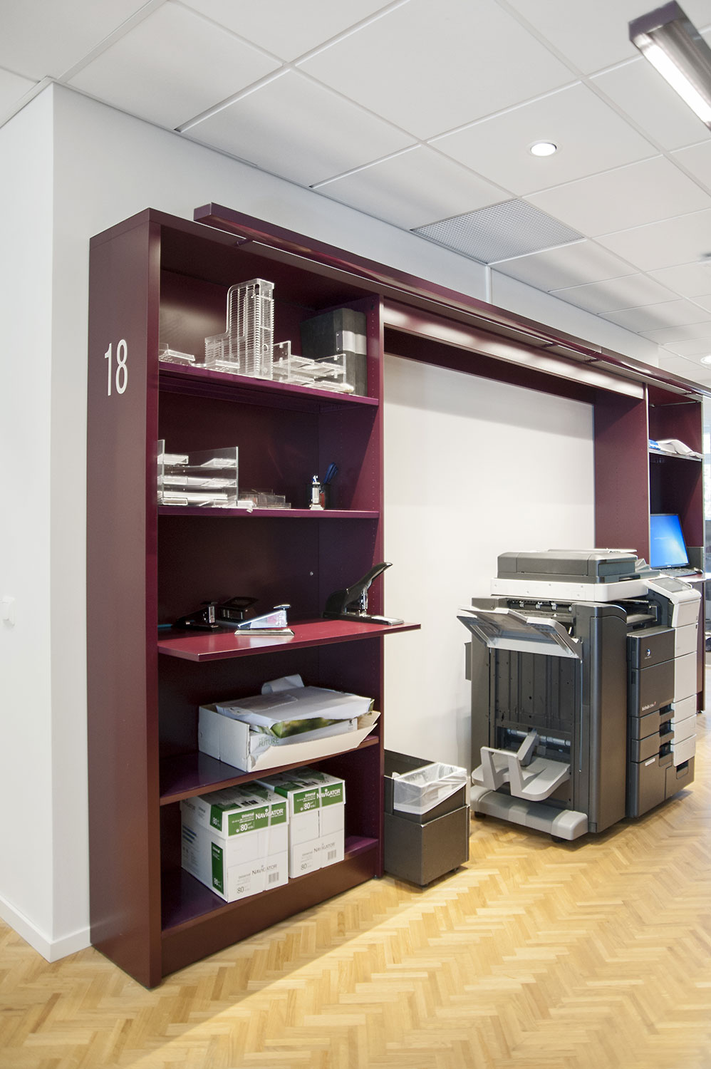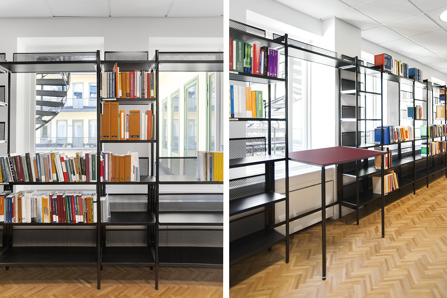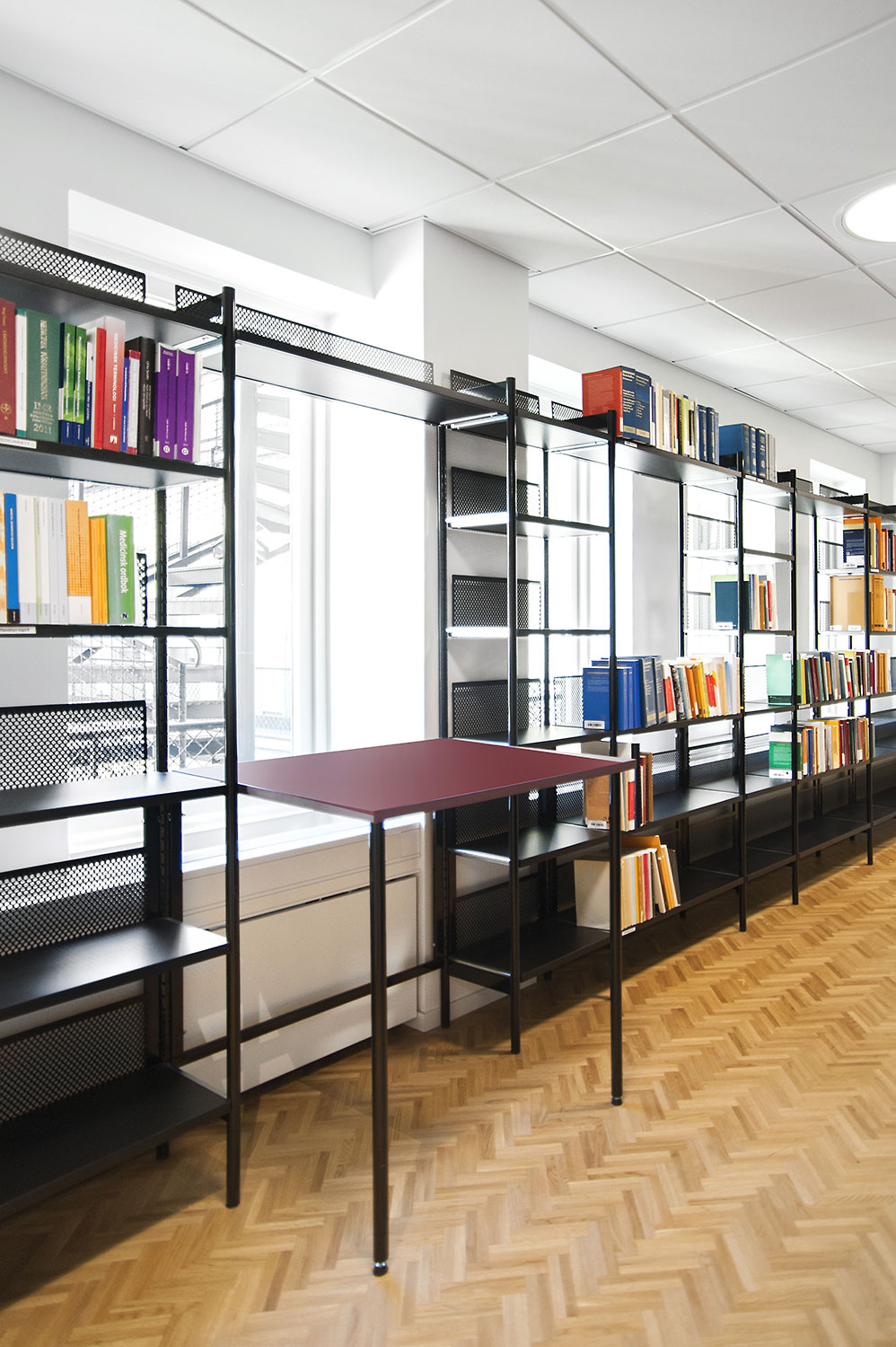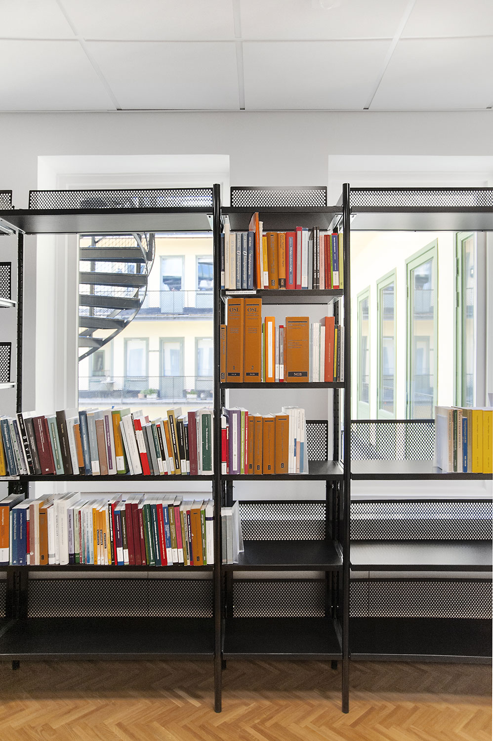 Biblioteksdelen har til formål at tjene firmaets advokater og til dette formål er Frontline blevet valgt som fritsående reoler og vægreoler. Rondea reoler i grafitgrå er placeret foran vinduespartierne for at lukke den maksimale mængde lys ind i rummet samtidig med at opbevaring er mulig.