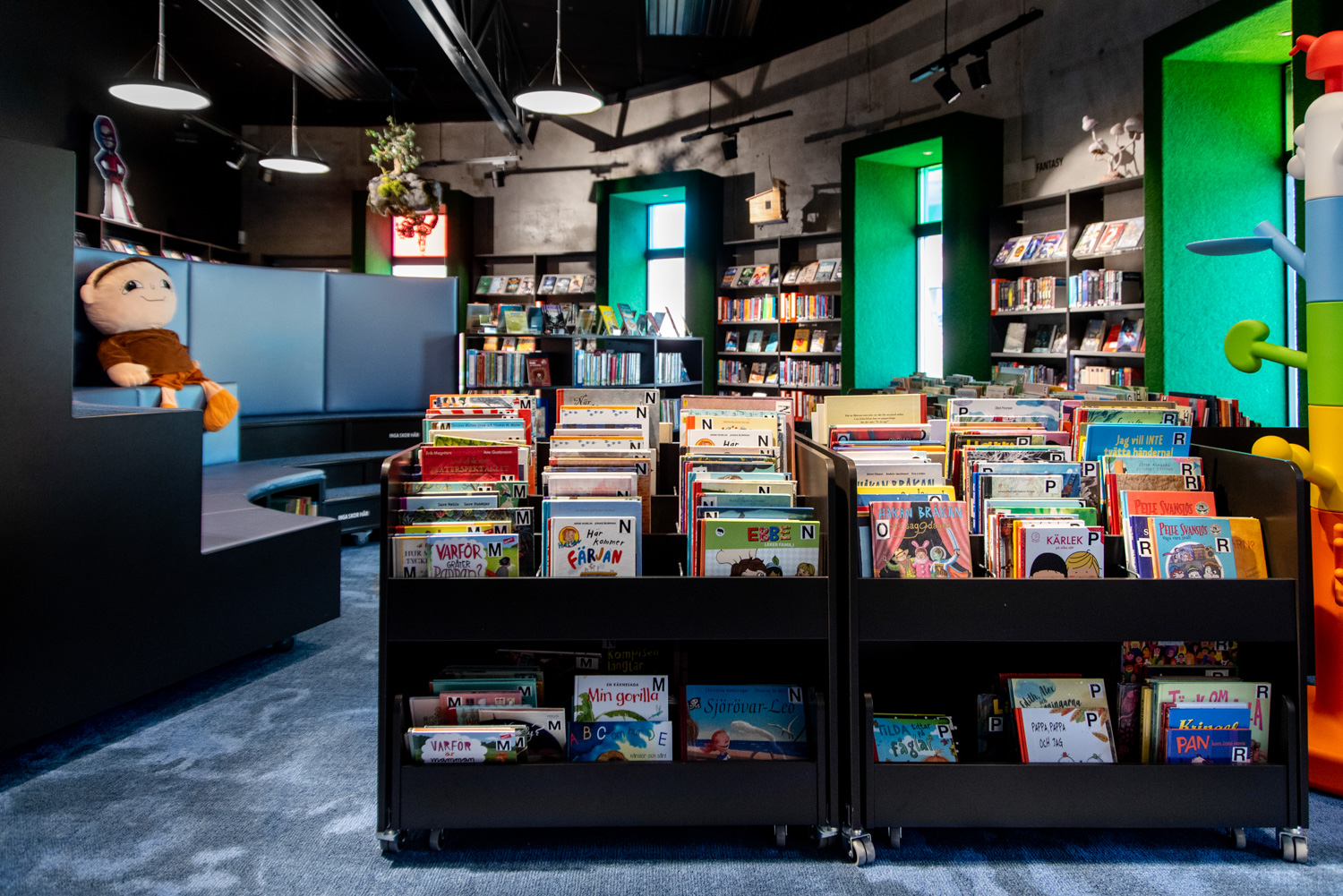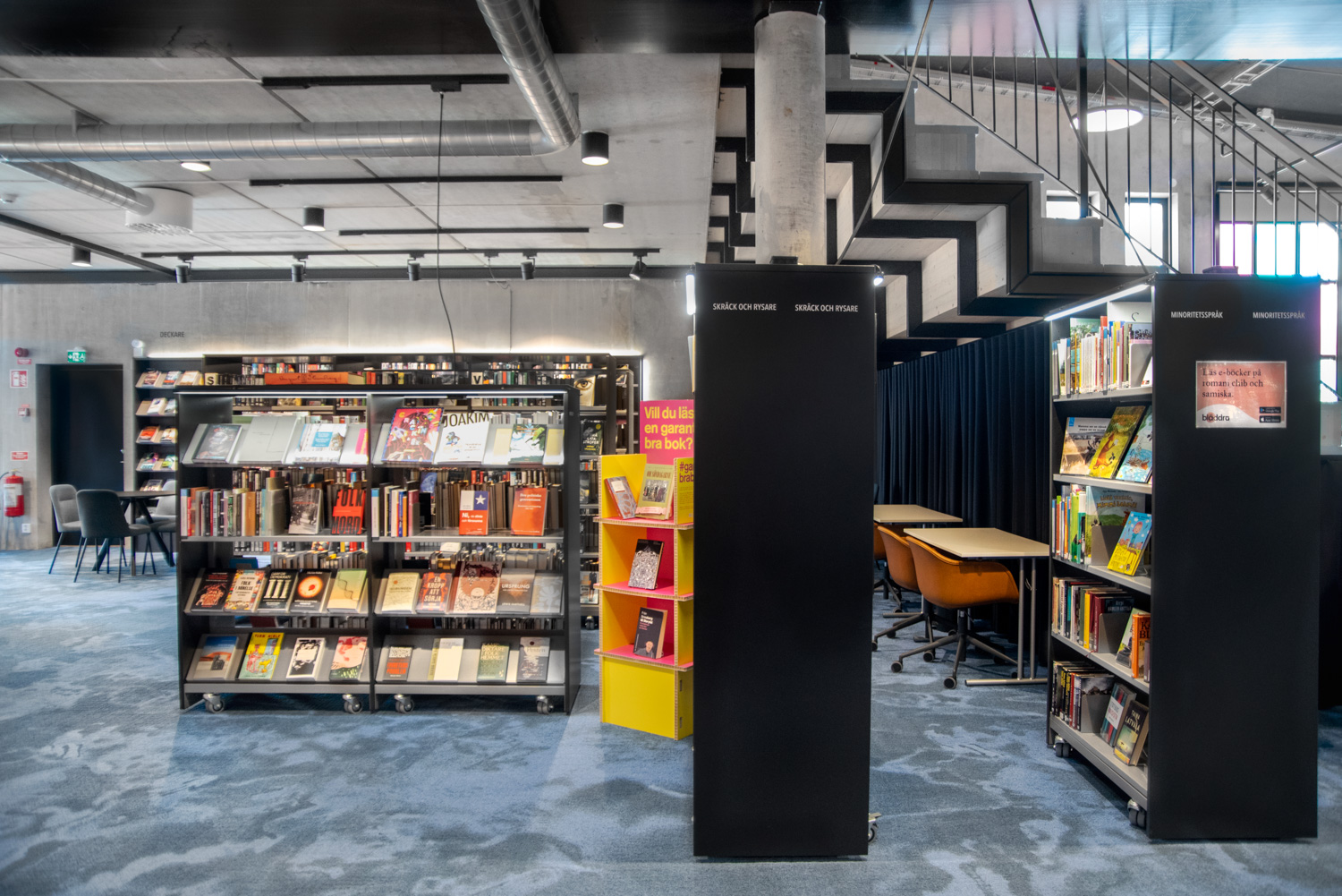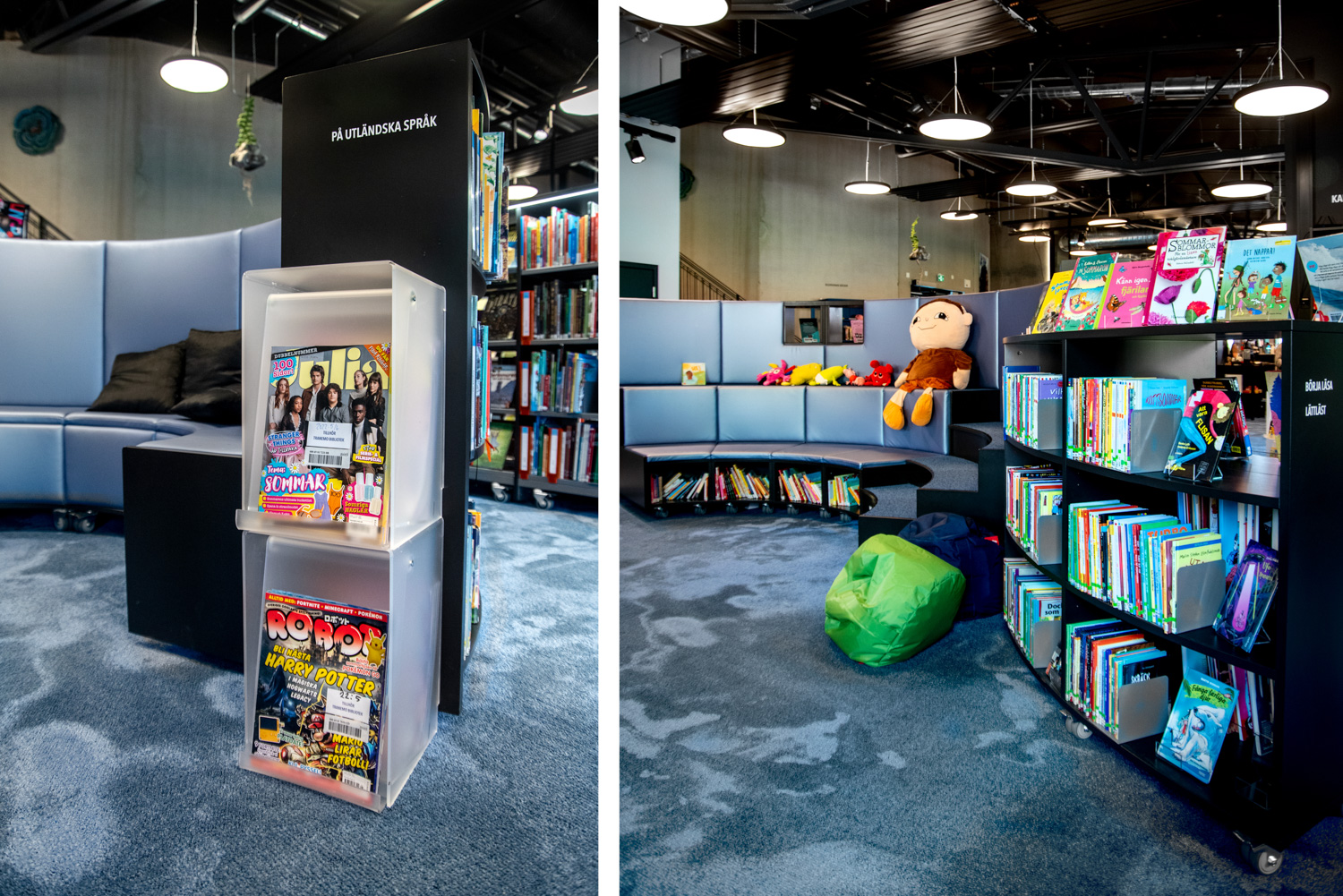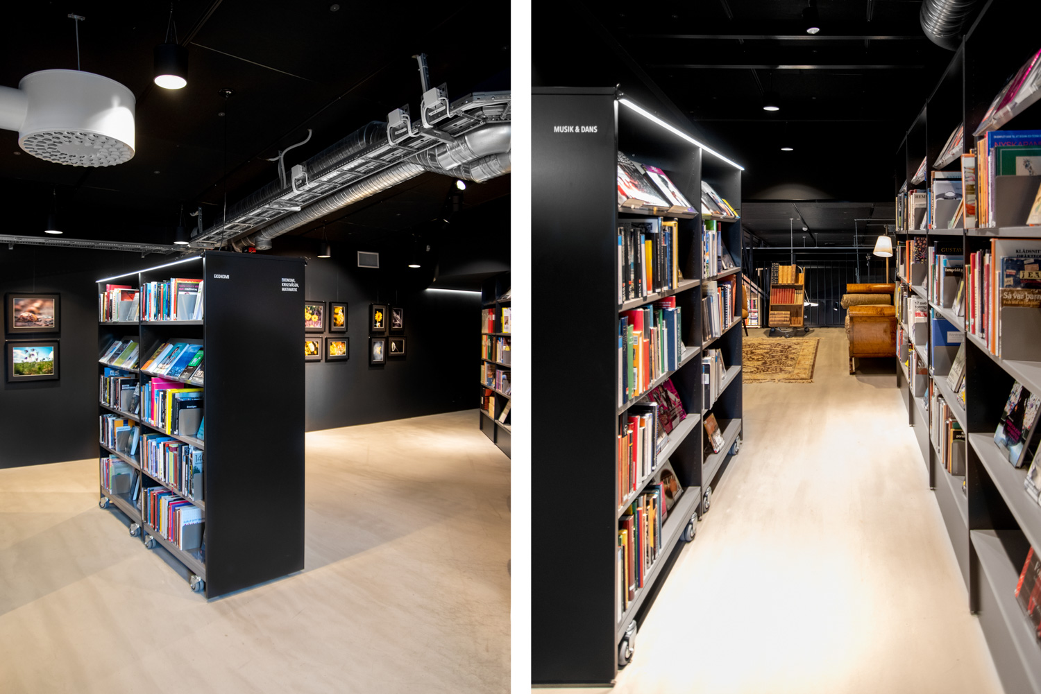 I samarbejde med Mikael og bibliotekschefen, Fredrike Holzhausen Henriksson, og hendes team, er bibliotekets indretningskoncept vokset frem til en unik og sammenhængende helhed med huset. ”Ord og vand” er en rød tråd i helhedskonceptet.