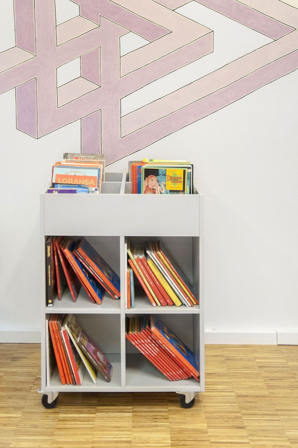 Alle Frontline reolsystemer er monteret med hjul for fleksibilitet og kan flyttes ved forelæsninger og kulturelle arrangementer. Ordup displayreol er perfekt placeret i biblioteket og gør indholdet let tilgængeligt, mens Info pods med integreret LED lys er placeret tæt på indgangen til information og hjælp fra personalet. Book Tower på hjul anvendes til fritstående udstilling af lydbøger.