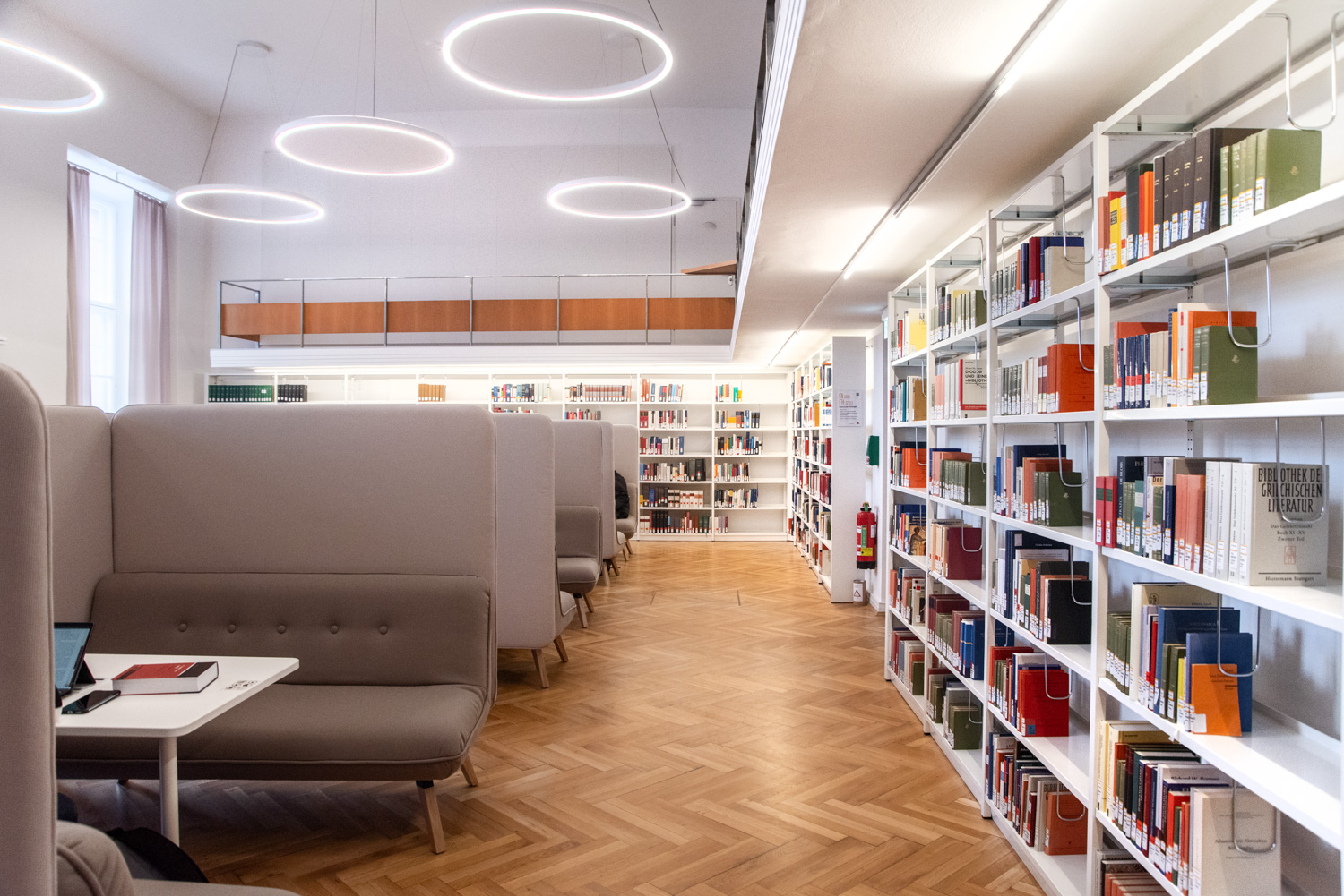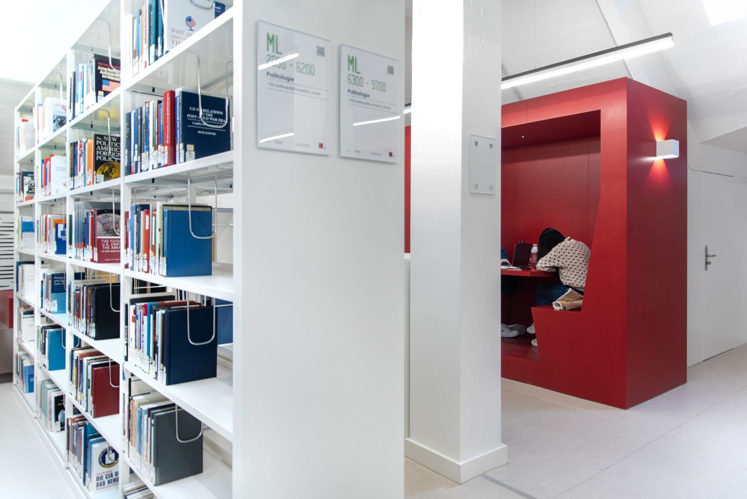 Biblioteket har flere inspirerende områder til uforstyrret studiearbejde, og når blikket vandrer, findes der konstant nye perspektiver.