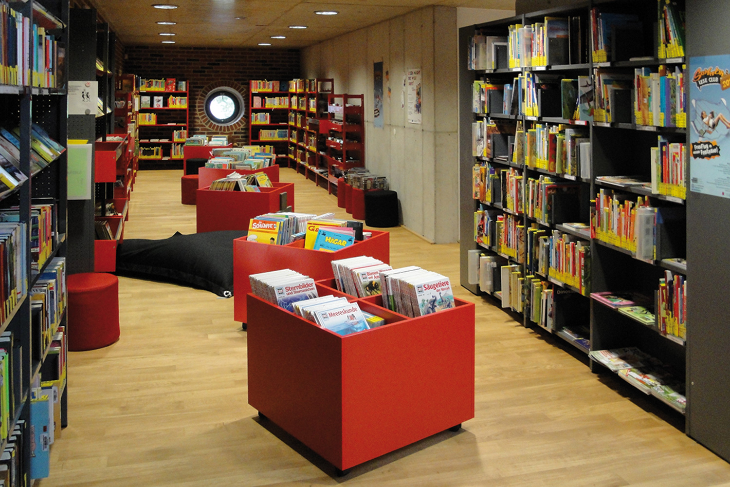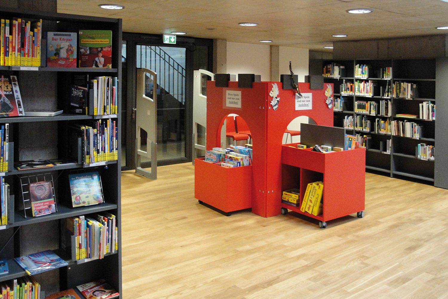 Biblioteket tilbyder et omfattende medietilbud passende til børnenes alder og yderligere programmer til at fremme læsning, klasserundvisning og arrangementer for børn, og er derfor også interessant for børnehaver og skoler. De enkelte områder i biblioteket er fordelt på 2 etager, som er tilgængelig via trappe og elevator.