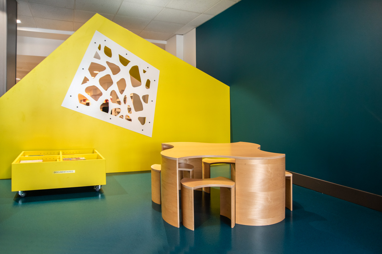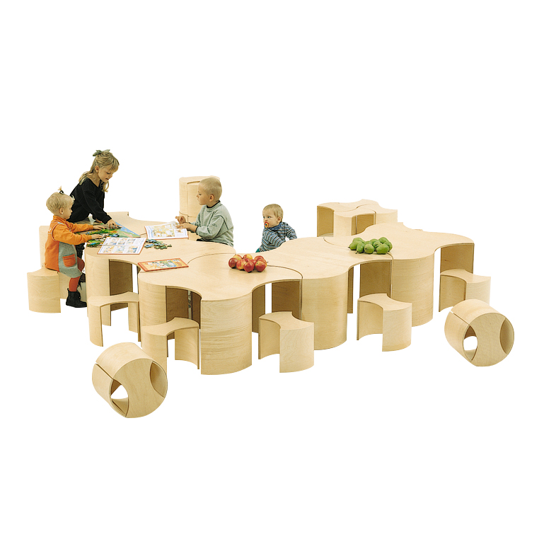 Puzzle er lige så meget en møbelgruppe som et legeredskab skabt til børn på børns præmisser. Formen er lige så enkel som genial, hvor både elementerne og konstruktionen danner bord og skamler.