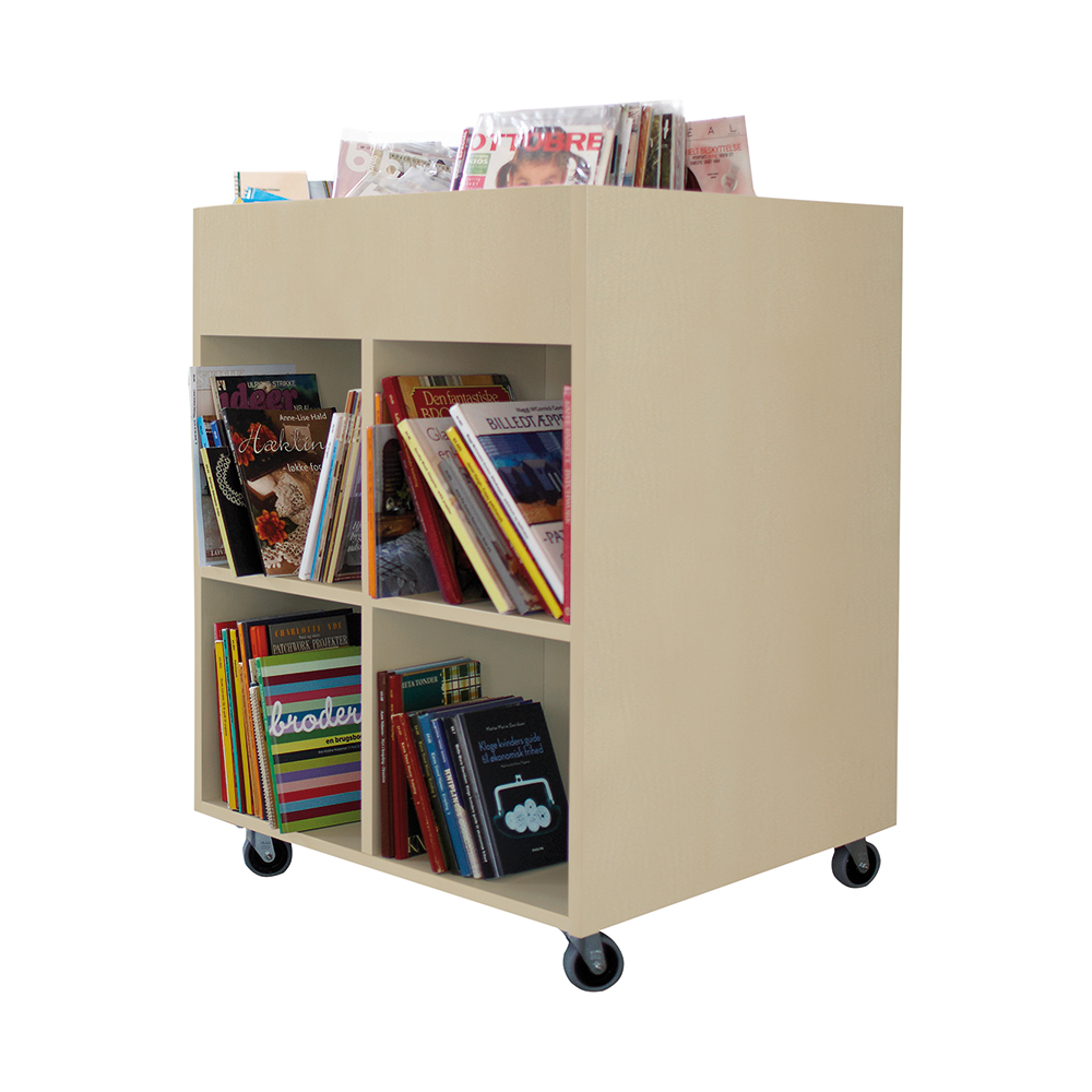 Sara Midi er en billedbogskrybbe med fire eksponeringsrum øverst og fire opbevaringsrum nederst. Ideel til børn.