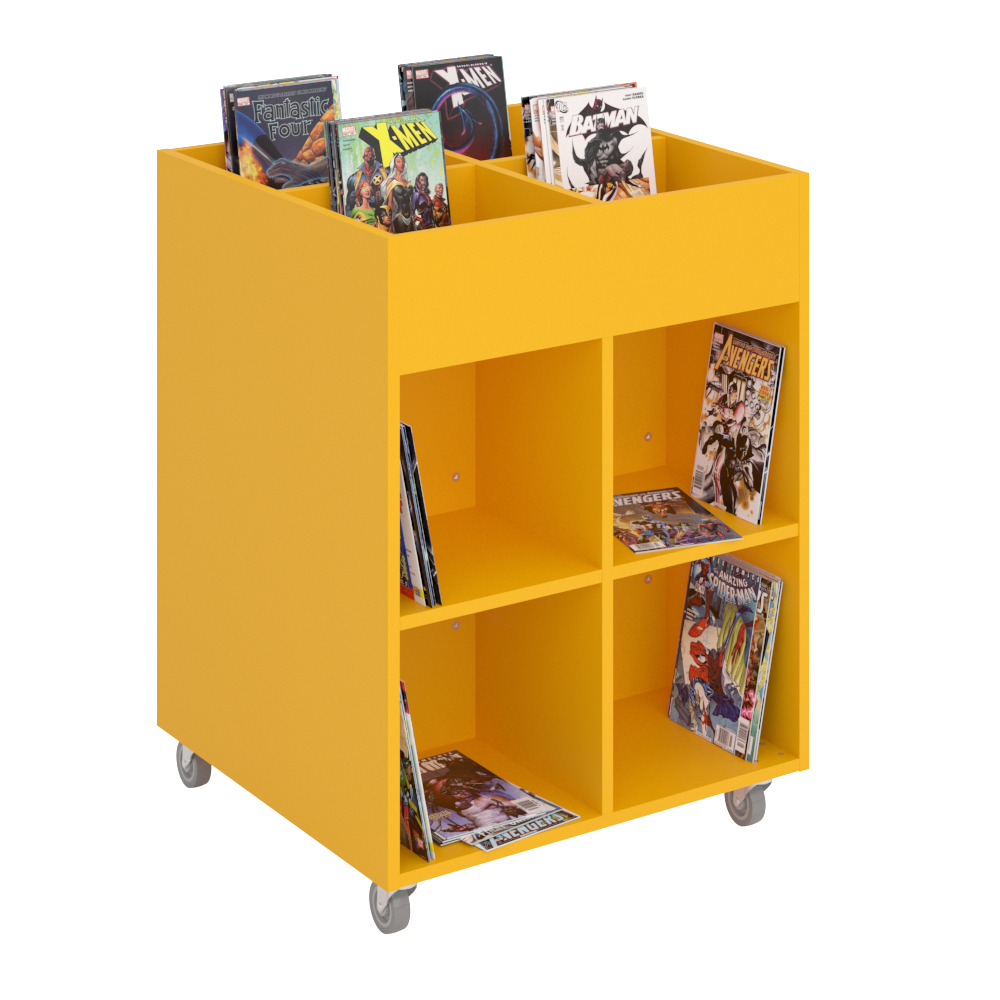 Sara Maxi er en billedbogskrybbe med fire eksponeringsrum øverst og otte opbevaringsrum nederst. Ideel til både børn og voksne.