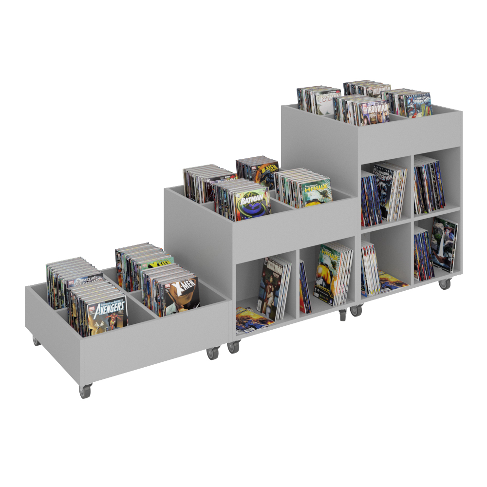 Sara er en serie af krybber i både kvadratisk og rund design og i 3 forskellige højder til fleksibel biblioteksindretning.
